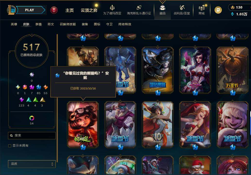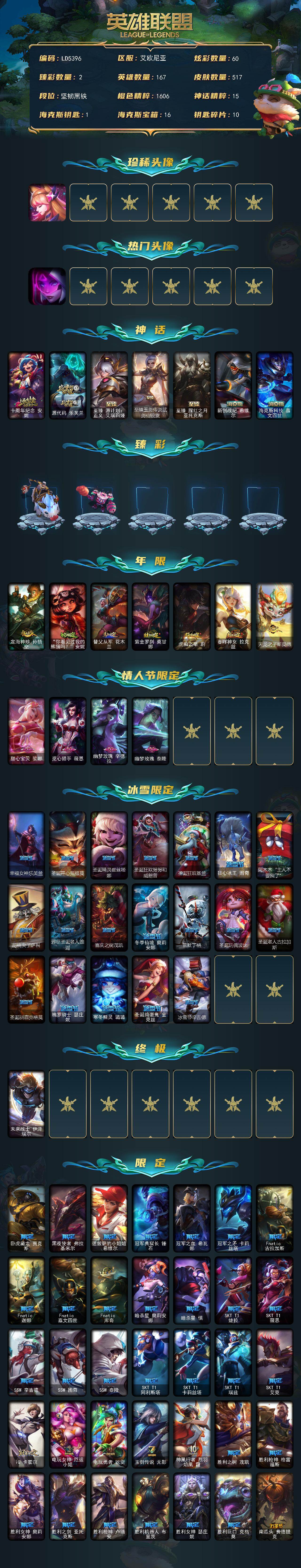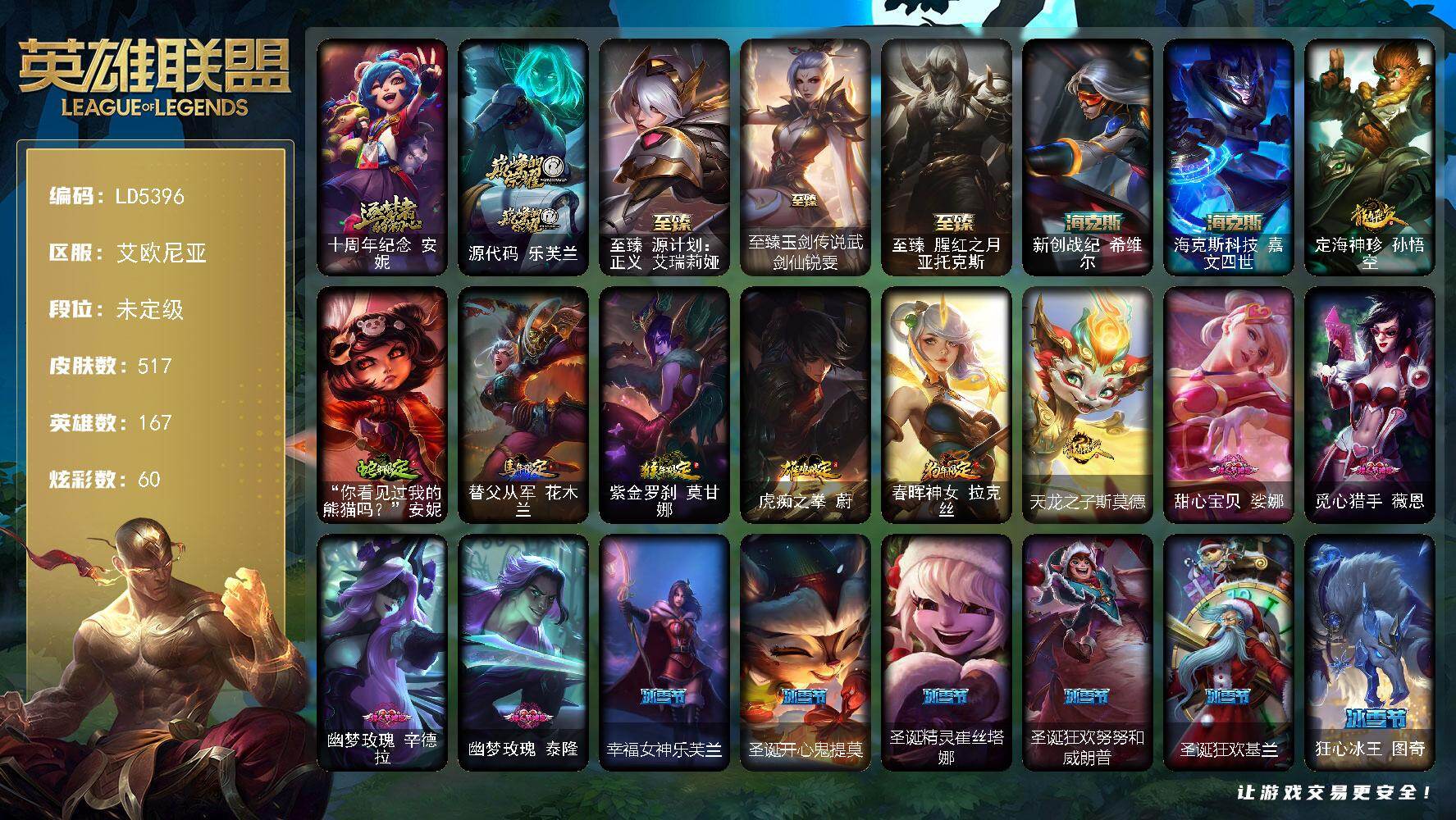 【632971】【LD5396】167英雄/517皮肤/1终极/7神话/86限定/2臻彩/60炫彩/56传说/124史诗/未定级账号等级:754/星守阿狸/源计划刀妹/十周年纪念安妮/源代码乐芙兰/至臻源计划:正义艾瑞莉娅/至臻玉剑传说武剑仙/至臻腥红之月亚托克斯/新创战纪希维尔/海克斯科技嘉文四世/无畏骑士瑟庄妮赤子初心/可爱可爱粉红红布里茨/定海神针孙悟空/“你看见过我的熊猫吗?”安妮/替父