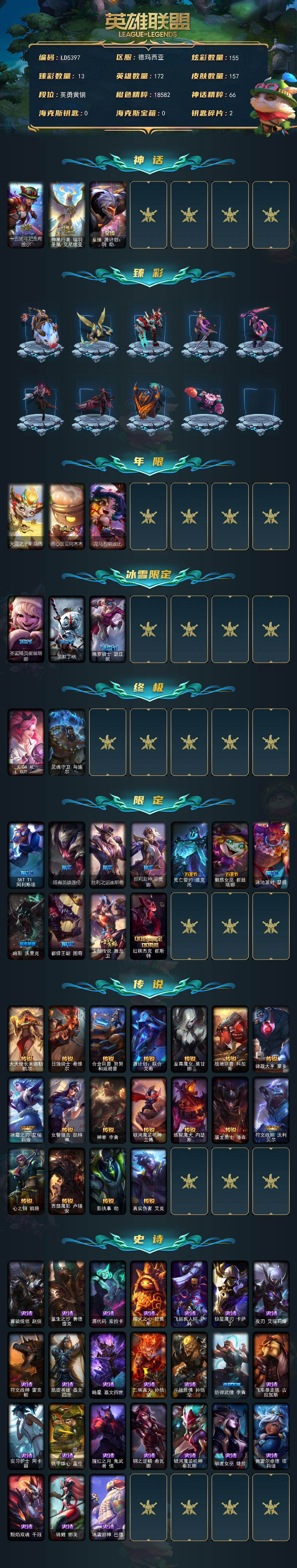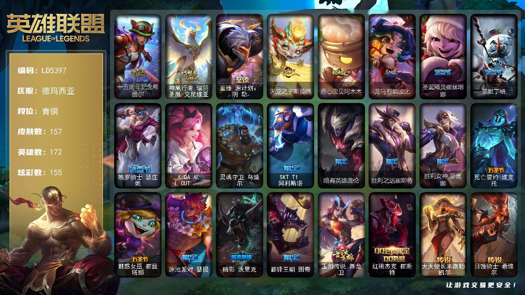 【632972】【LD5397】172英雄/157皮肤/4终极/3神话/17限定/13臻彩/155炫彩/18传说/24史诗/青铜账号等级:333/十五周年纪念希维尔/神凰行者瑞羽凤凰艾尼维亚/至臻源计划:阴劫/无畏骑士瑟庄妮赤子初心/冠军掠夺者卡兹克凯旋圣装/冠军之刃锐雯2016凯旋圣装/斗魂觉醒拉克丝无限斗志/霸天战士雷恩加尔星啸天火/玉剑传说无极麒麟/源计划毁灭派克幻灭/西部魔影卢锡安贝利尔