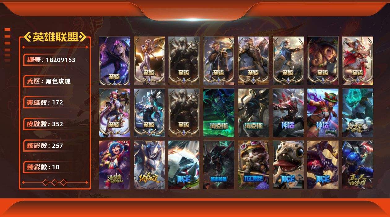 【633471】[18209153]黄金段位-172英雄-352皮肤-257炫彩-0终极-18神话-31限定-45传说-82史诗【珍稀头像】:至爱的鹿头像【神话皮肤】:十周年纪念安妮,源代码乐芙兰,十五周年纪念希维尔,神凰行者瑞羽圣凰艾尼维亚,殿堂传奇薇恩【至臻皮肤】:至臻魅惑女巫莫甘娜,至臻灵能特工伊泽瑞尔,至臻暗星女王黛安娜,至臻星之守护者辛德拉,至臻黑夜使者凯隐,至臻KDA卡莎,至臻幻灵战