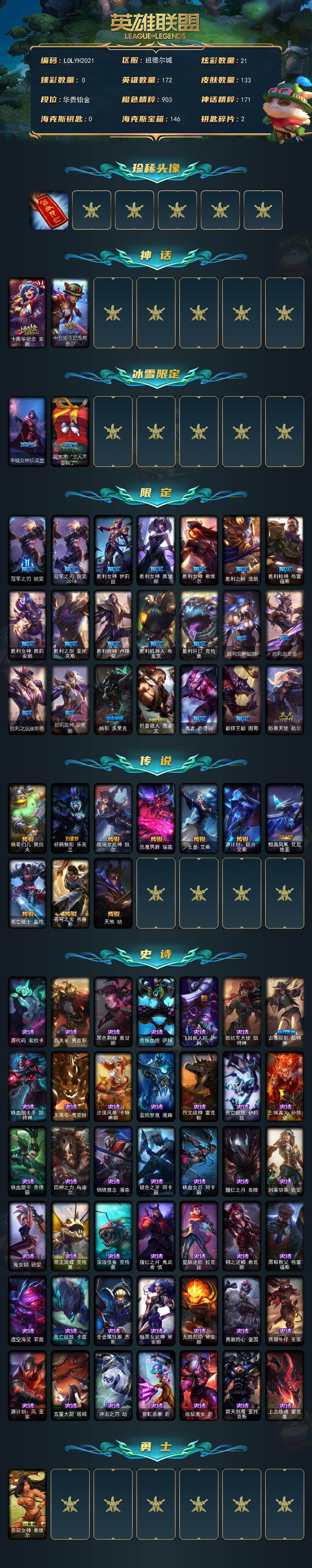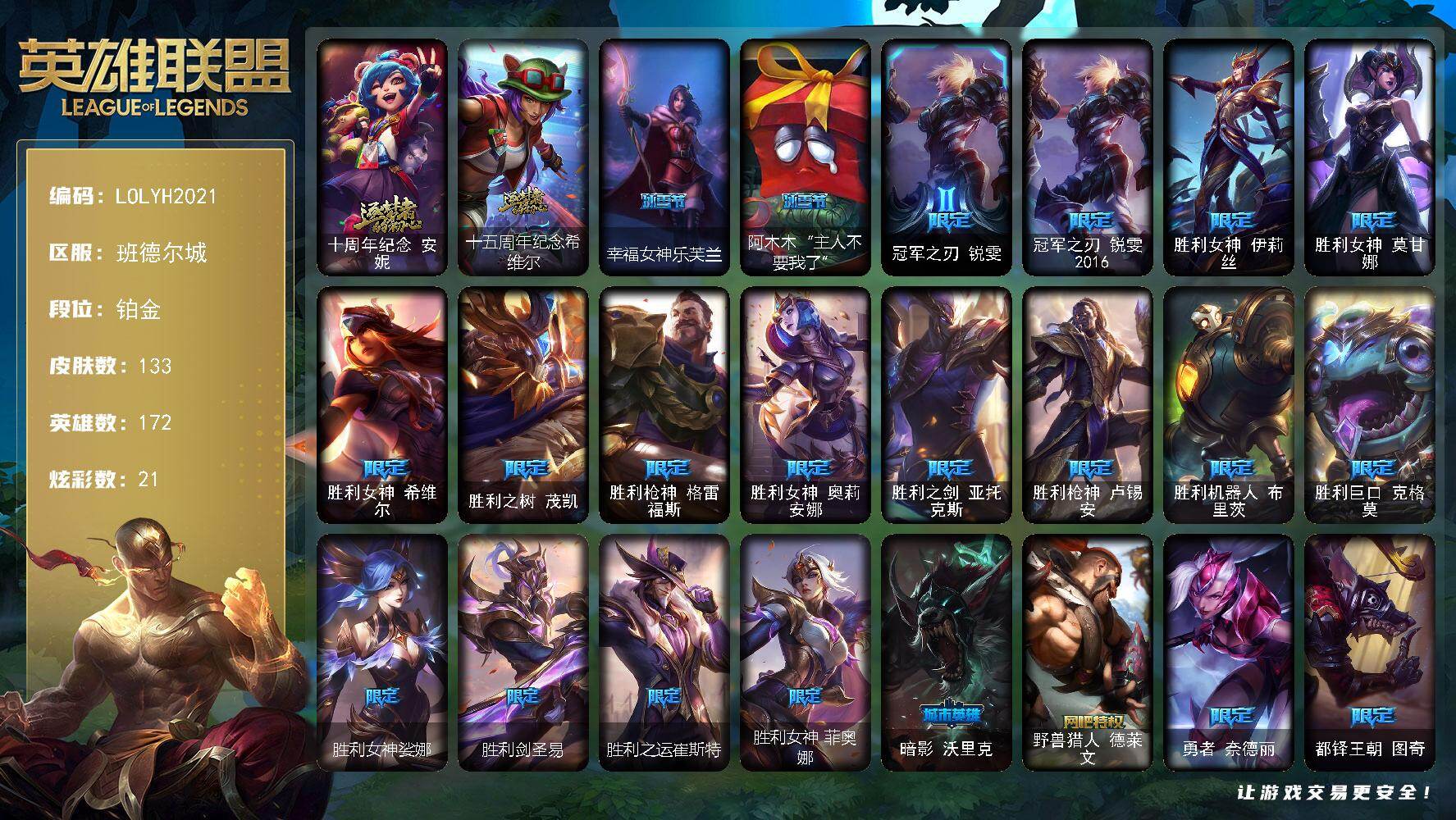 【633496】【LOLYH2021】172英雄/133皮肤/2神话/24限定/21炫彩/10传说/42史诗/铂金/红包/十周年纪念安妮/十五周年纪念希维尔/幸福女神乐芙兰/阿木木:“主人不要我了”/冠军之刃锐雯/冠军之刃锐雯2018/胜利女神伊莉丝/胜利女神莫甘娜/胜利女神希维尔/胜利之树茂凯/胜利枪神格雷福斯/胜利女神奥莉安娜/胜利之剑亚托克斯/胜利枪神卢锡安/胜利机器人布里茨/胜利巨口克格