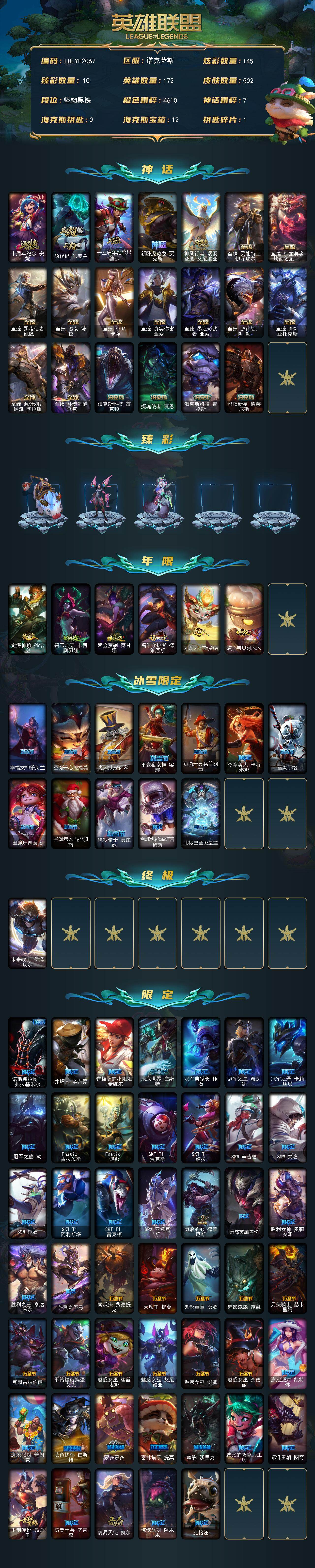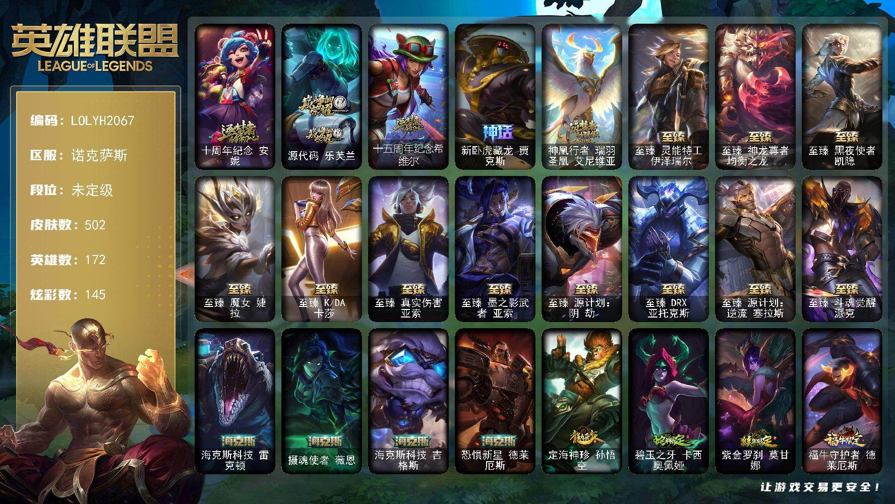 【643261】【LOLYH2067】172英雄/502皮肤/1终极/20神话/65限定/10臻彩/145炫彩/48传说/126史诗/未定级/十周年纪念安妮/源代码乐芙兰/十五周年纪念希维尔/新卧虎藏龙贾克斯/神凰行者瑞羽凤凰艾尼维亚/至臻灵能特工伊泽瑞尔/至臻神龙尊者均衡之龙沃利贝尔/至臻黑夜使者凯隐/至臻魔女婕拉/至臻K/DA卡莎/至臻真实伤害亚索/至臻墨之影武者亚索/至臻源计划:阴劫/至臻