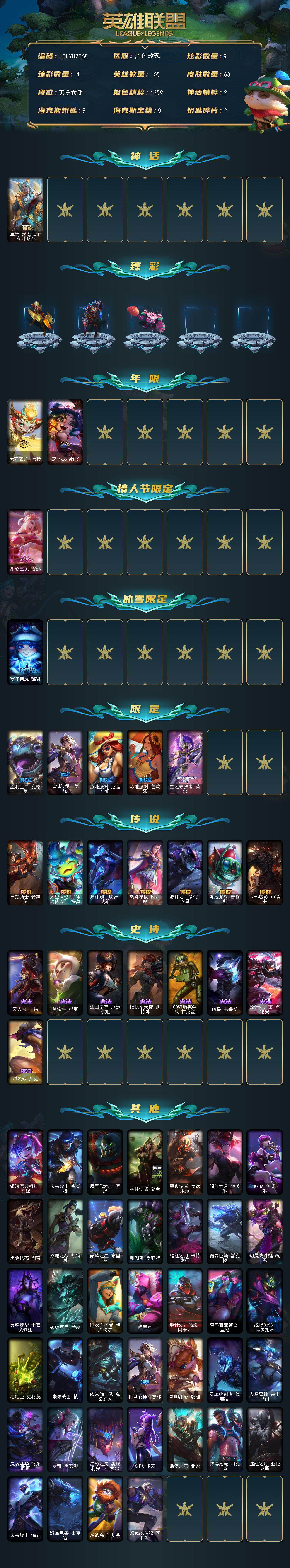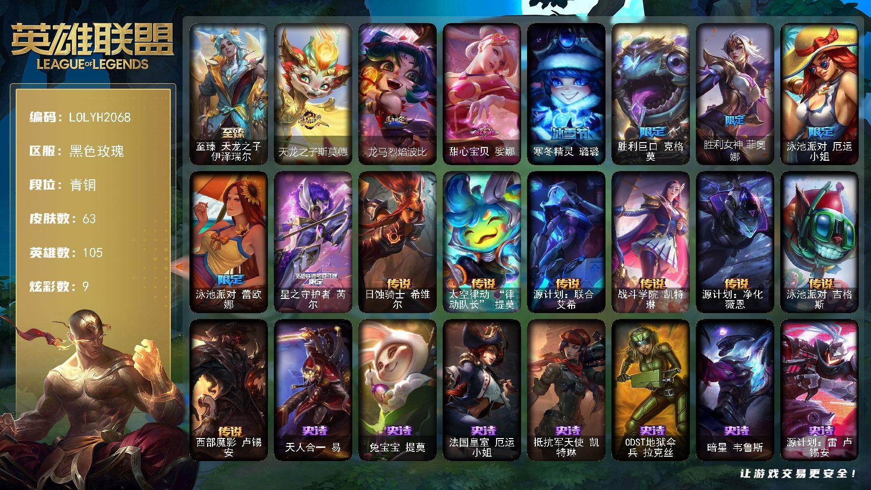 【643263】【LOLYH2068】105英雄/63皮肤/1神话/9限定/4臻彩/9炫彩/7传说/8史诗/青铜/至臻天龙之子伊泽瑞尔/征服者韦鲁斯炫金/玉剑传说无劫胭脂/可爱可爱粉红红布里茨/水晶玫瑰迦娜甜蜜花蕾/天龙之子斯莫德/龙马烈焰波比/甜心宝贝娑娜/寒冬精灵璐璐/胜利巨口克格莫/胜利女神菲奥娜/泳池派对厄运小姐/泳池派对蕾欧娜/星之守护者芮尔/日蚀骑士希维尔/太空律动“律动队长”提莫/
