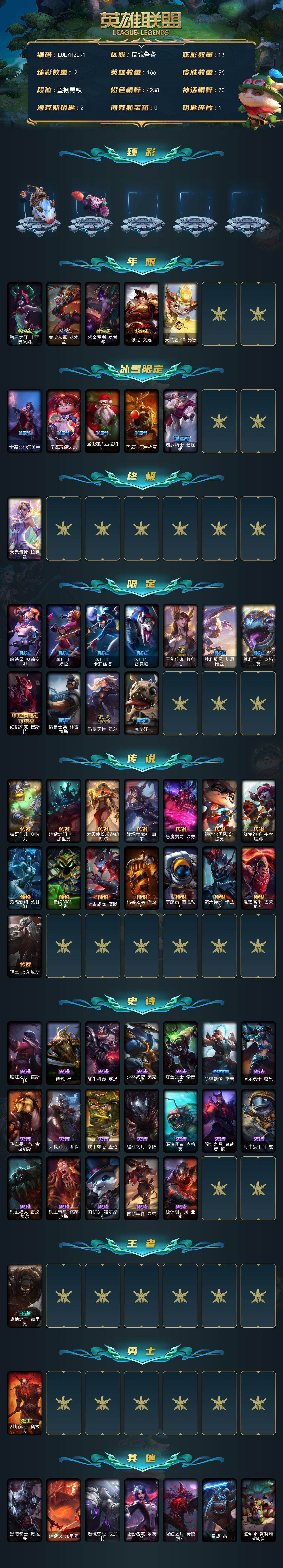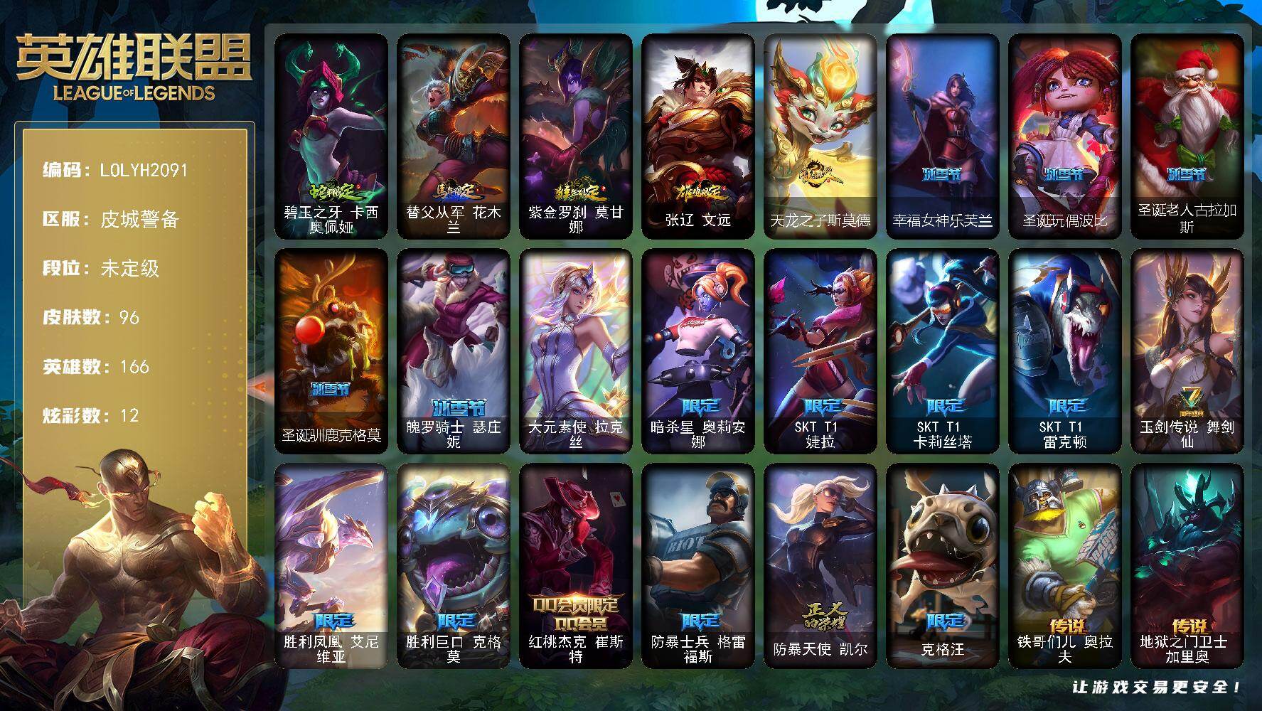 【643278】【LOLYH2091】166英雄/96皮肤/1终极/21限定/2臻彩/12炫彩/15传说/19史诗/未定级/无畏骑士瑟庄妮赤子初心/可爱可爱粉红红布里茨/碧玉之牙卡西奥佩娅/替父从军花木兰/紫金罗刹莫甘娜/张辽文远/天龙之子斯莫德/幸福女神乐芙兰/圣诞玩偶波比/圣诞老人古拉加斯/圣诞驯鹿克格莫/魄罗骑士瑟庄妮/大元素使拉克丝/暗杀星奥莉安娜/SKTT1婕拉/SKTT1卡莉丝塔/S