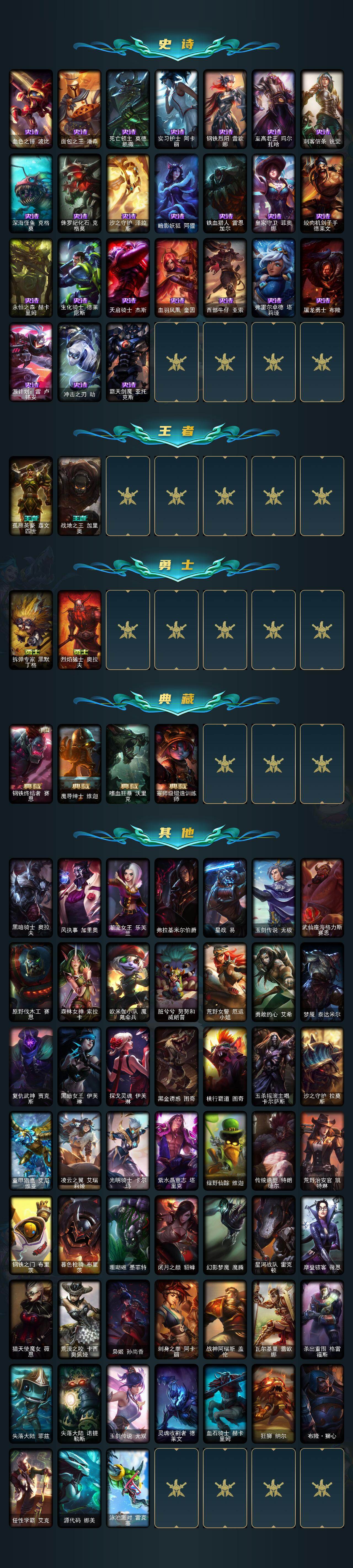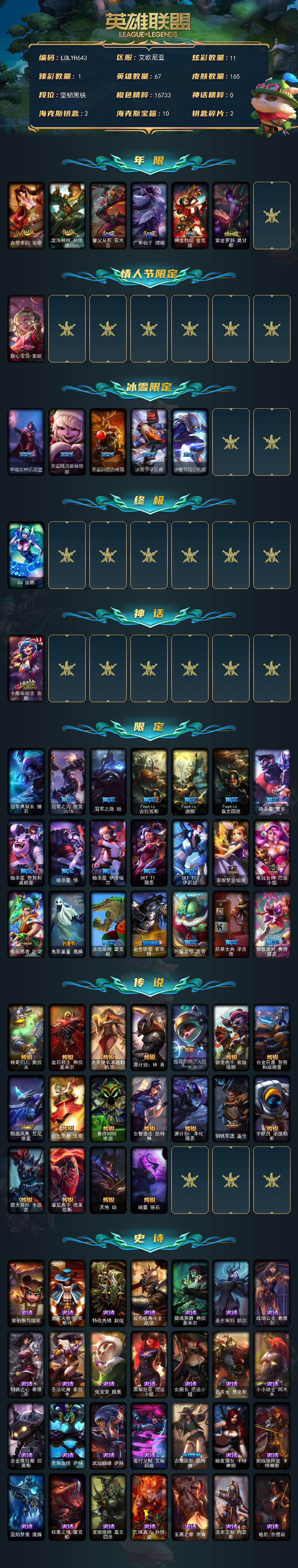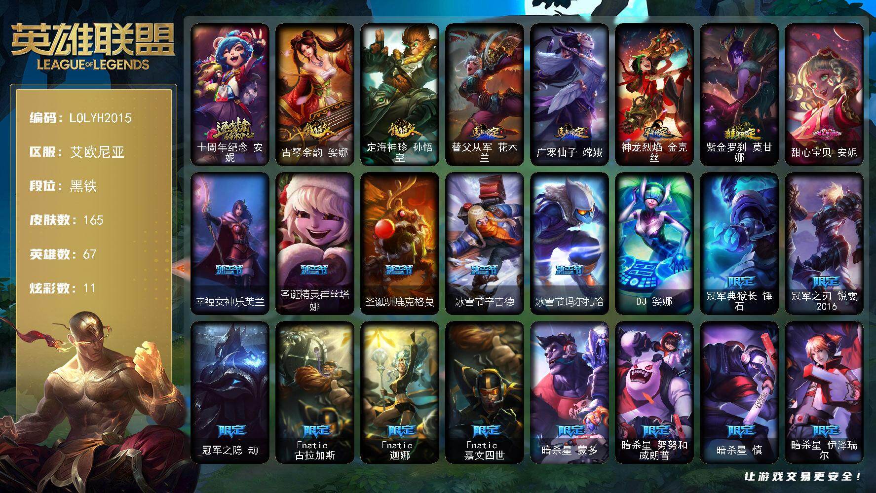 【643293】【LOLYH2015】67英雄/165皮肤/1终极/1神话/33限定/1臻彩/11炫彩/18传说/52史诗/黑铁/十周年纪念安妮/魔女阿卡丽虚荣/古琴余韵娑娜/定海神针孙悟空/替父从军花木兰/广寒仙子嫦娥/神龙烈焰金克丝/紫金罗刹莫甘娜/甜心宝贝安妮/幸福女神乐芙兰/圣诞精灵崔丝塔娜/圣诞驯鹿克格莫/冰雪节辛吉德/冰雪节玛尔扎哈/DJ娑娜/冠军典狱长锤石/冠军之刃锐雯2018/冠