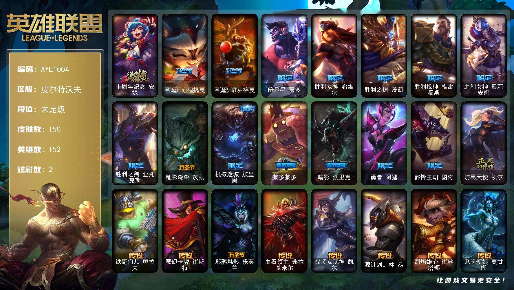 【643298】[18288166]未定级段位-152英雄-150皮肤-2炫彩-0终极-1神话-15限定-20传说-45史诗【神话皮肤】:十周年纪念安妮【冰雪限定】:圣诞开心鬼提莫,圣诞驯鹿克格莫【限定皮肤】:暗杀星蒙多,胜利女神希维尔,胜利之树茂凯,胜利枪神格雷福斯,胜利女神奥莉安娜,胜利之剑亚托克斯,鬼影森森茂凯,机械迷城加里奥,蒙多蒙多,暗影沃里克,勇者阿狸,都铎王朝图奇,防暴天使凯尔【传