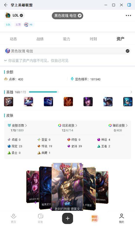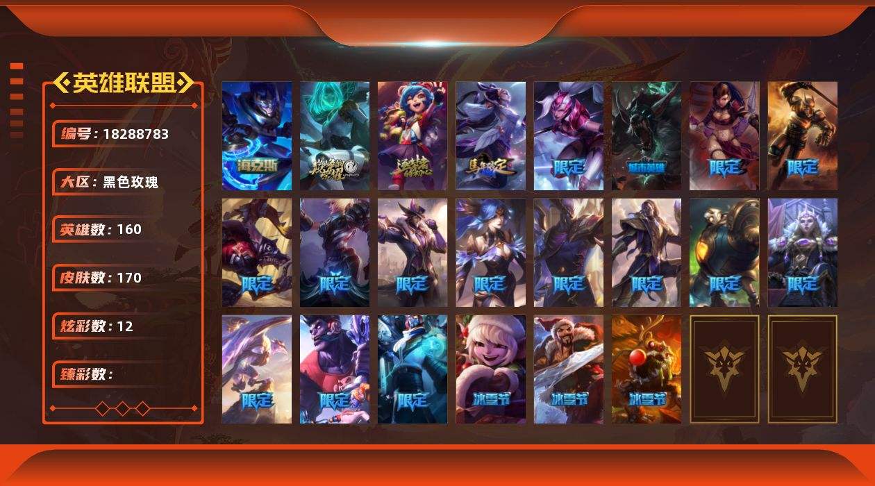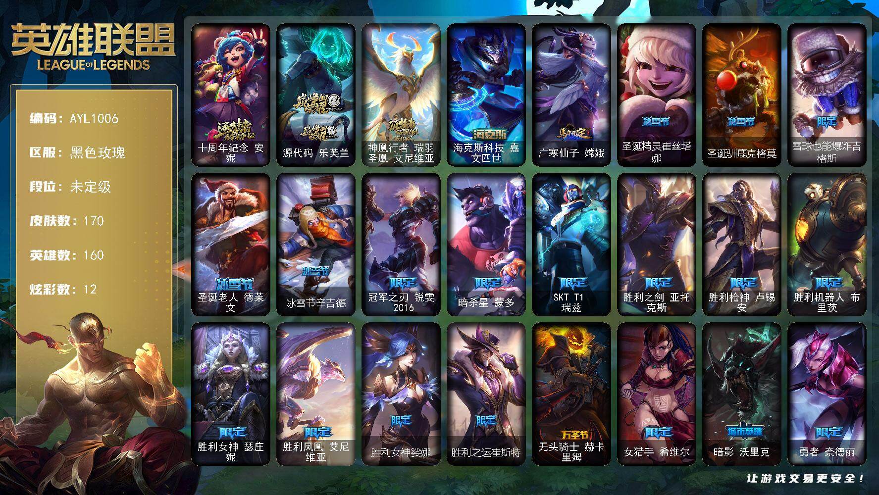 【643329】[18288783]【特价出售/店主推荐】未定级段位-160英雄-170皮肤-12炫彩-0终极-4神话-23限定-19传说-39史诗【神话皮肤】:十周年纪念安妮,源代码乐芙兰,神凰行者瑞羽圣凰艾尼维亚【海克斯皮肤】:海克斯科技嘉文四世【年限皮肤】:广寒仙子嫦娥【冰雪限定】:圣诞精灵崔丝塔娜,圣诞驯鹿克格莫,雪球也能爆炸吉格斯,圣诞老人德莱文,冰雪节辛吉德【限定皮肤】:冠军之刃锐雯