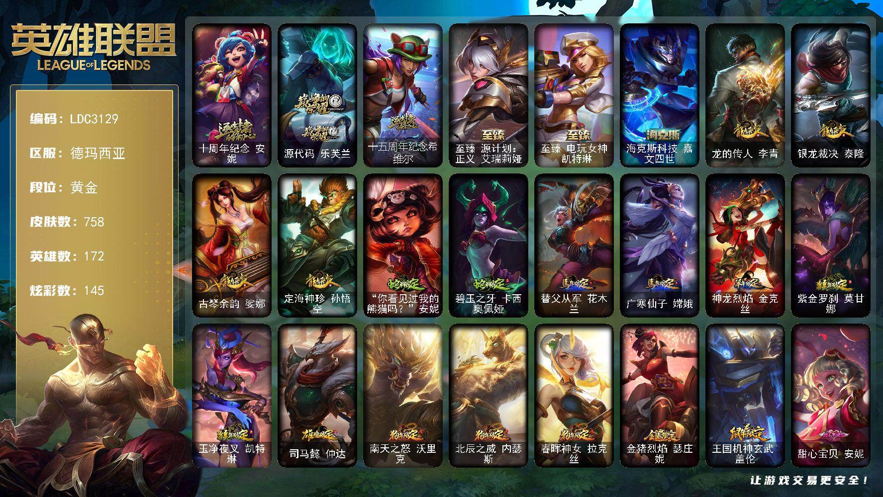 【643722】【LDC3129】172英雄/758皮肤/4终极/6神话/149限定/11臻彩/145炫彩/66传说/195史诗/黄金/十周年纪念安妮/源代码乐芙兰/十五周年纪念希维尔/至臻源计划:正义艾瑞莉娅/至臻电玩女神凯特琳/海克斯科技嘉文四世/天龙之子卡莎飞龙乘云/墨之影武者亚索金墨耀影/雾雨之刃锐雯/神龙尊者圣龙李青登龙/弹幕天使卡莎炽天使公正/魔女阿卡丽虚荣/净雪之月莫甘娜冬虹/幻灵
