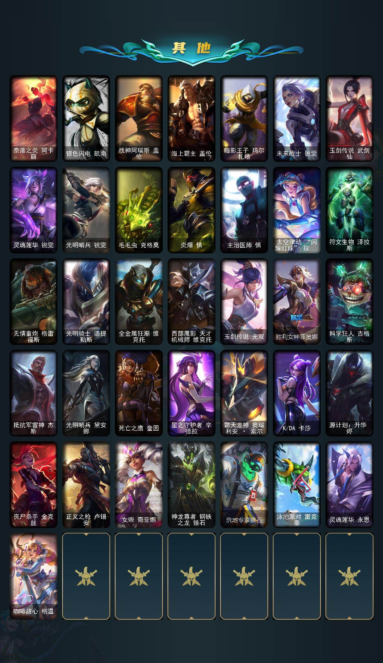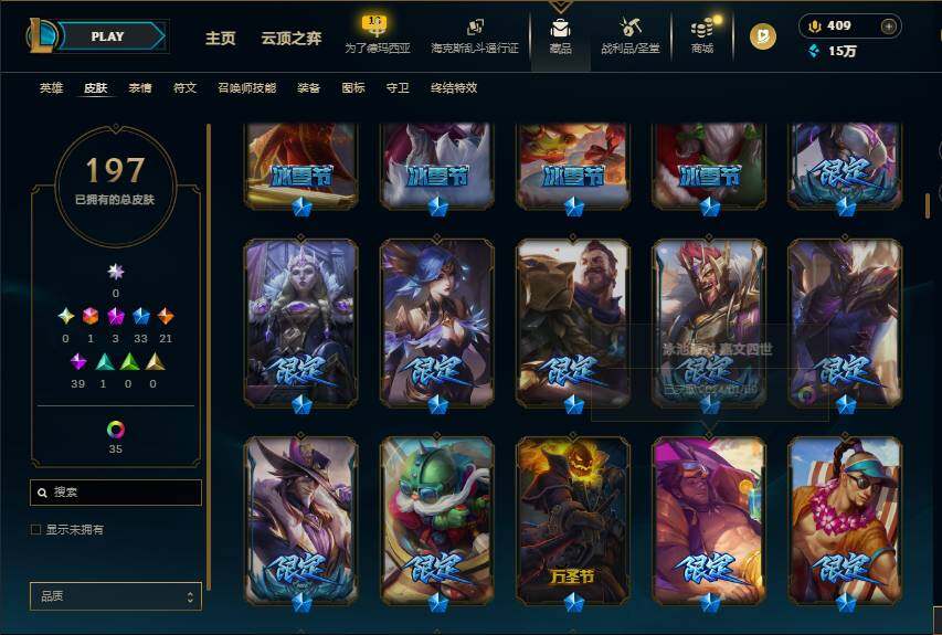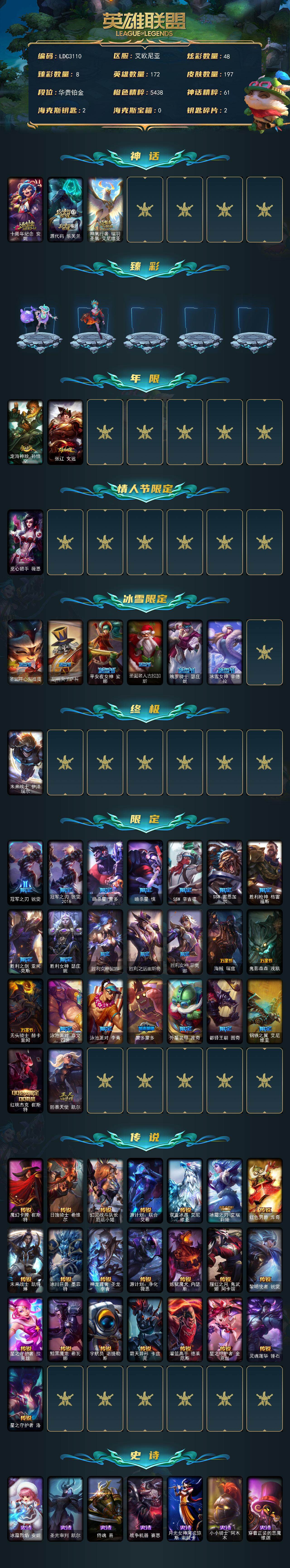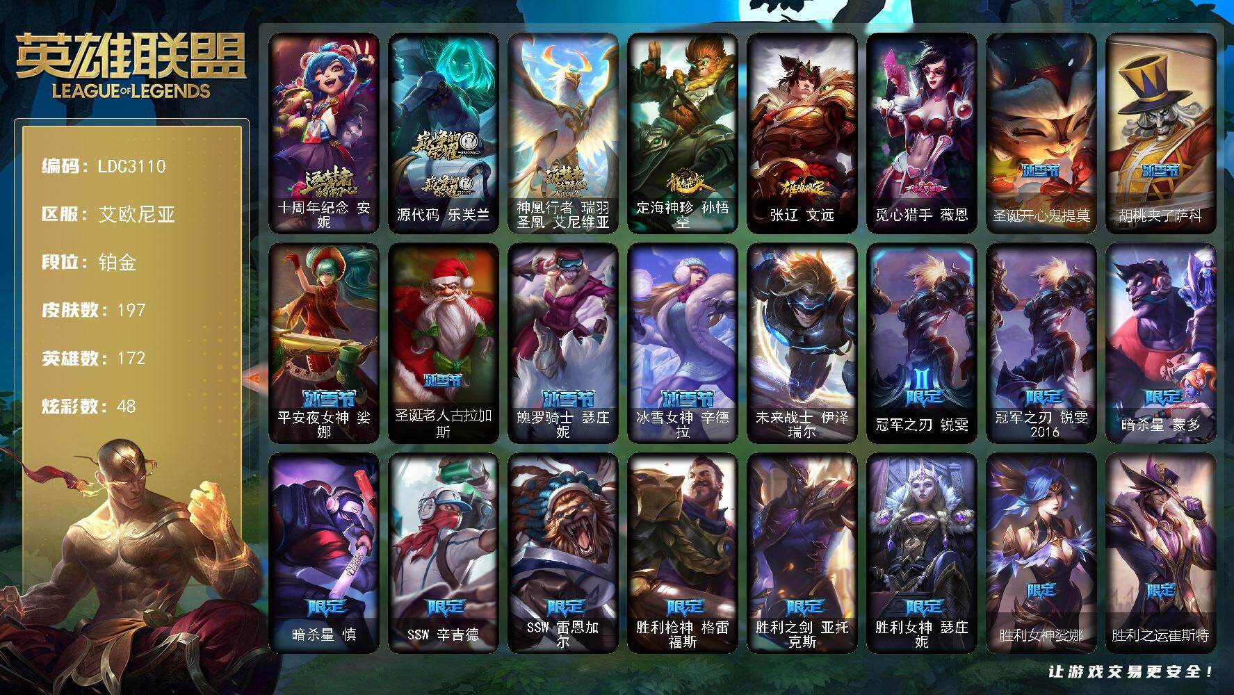 【643740】【LDC3110】172英雄/197皮肤/1终极/3神话/33限定/8臻彩/48炫彩/22传说/39史诗/铂金/十周年纪念安妮/源代码乐芙兰/神凰行者瑞羽凤凰艾尼维亚/泳池派对奥莉安娜优雅珠光鲸/灵魂莲华锐雯流火/魔女阿卡丽虚荣/红莲之刃锐雯/定海神针孙悟空/张辽文远/觅心猎手薇恩/圣诞开心鬼提莫/胡桃夹子萨科/平安夜女神娑娜/圣诞老人古拉加斯/魄罗骑士瑟庄妮/冰雪女神辛德拉/未