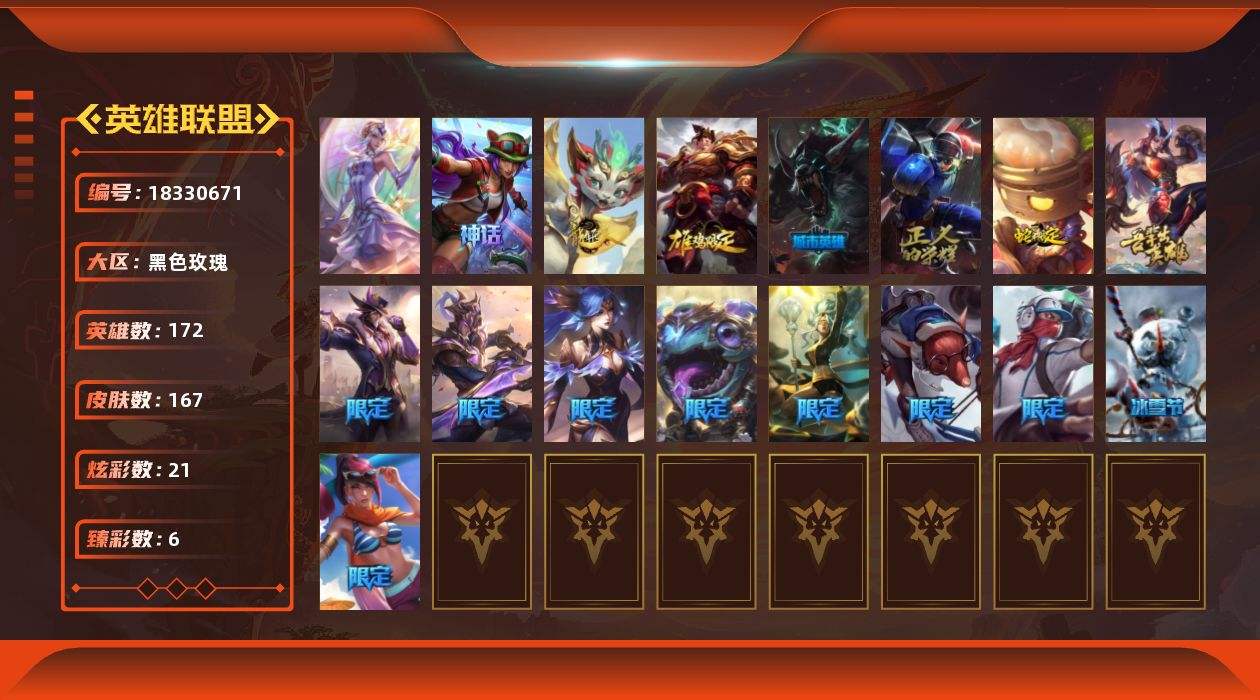 【648701】[18330671]白银段位-172英雄-167皮肤-21炫彩-1终极-1神话-22限定-13传说-39史诗【珍稀头像】:星守阿狸头像【神话皮肤】:十五周年纪念希维尔【臻彩皮肤】:冰霜之刃艾瑞莉娅炫金,霸天战士雷恩加尔星啸天火,可爱可爱粉红红布里茨,魔女阿卡丽虚荣,西部魔影执行人卡特琳娜纯洁【年限皮肤】:张辽文远,天龙之子斯莫德,点心宝贝阿木木,龙马烈焰波比【冰雪限定】:圣诞狂欢