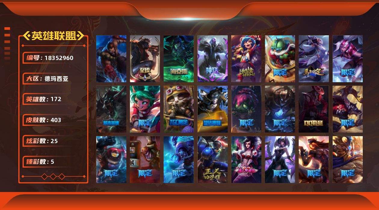 【651419】[18352960]未定级段位-172英雄-403皮肤-25炫彩-1终极-4神话-62限定-33传说-114史诗【热门头像】:爱情之歌头像【神话皮肤】:十周年纪念安妮,灰烬骑士派克【至臻皮肤】:至臻西部魔影猎天使恶魔泰隆【海克斯皮肤】:摄魂使者薇恩【臻彩皮肤】:天龙之子卡莎飞龙乘云,西部天使赛娜贝利尔之怠,最终BOSS维迦里大魔王,魔女阿卡丽虚荣,净雪之月莫甘娜冬虹【年限皮肤】: