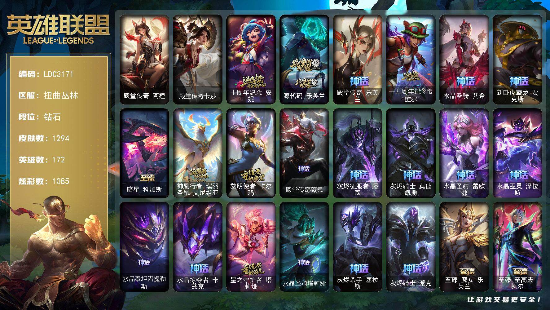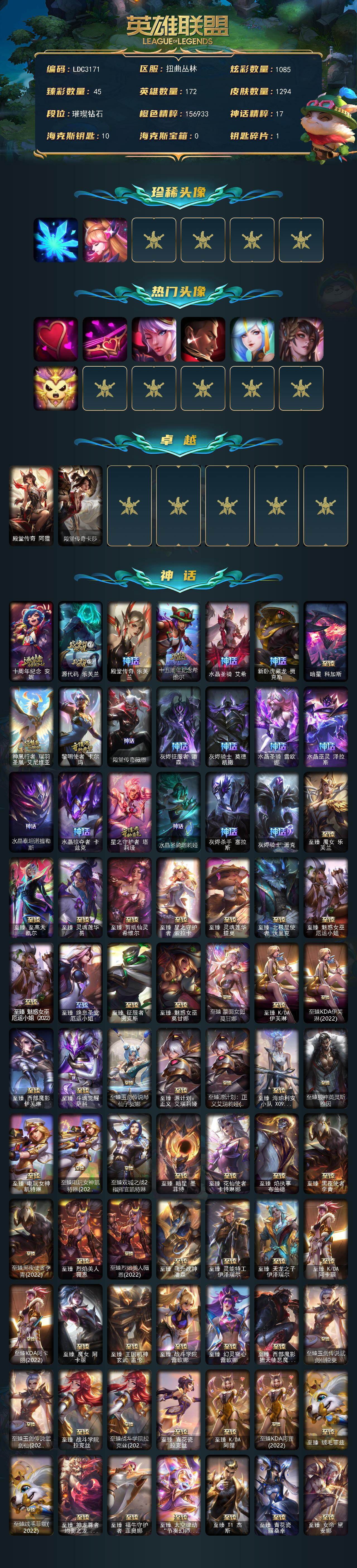 【651473】【LDC3171】172英雄/1294皮肤/8终极/138神话/236限定/45臻彩/1085炫彩/105传说/215史诗/钻石账号等级:1105/雪花/星守阿狸/爱意绵绵/爱情之歌/觅心之翼奎因/觅心游侠卢锡安/春晖神女/玉剑传说舞剑仙/星守索拉卡/殿堂传奇阿狸/殿堂传奇卡莎/十周年纪念安妮/源代码乐芙兰/殿堂传奇乐芙兰/十五周年纪念希维尔/水晶圣骑艾希/新卧虎藏龙贾克斯/暗星