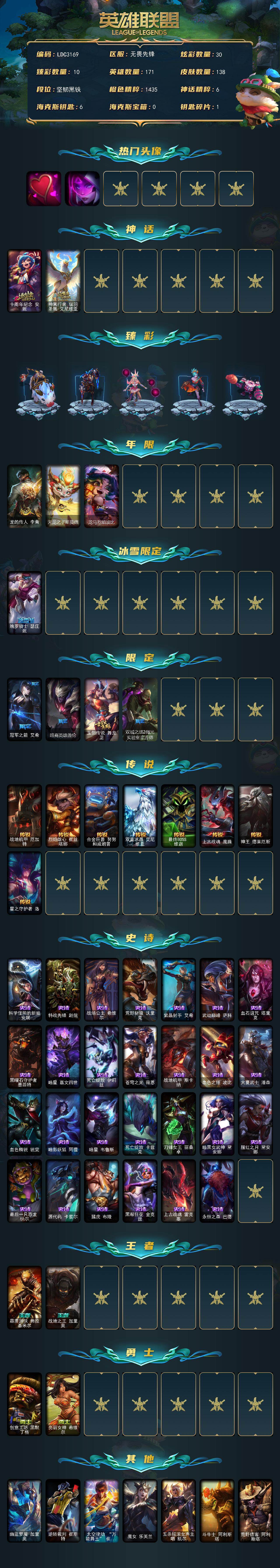 【651477】【LDC3169】171英雄/138皮肤/2神话/9限定/10臻彩/30炫彩/8传说/27史诗/未定级账号等级:336/爱意绵绵/源计划刀妹/十周年纪念安妮/神凰行者瑞羽凤凰艾尼维亚/无畏骑士瑟庄妮赤子初心/战斗学院卡特琳娜盛典礼服/玉剑传说无劫胭脂/星之守护者辛德拉未来之光/幻灵战斗蝠薇恩梦幻强袭/灵魂莲华锐雯流火/可爱可爱粉红红布里茨/春晖神女艾希玉露金风/魔女阿卡丽虚荣/龙