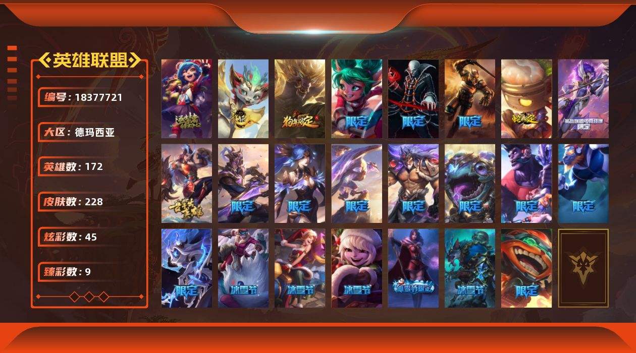 【654518】[18377721]【店主推荐捡漏号】白银段位-172英雄-228皮肤-45炫彩-0终极-2神话-28限定-13传说-44史诗【神话皮肤】:十周年纪念安妮,神凰行者瑞羽圣凰艾尼维亚【臻彩皮肤】:无畏骑士瑟庄妮赤子初心,冠军之矛卡莉丝塔凯旋圣装,雾雨之刃锐雯,斗魂觉醒拉克丝无限斗志,西部天使赛娜贝利尔之怠,星之守护者霞烈羽,可爱可爱粉红红布里茨,魔女阿卡丽虚荣,净雪之月莫甘娜冬虹【