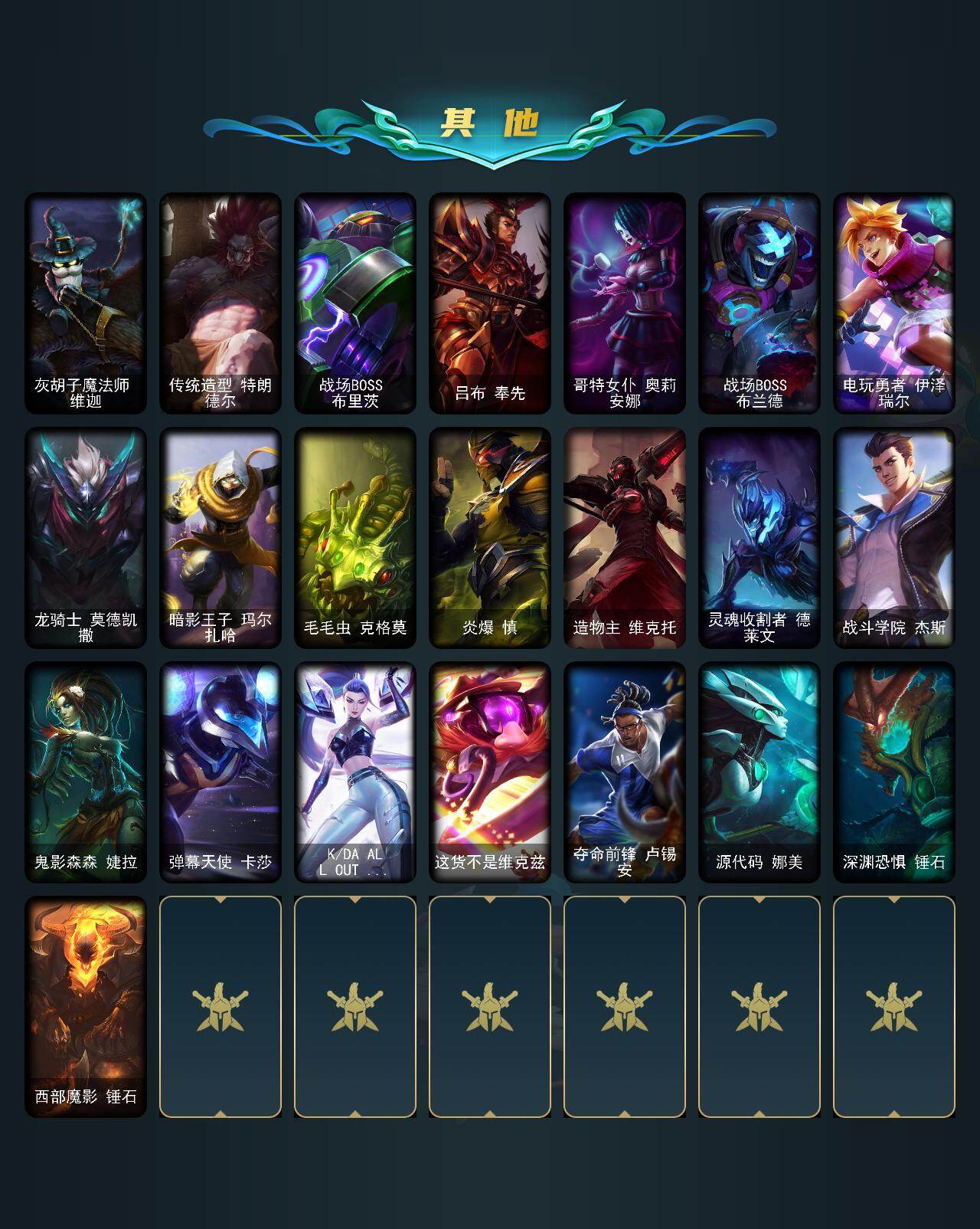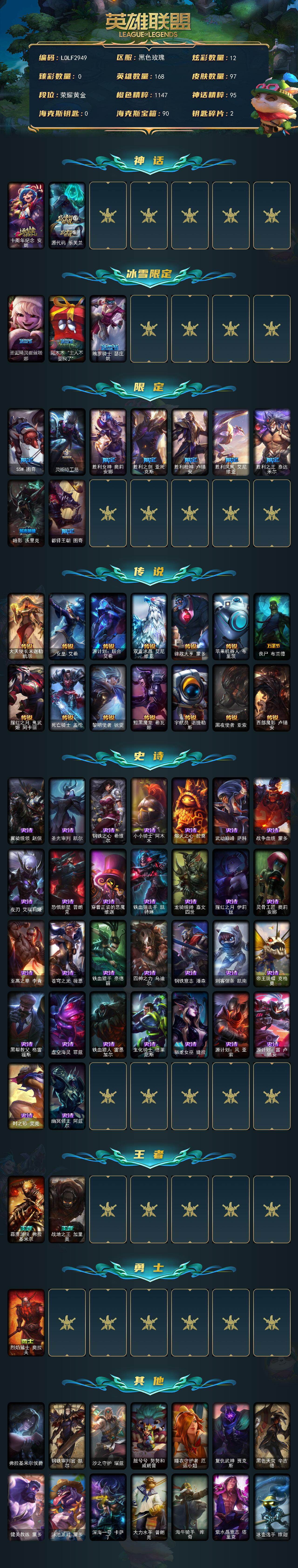 【655658】【LOLF2949】168英雄/97皮肤/2神话/12限定/12炫彩/14传说/30史诗/黄金/十周年纪念安妮/源代码乐芙兰/圣诞精灵崔丝塔娜/阿木木:“主人不要我了”/魄罗骑士瑟庄妮/SSW图奇/灵能特工易/胜利女神奥莉安娜/胜利之剑亚托克斯/胜利枪神卢锡安/胜利凤凰艾尼维亚/胜利之王泰达米尔/暗影妖狐阿狸/都铎王朝图奇/大天使长米迦勒凯尔/女皇艾希/源计划:联合艾希/双重冰晶
