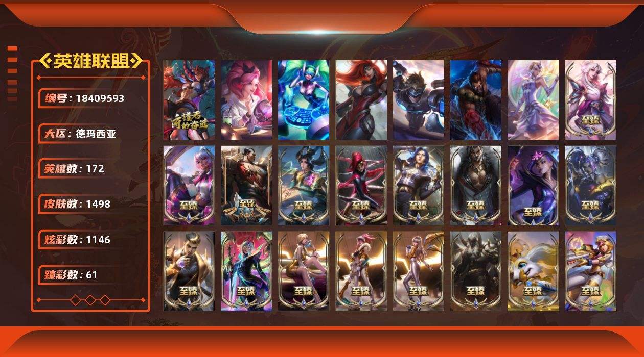 【658243】[18409593]【特价出售/店主推荐】黄金段位-172英雄-1498皮肤-1146炫彩-9终极-117神话-242限定-130传说-215史诗【珍稀头像】:雪花头像【热门头像】:爱情之歌头像,觅心之翼奎因头像,春晖神女头像【神话皮肤】:十周年纪念安妮,源代码乐芙兰,殿堂传奇乐芙兰,十五周年纪念希维尔,神凰行者瑞羽圣凰艾尼维亚,黎明使者卡尔玛,殿堂传奇薇恩,水晶圣骑蕾欧娜,水晶