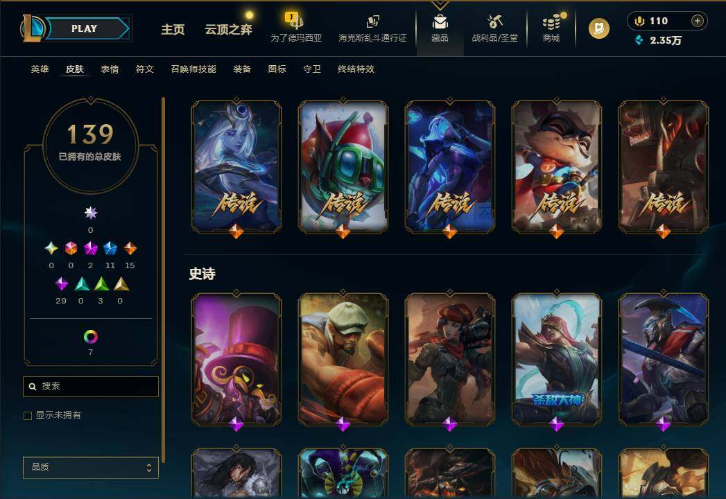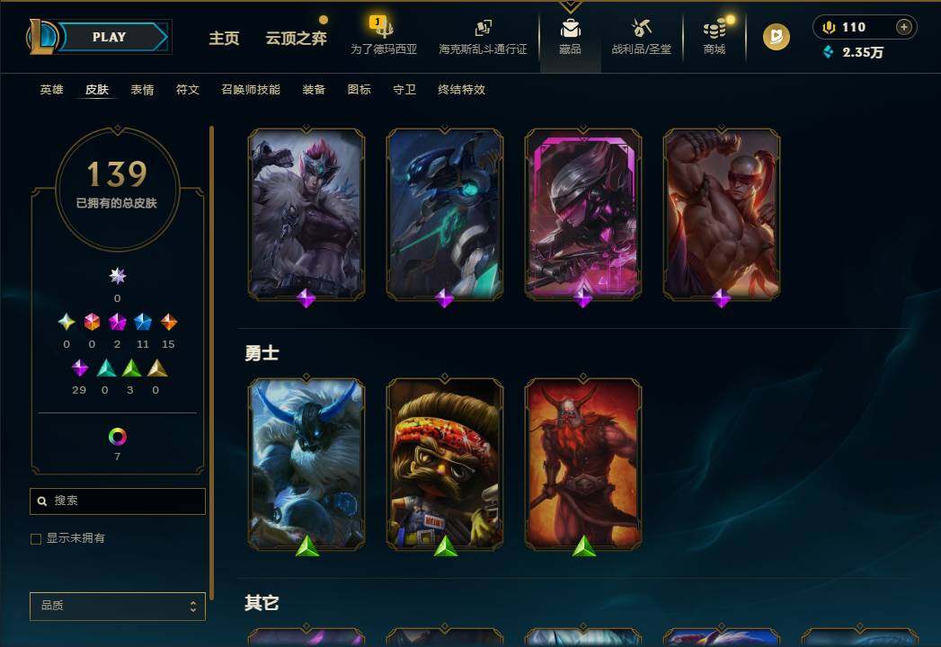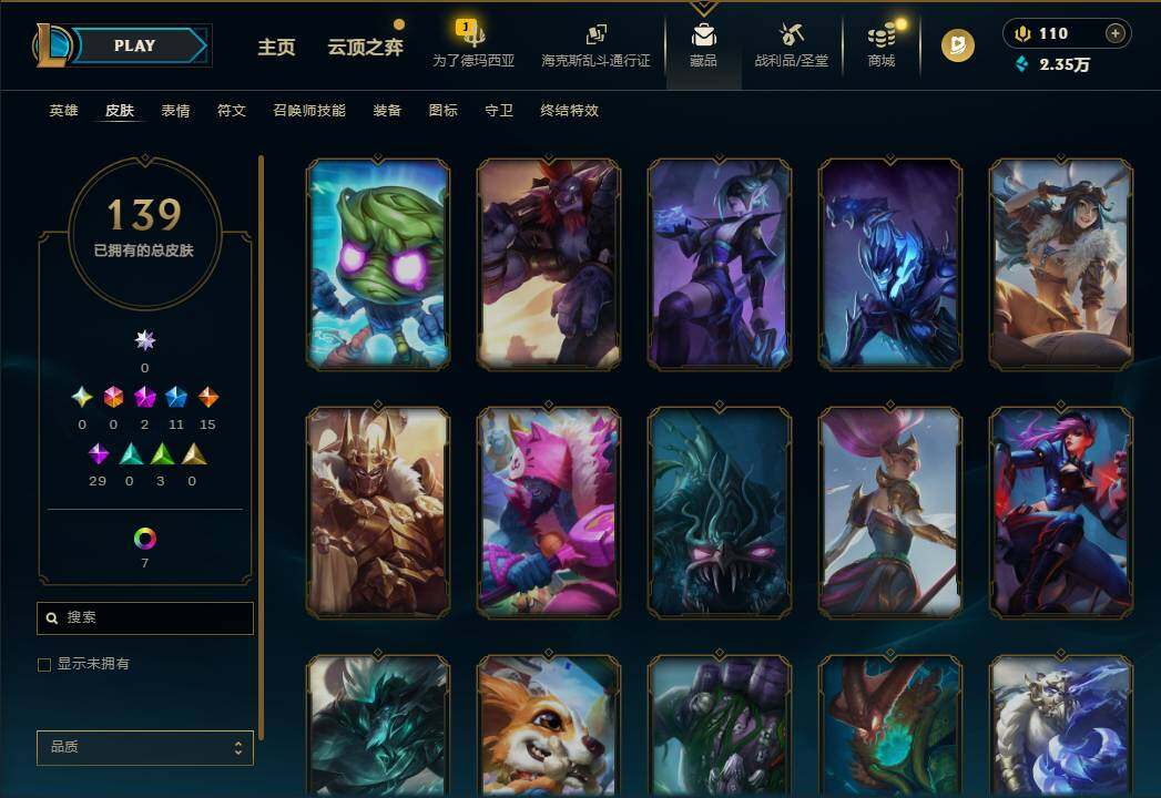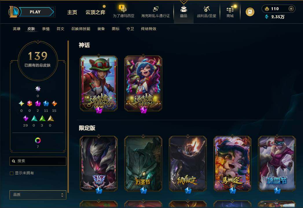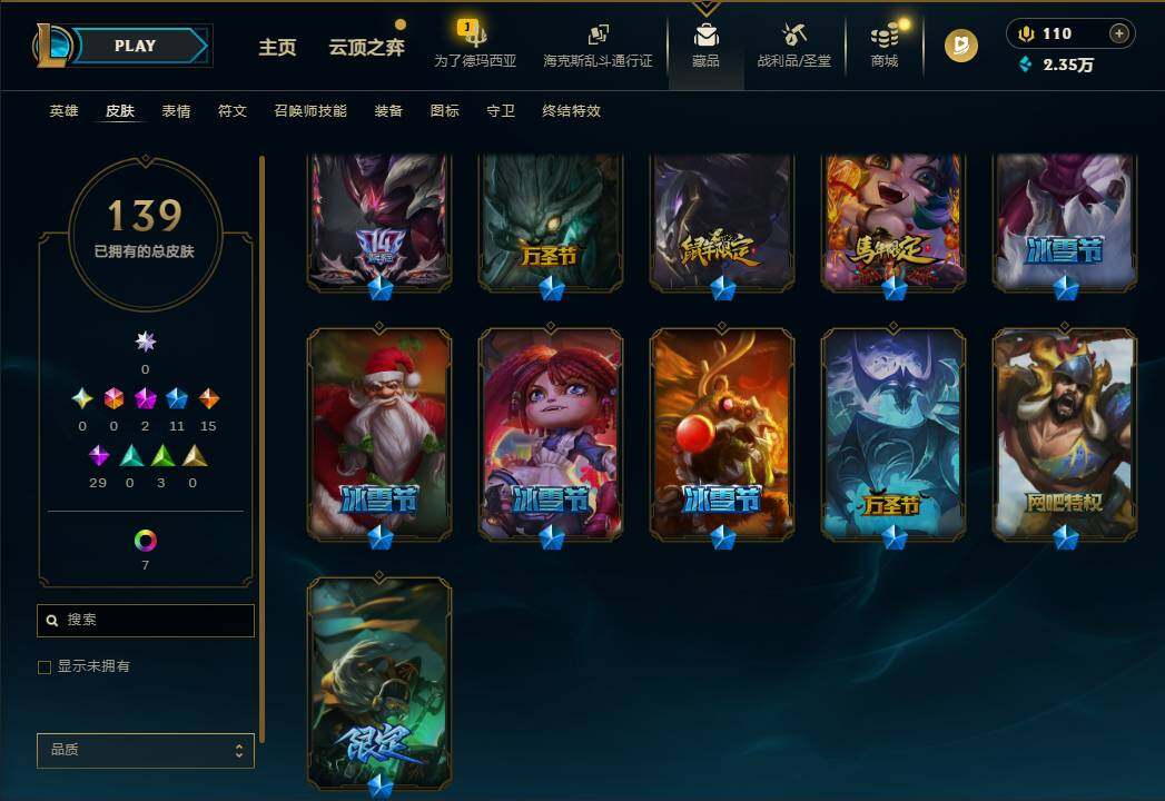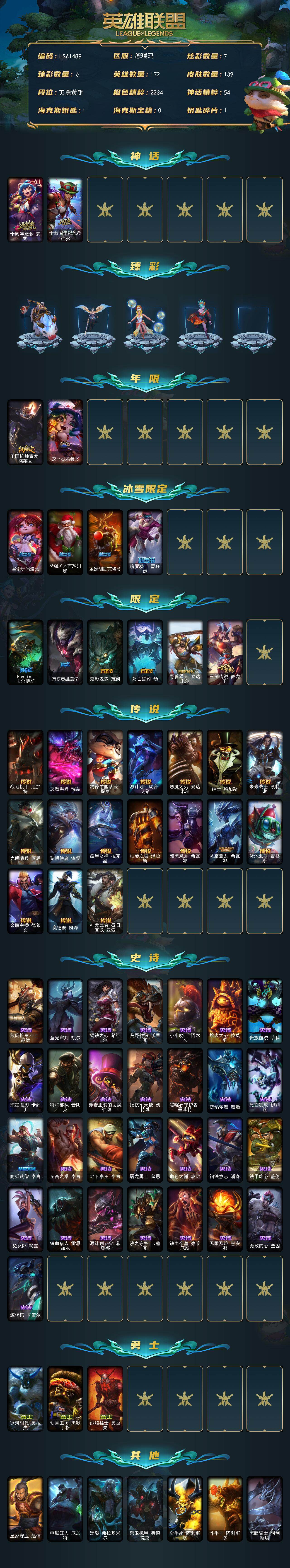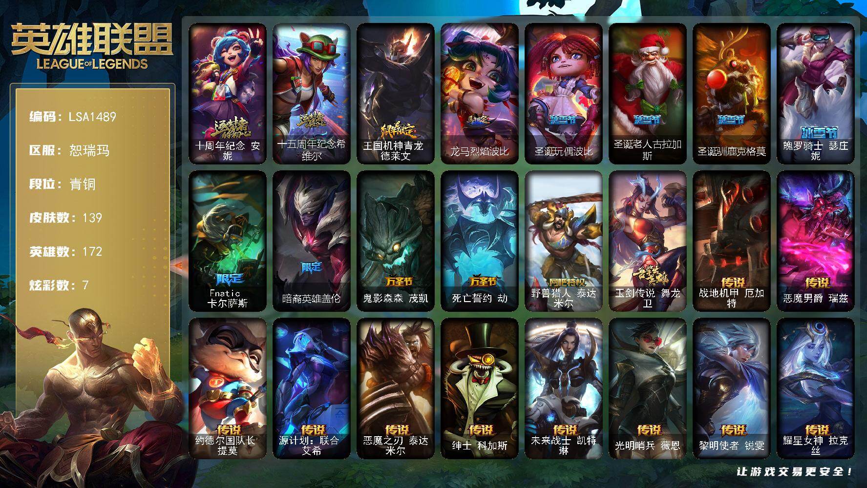 【681259】【LSA1489】172英雄/139皮肤/2神话/12限定/6臻彩/7炫彩/17传说/29史诗/青铜账号等级:237/十周年纪念安妮/十五周年纪念希维尔/无畏骑士瑟庄妮赤子初心/玉剑传说翼剑仙珠光/泳池派对辛德拉荔枝枝连击/灵魂莲华锐雯流火/魔女阿卡丽虚荣/王国机神青龙德莱文/龙马烈焰波比/圣诞玩偶波比/圣诞老人古拉加斯/圣诞驯鹿克格莫/魄罗骑士瑟庄妮/Fnatic卡尔萨斯/暗裔