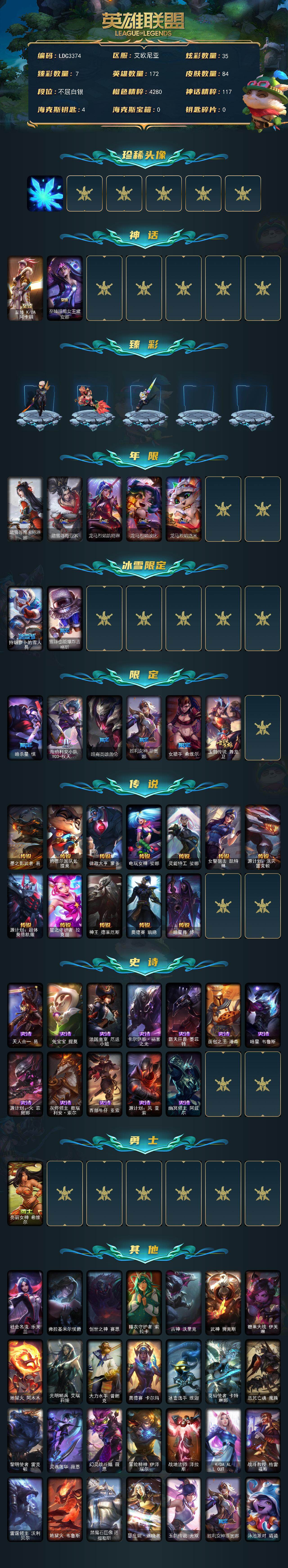 【686594】【LDC3374】172英雄/84皮肤/2神话/14限定/7臻彩/35炫彩/12传说/12史诗/白银/雪花/至臻K/DA阿卡丽/至臻暗星女王黛安娜/魅惑女巫迦娜炫金/源计划火菲奥娜惩戒/玉剑传说寒潭夭夭胭脂/持七彩冰棍的雪人易/红莲之刃锐雯/踏雪寻梅卡特琳娜/踏雪寻梅亚索/龙马烈焰凯特琳/龙马烈焰波比/龙马烈焰悠米/持胡萝卜的雪人易/雪球也能爆炸吉格斯/暗杀星慎/海珀利安小队Y0