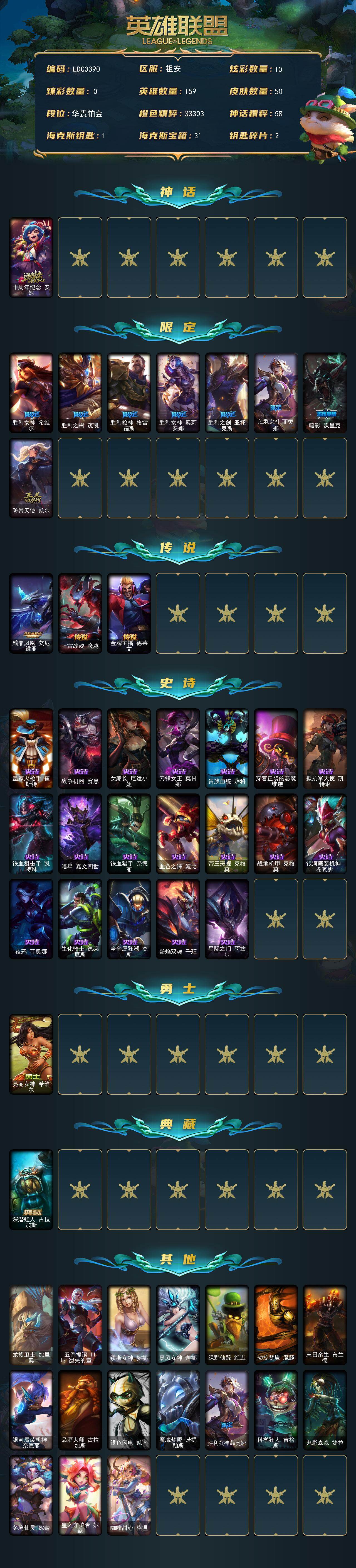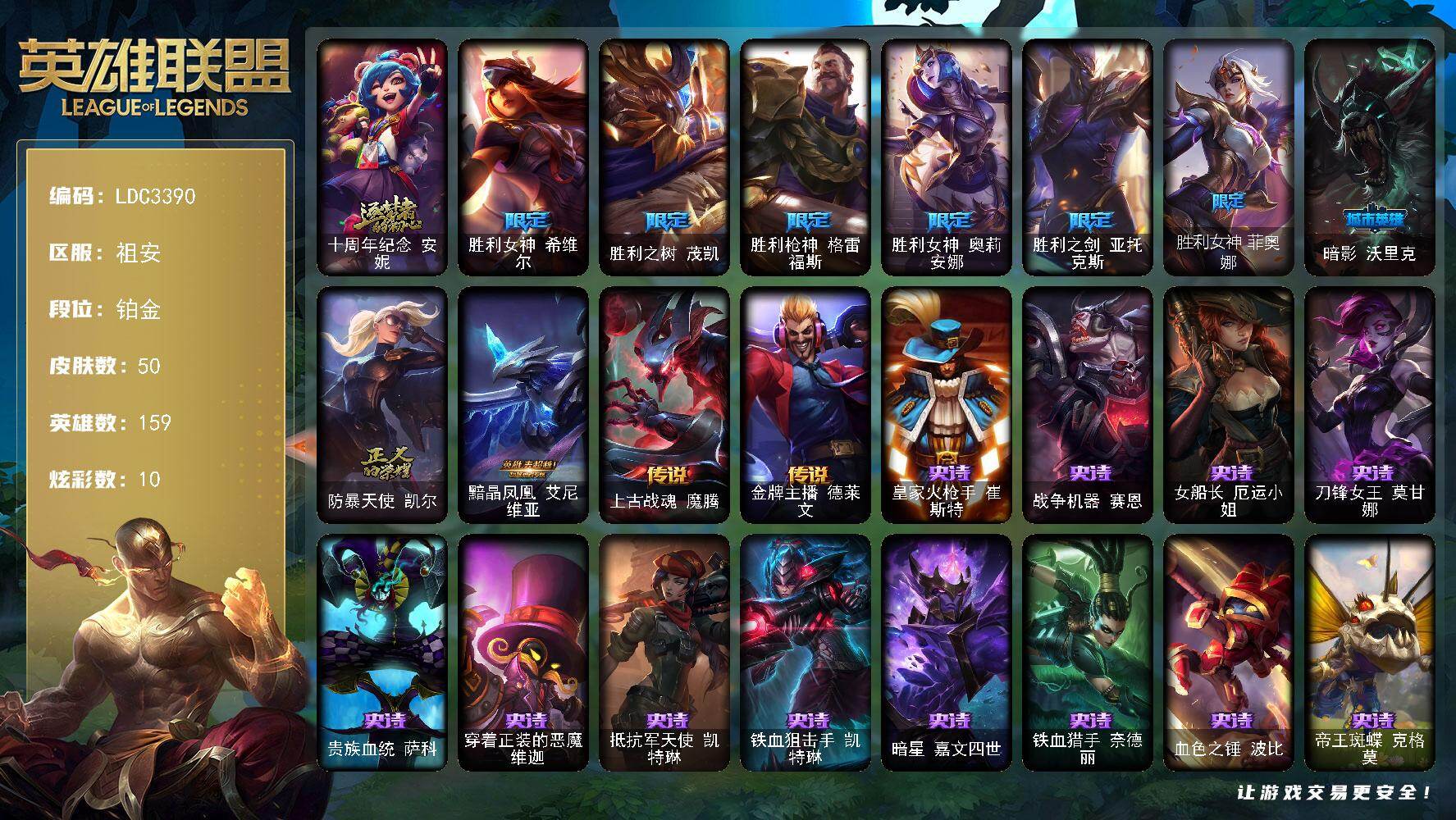 【690631】【LDC3390】159英雄/50皮肤/1神话/9限定/10炫彩/3传说/19史诗/铂金/十周年纪念安妮/胜利女神希维尔/胜利之树茂凯/胜利枪神格雷福斯/胜利女神奥莉安娜/胜利之剑亚托克斯/胜利女神菲奥娜/暗影妖狐阿狸/防暴天使凯尔/黯晶凤凰艾尼维亚/上古战魂魔腾/金牌主播德莱文/皇家火枪手崔斯特/战争机器赛恩/女船长厄运小姐/刀锋女王莫甘娜/贵族血统萨科/穿着症状的恶魔维嘉/抵