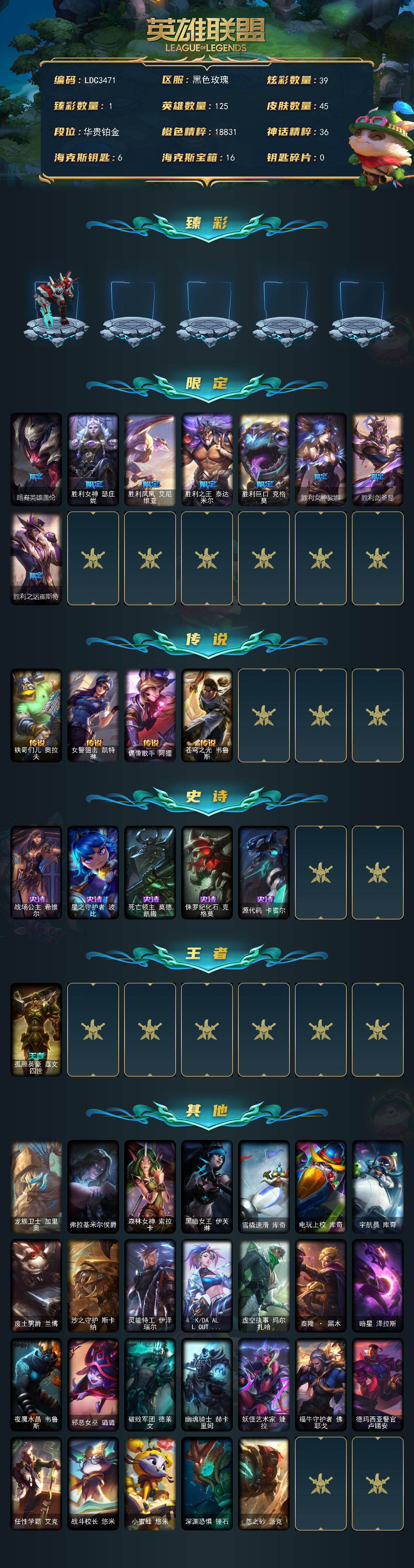 【702184】【LDC3471】125英雄/45皮肤/9限定/1臻彩/39炫彩/4传说/5史诗/铂金/霸天战士雷恩加尔星啸天火/暗裔英雄盖伦/胜利女神瑟庄妮/胜利凤凰艾尼维亚/胜利之王泰达米尔/胜利巨口克格莫/胜利女神娑娜/胜利剑圣易/胜利之运崔斯特/铁哥们儿奥拉夫/女警狙击凯特琳/偶像歌手阿狸/苍穹之光韦鲁斯/战场公主希维尔/星之守护者波比/死亡领主莫德凯撒/侏罗纪化石克格莫/源代码卡密尔/