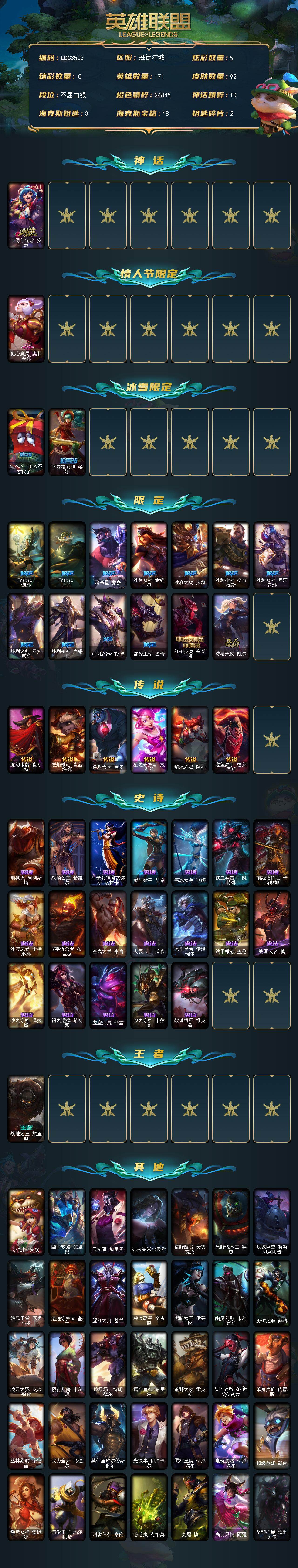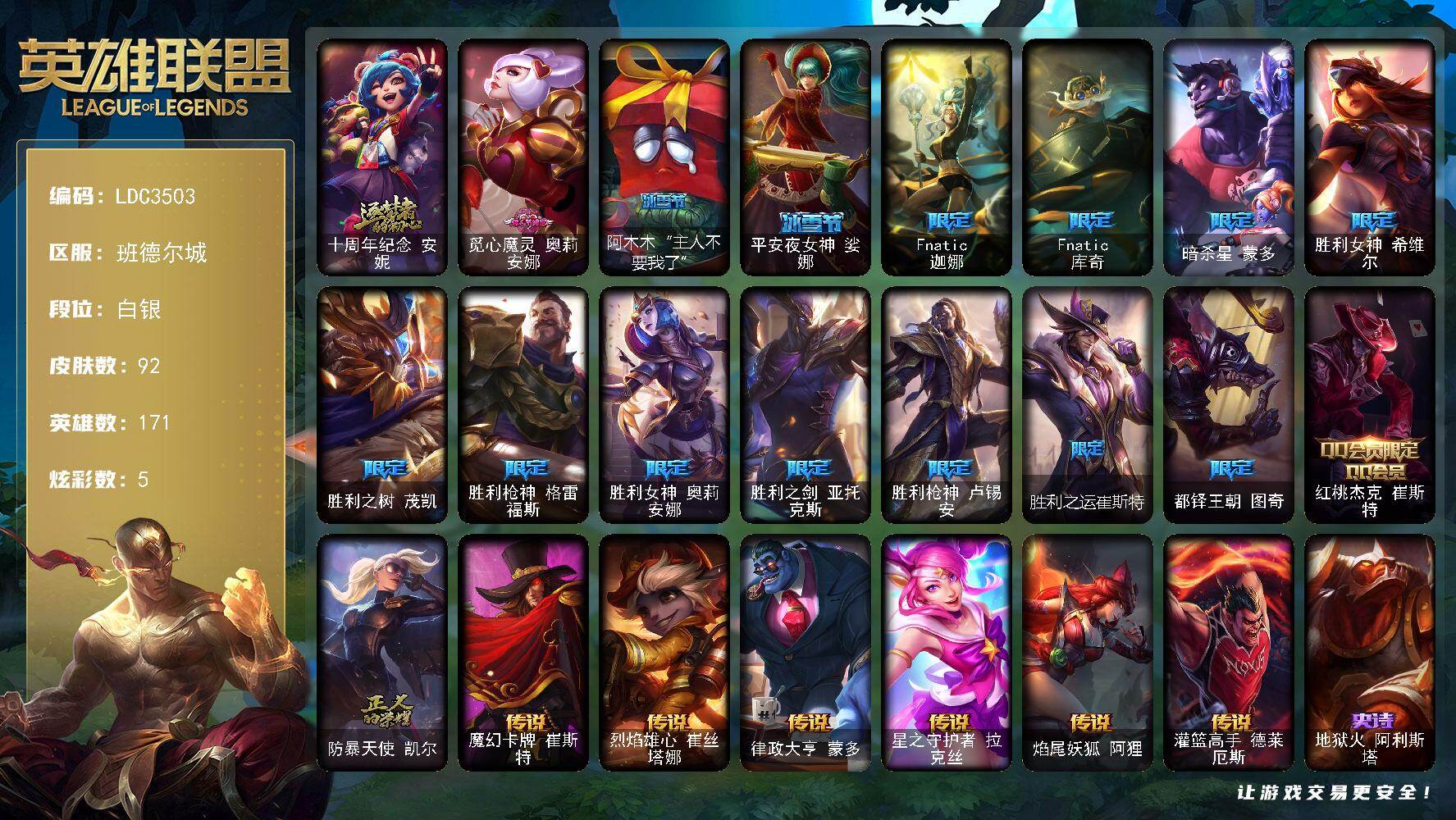 【719842】【LDC3503】171英雄/92皮肤/1神话/16限定/5炫彩/6传说/19史诗/白银账号等级:266/十周年纪念安妮/觅心魔灵奥莉安娜/阿木木:“主人不要我了”/平安夜女神娑娜/Fnatic迦娜/Fnatic库奇/暗杀星蒙多/胜利女神希维尔/胜利之树茂凯/胜利枪神格雷福斯/胜利女神奥莉安娜/胜利之剑亚托克斯/胜利枪神卢锡安/胜利之运崔斯特/都铎王朝图奇/红桃杰克崔斯特/防暴天