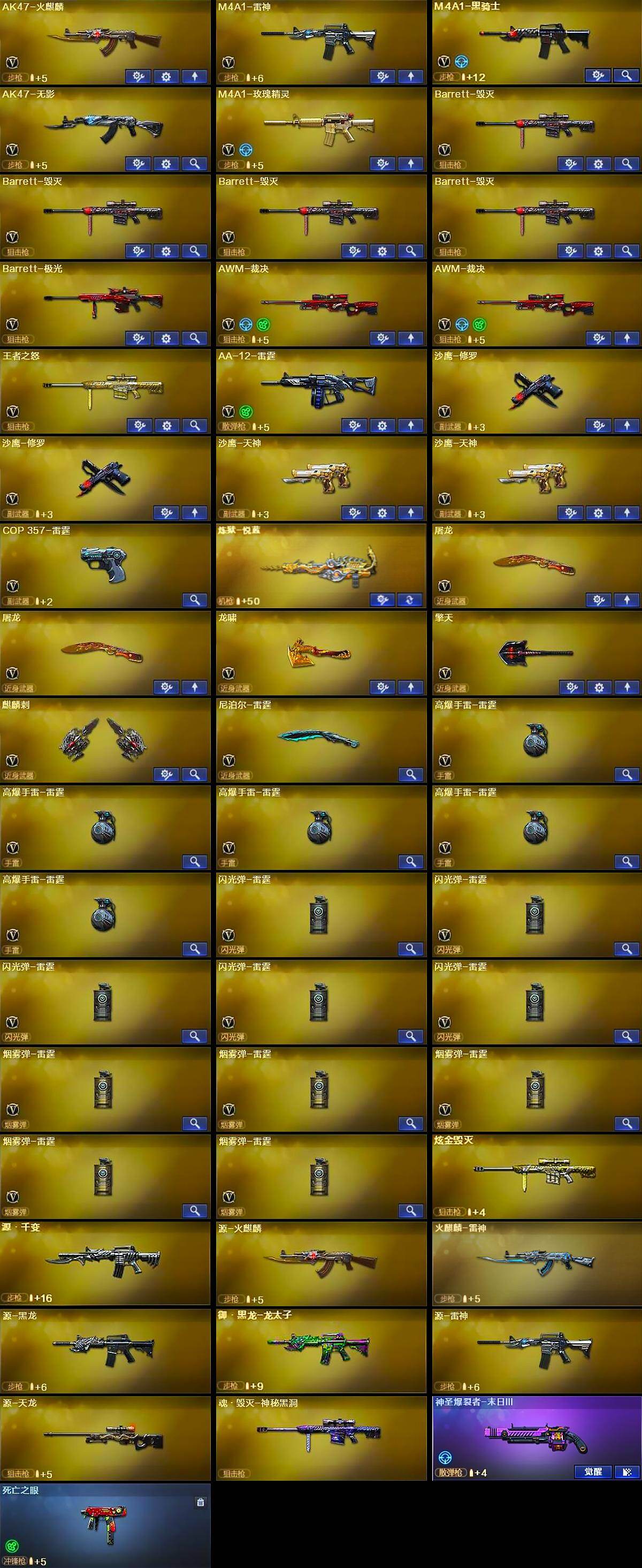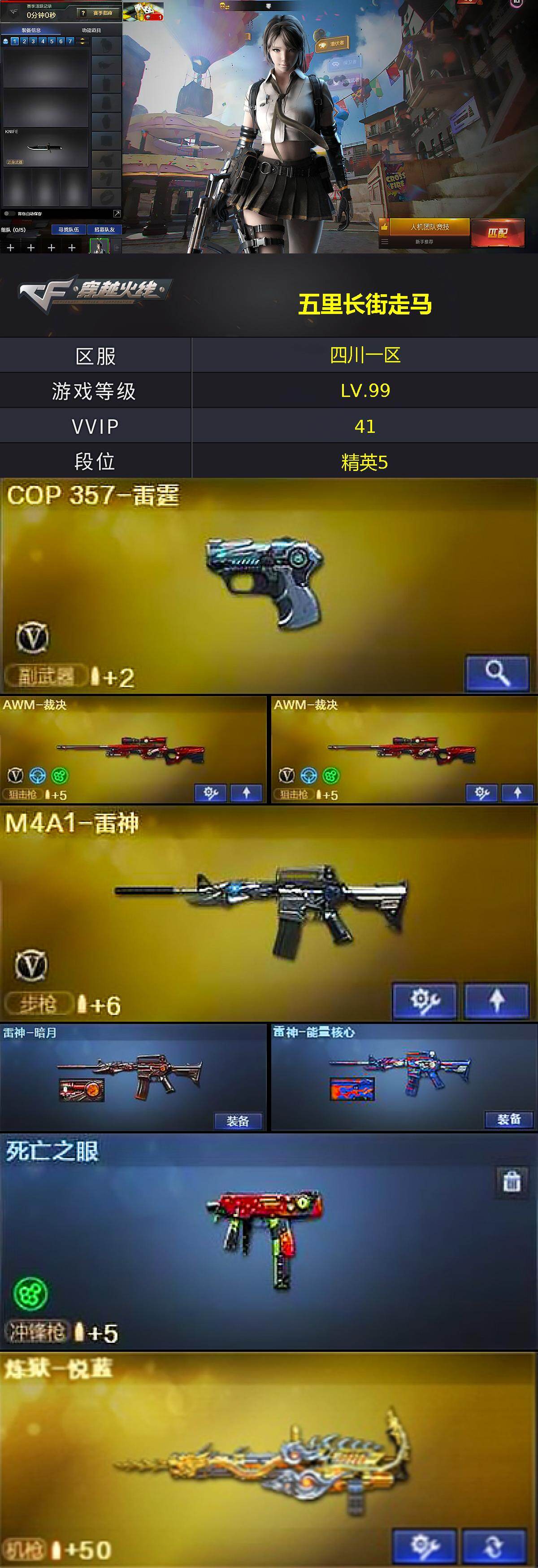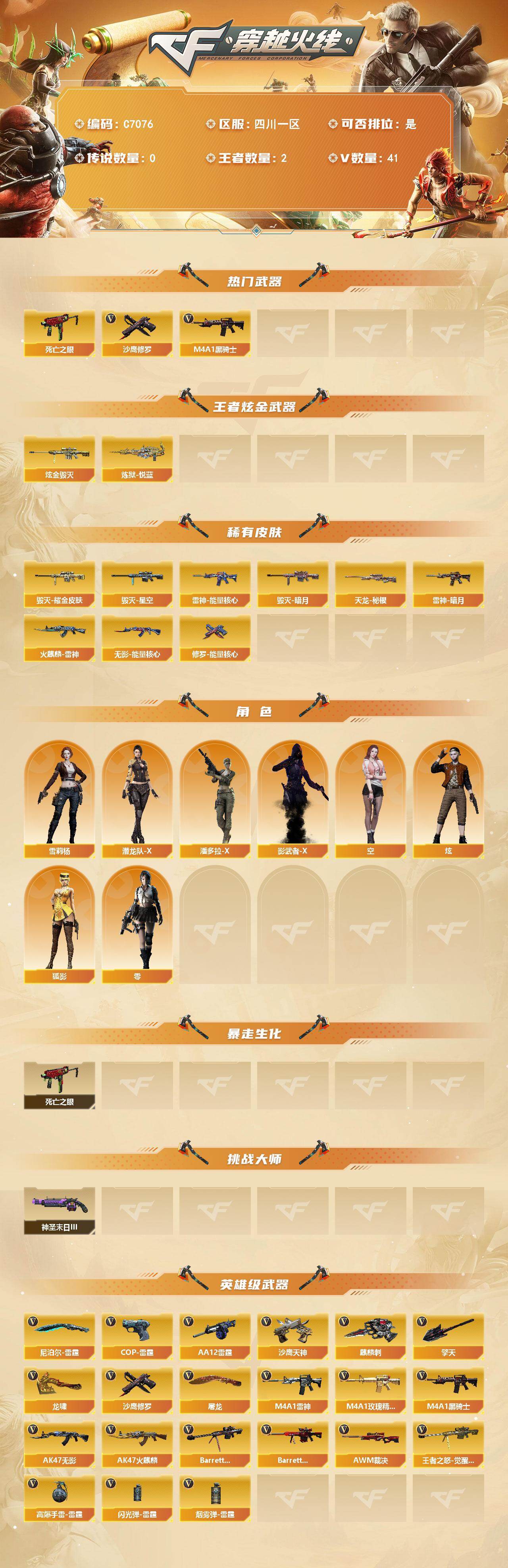 【759854】【C7076】四川一区-42V-2王者武器数-1炫金武器数【热门武器】:死亡之眼,M4A1-黑骑士,沙鹰-修罗*2【王者炫金武器】:炼狱-悦蓝,炫金毁灭【皮肤】:雷神-暗月,雷神-能量核心,火麒麟-雷神,毁灭-暗月,毁灭耀金皮肤,毁灭-星空,无影-能量核心,天龙-秘银*2,修罗-能量核心【角色】:零,炫,狐影,空,潘多拉-X,潜龙队-X,雪莉杨,影武者-X【暴走生化】:死亡之眼【