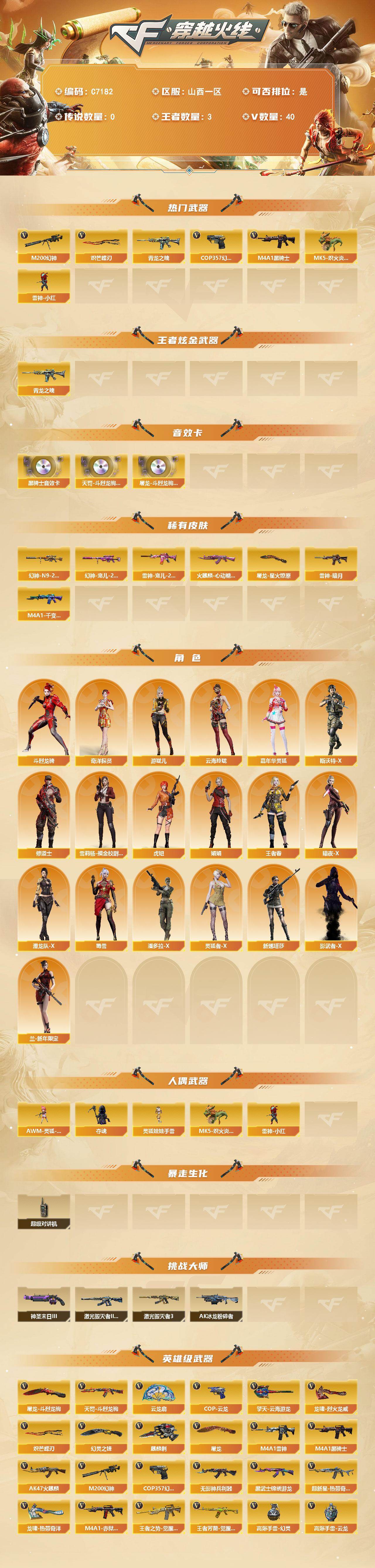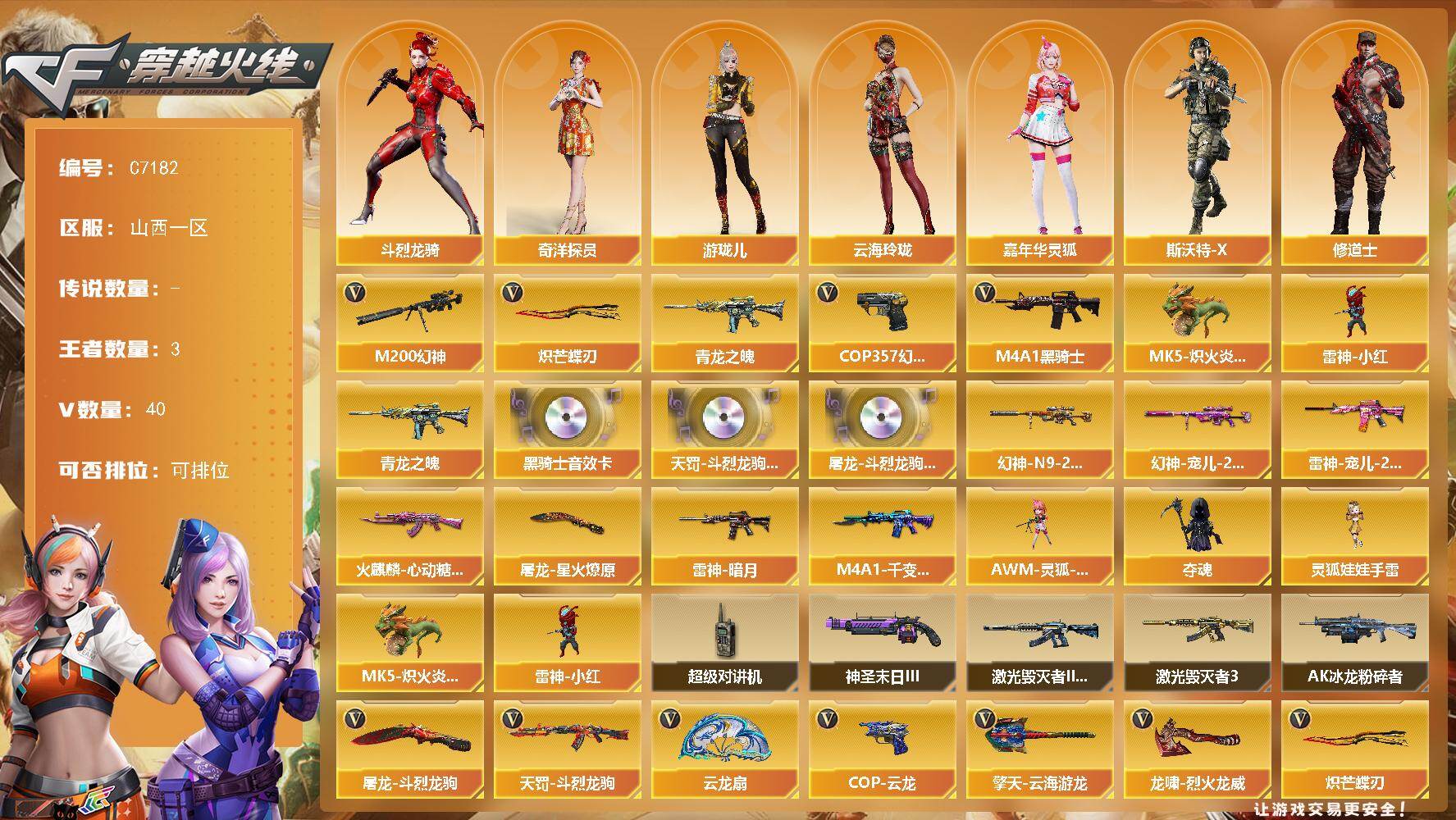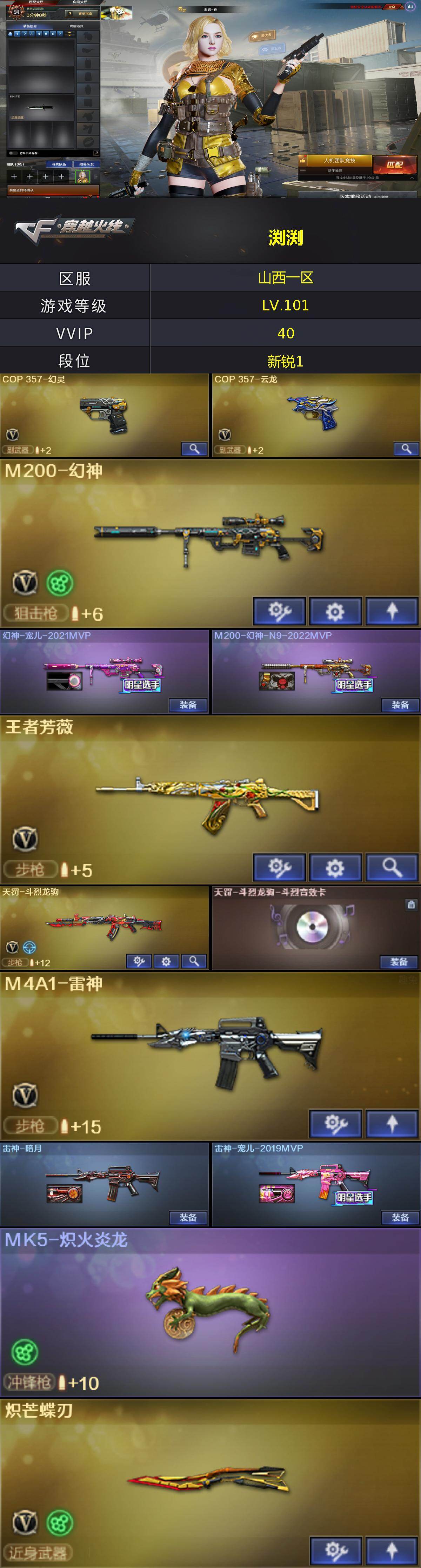 【761104】【761104】【C7182】山西一区-39V-3王者武器数-0炫金武器数【热门武器】:M200-幻神,青龙之魄,M4A1-黑骑士,MK5-炽