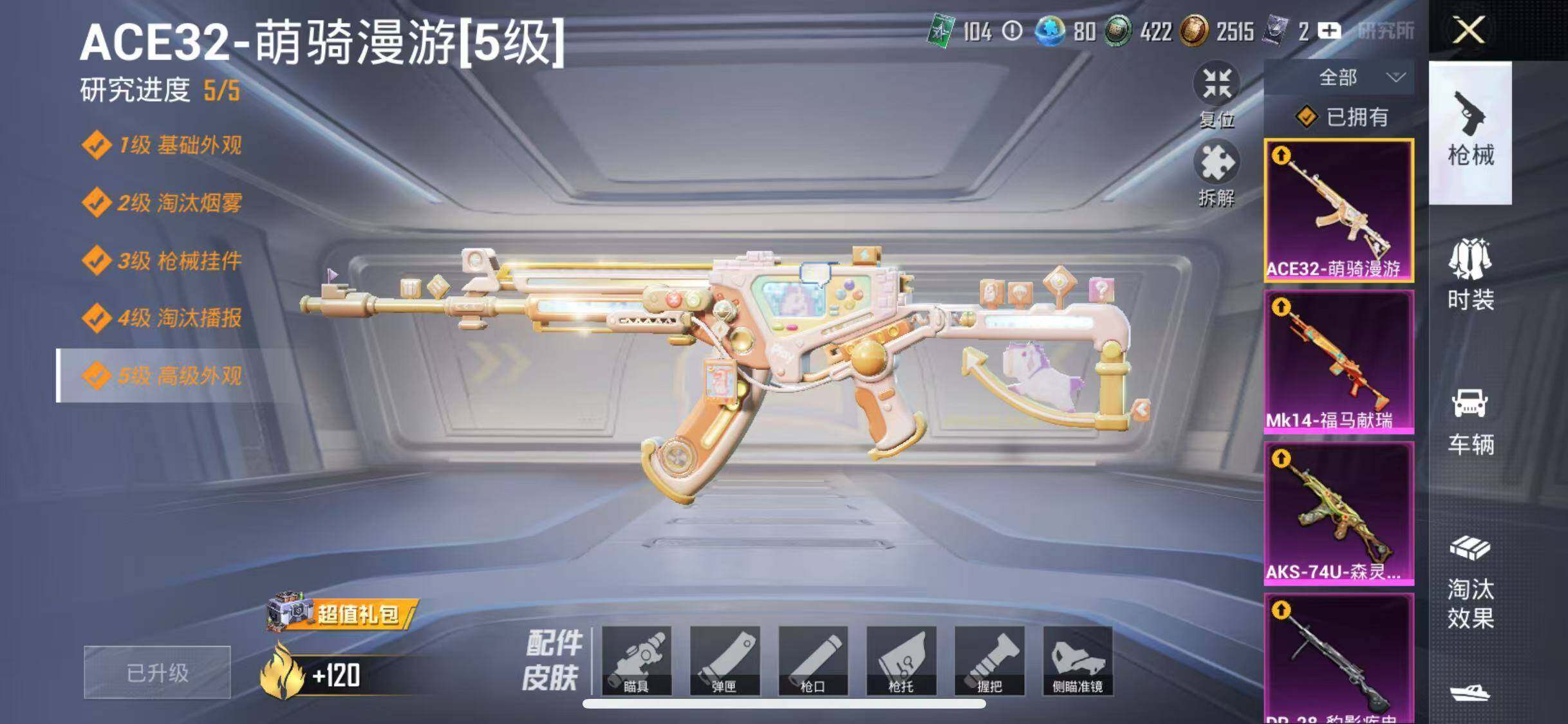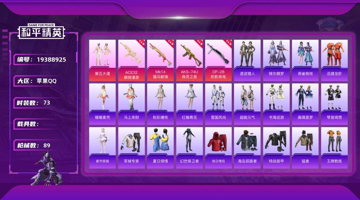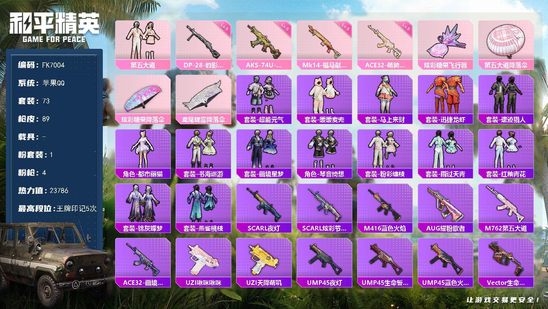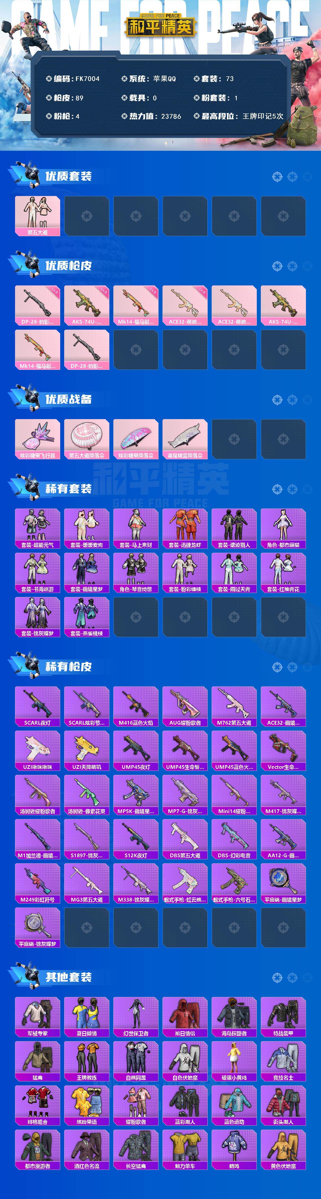 【762772】[19388925]【FK7004】73套装/枪械4/装备114/战备82/王牌印记5/热力值23786/五级ACE32-萌骑漫游/五级AKS-74U-森灵之息/五级MK14-福马献瑞/五级DP-28-豹影疾电/第五大道/ACE32-萌骑漫游/AKS-74U-森灵之息/MK14-福马献瑞/DP-28-豹影疾电/炫彩糖果飞行器/第五大道降落伞/炫彩糖果降落伞/鸢尾珑雾降落伞/超能元