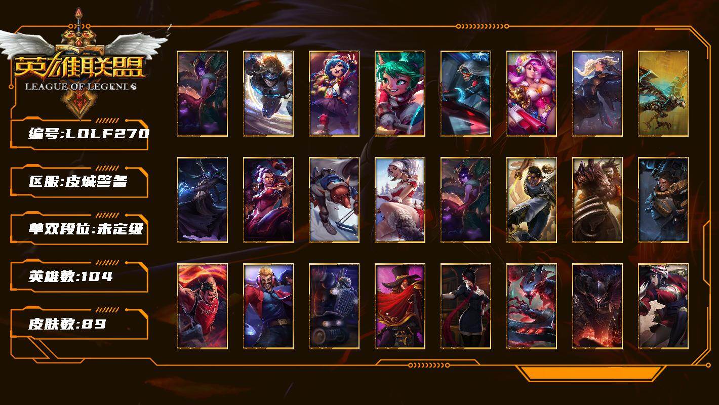 【5169918】【LOLF270】104英雄/89皮肤/1炫彩/未定级/十周年纪念安妮/未来战士伊泽瑞尔/波比的巧克力工坊/新创战纪希维尔/电玩女神厄运小姐/防暴天使凯尔/钢铁之翼艾尼维亚/灵魂收割者索拉卡/SKTT1薇恩/SSW图奇/雪装奈德丽/紫金罗刹莫甘娜/苍穹之光韦鲁斯/恶魔之刃泰达米尔/钢铁军团盖伦/灌篮高手德莱厄斯/金牌主播德莱文/陆地王者4WD布里茨/魔幻卡牌崔斯特/女校长菲奥娜