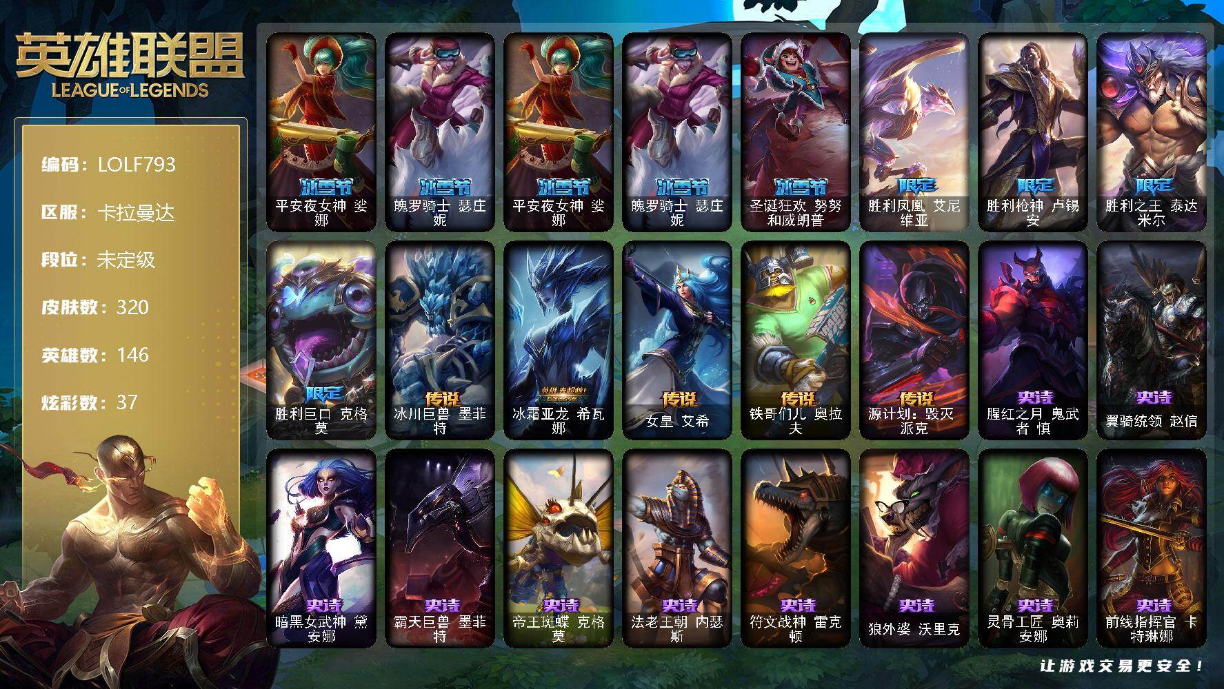 【LOLF793】146英雄/320皮肤/2神话/48限定/37炫彩/27传说/91史诗/未定级/平安夜女神娑娜/魄罗骑士瑟庄妮/平安夜女神娑娜/魄罗骑士瑟庄妮/圣诞狂欢努努和威朗普/胜利凤凰艾尼维亚/胜利枪神卢锡安/胜利之王泰达米尔/胜利巨口克格莫/冰川巨兽墨菲特/冰霜亚龙希瓦娜/女皇艾希/铁哥们儿奥拉夫/源计划毁灭派克/暗黑女武神黛安...