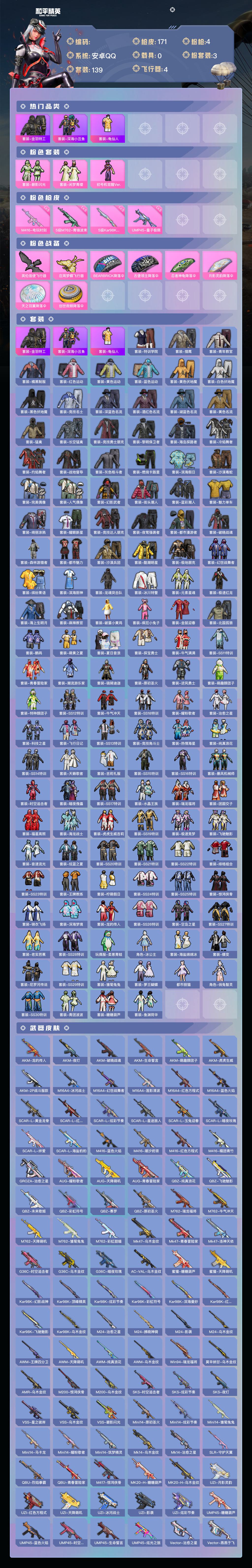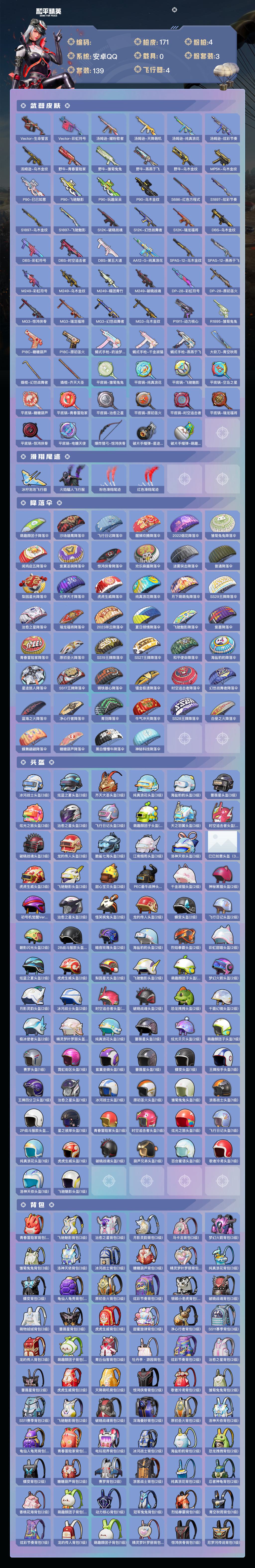 古堡领主降落伞,天之羽翼降落伞,忍者神龟降落伞,创世救赎降落伞,BEARBRICK降落伞,AKM-2P战斗服款,AKM-夜灯,AKM-生命誓言,AKM-破晓战魂,AKM-萌趣颜团子,AKM-虎虎生威,AKM-龙的传人,AUG-天降萌叽,AUG-耀粉歌者,AUG-青春冒险家,AWM-王牌四分卫,DBS-彩虹符号,DBS-时空追击者,...