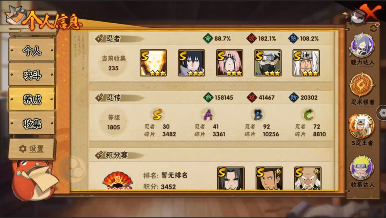 [7822754]【保证金商户】【编号56452 V12白嫖6245金币/707点卷/忍法帖已开】【30S忍者准32S忍者41A忍者1398W战力】 九喇嘛鸣人 永恒佐助 忍战小樱 须佐卡卡西 自来也 舞杰自来也 大蛇丸 纲手 S门凯 水门 日斩 创立柱间 秽土柱间 秽土解斑 须佐鼬 秽土鼬 须佐止水 神秘面具男 白面具 忍战带土 红夜面具男 罗砂 忍战艾...