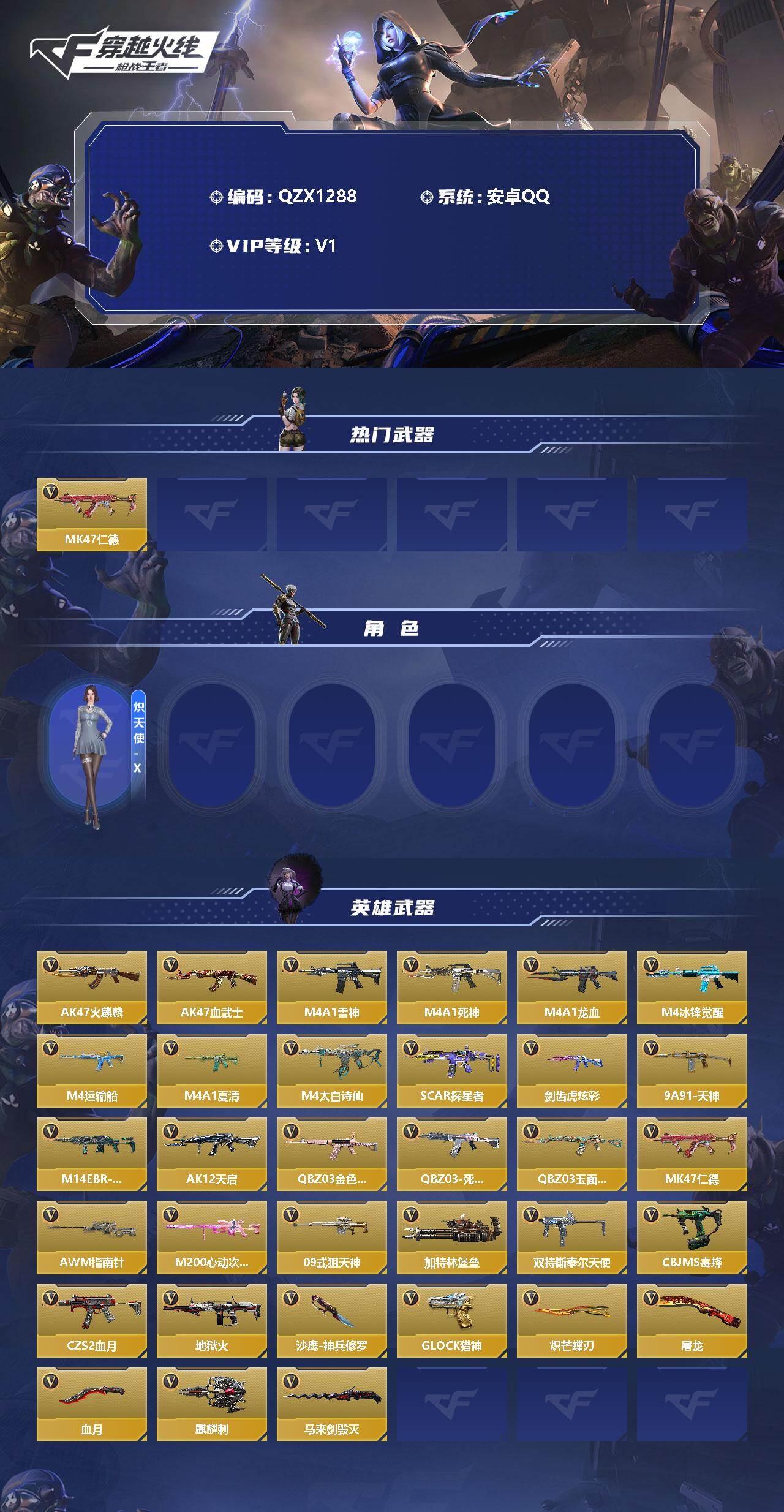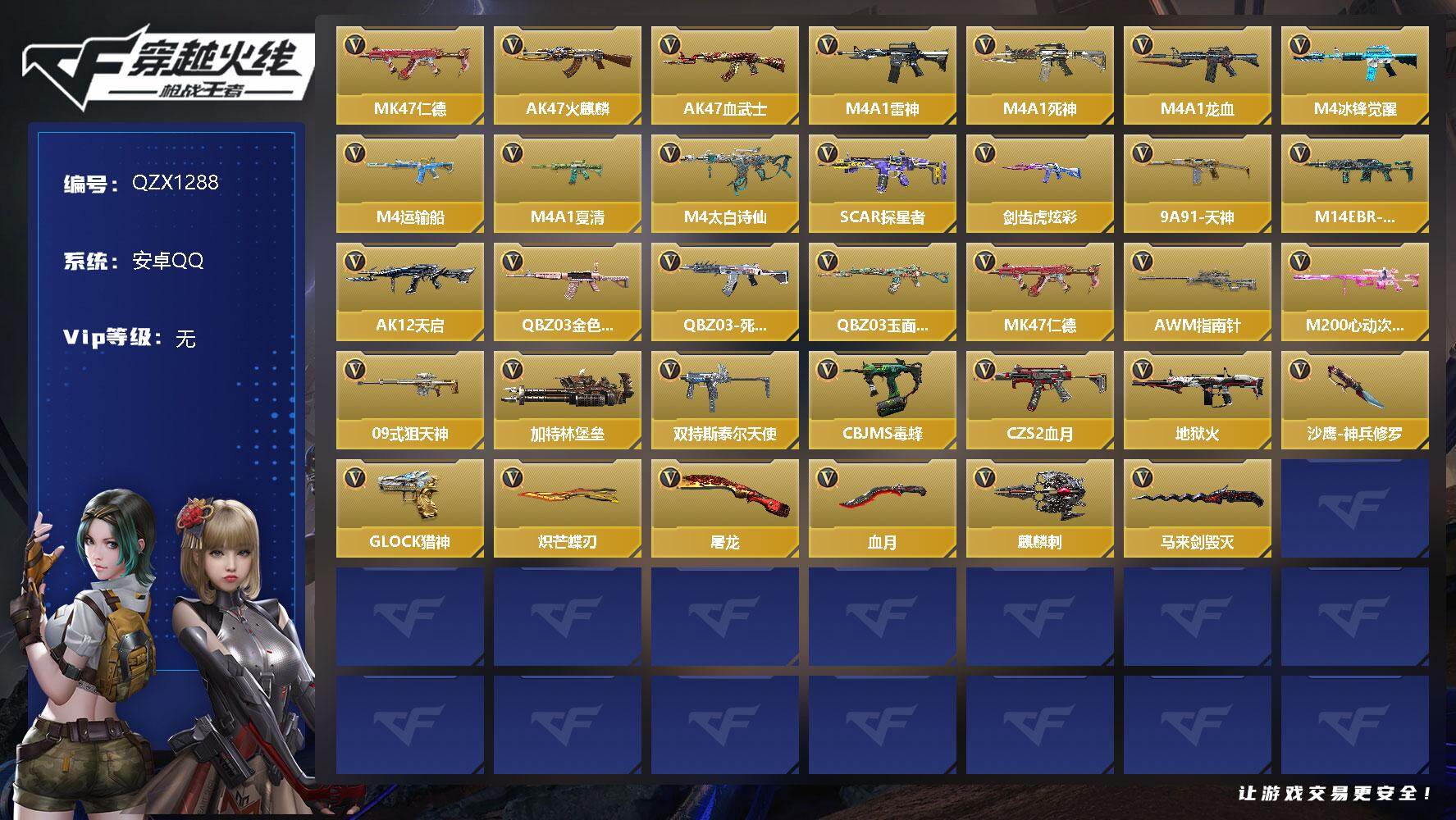 【9893813】【QZX1288】VIP1/70V/MK47-仁德/炽天使-X/火麒麟/AK47-血武士/雷神/M4A1-死神/M4A1-龙血/M4A1-冰锋觉醒/M4A1-运输船/M4A1-夏清/M4A1-太白诗仙/SCAR-探星者/剑齿虎-炫彩/9A91-天神/M14EBR-玄武/AK12-天启/QBZ03-金色蔷薇/QBZ03-死神/QBZ03-玉面羞花/MK47-仁德/AWM-指南针/