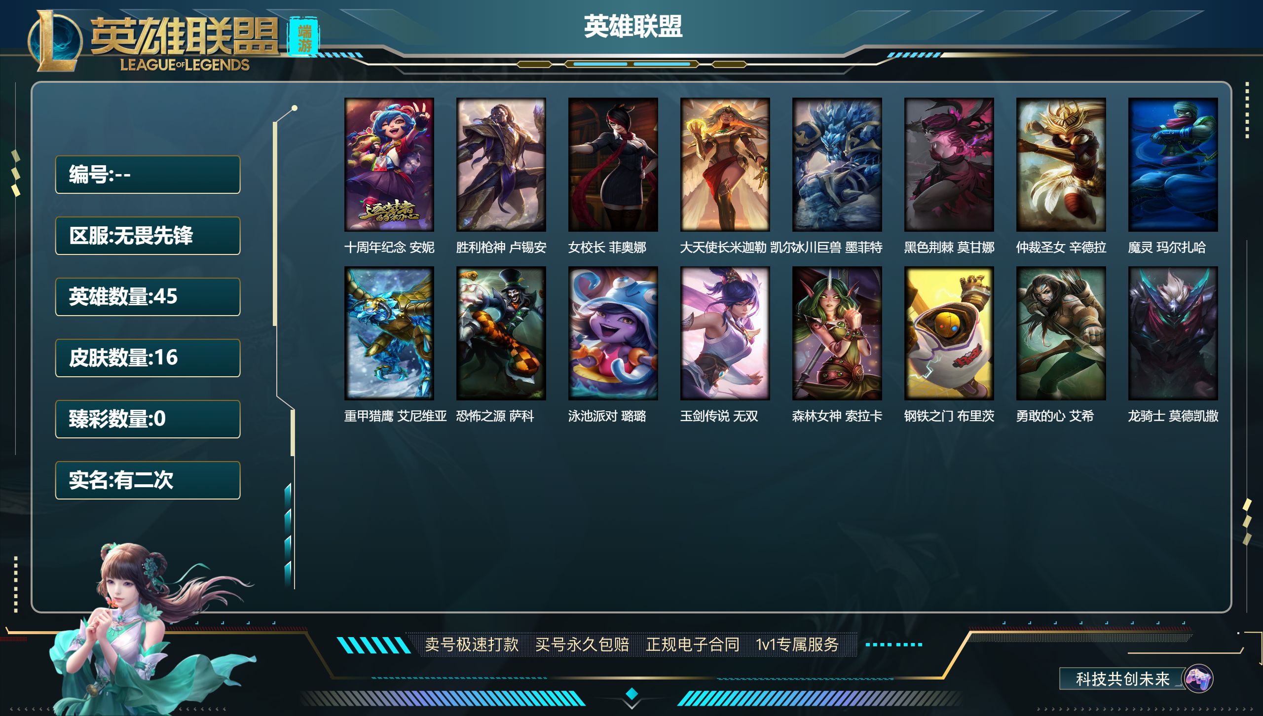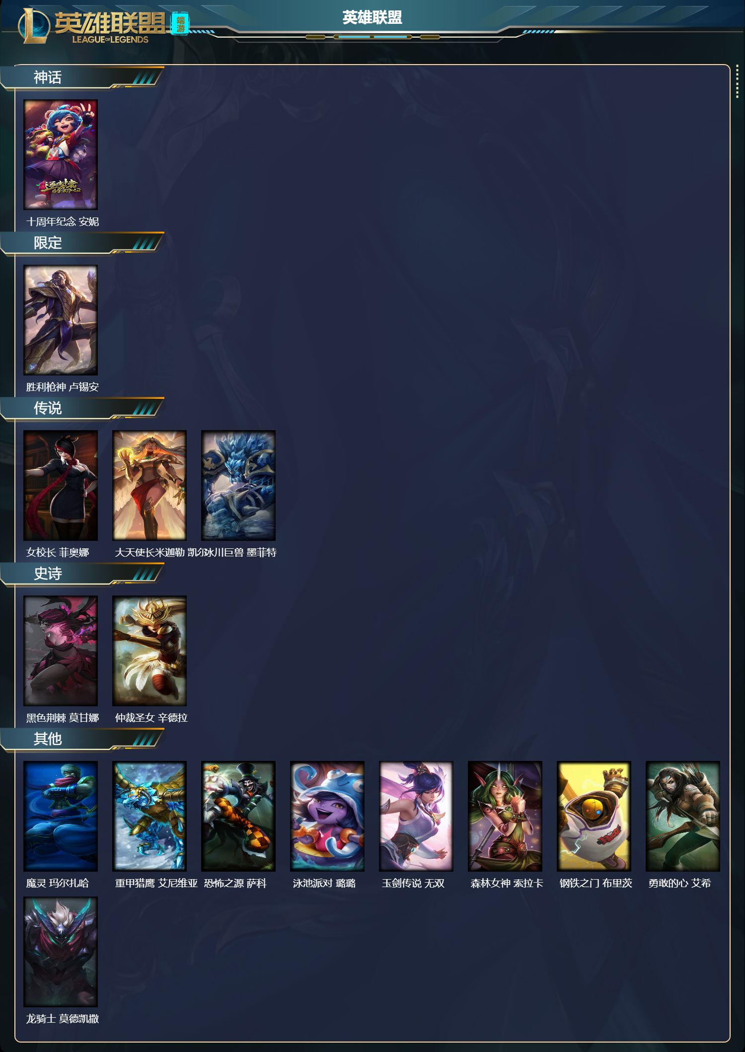 【10341175】XD~X1279 45英雄-16皮肤-1炫彩-段位:白银 十周年纪念 安妮 胜利枪神 卢锡安 女校长 菲奥娜 大天使长米迦勒 凯尔 冰川巨兽 墨菲特 黑色荆棘 莫甘娜 仲裁圣女 辛德拉 魔灵 玛尔扎哈 重甲猎鹰 艾尼维亚 恐怖之源 萨科 泳池派对 璐璐 玉剑传说 无双 森林女神 索拉卡 钢铁之门 布里茨 勇敢的心 艾希 龙骑士 莫德凯撒