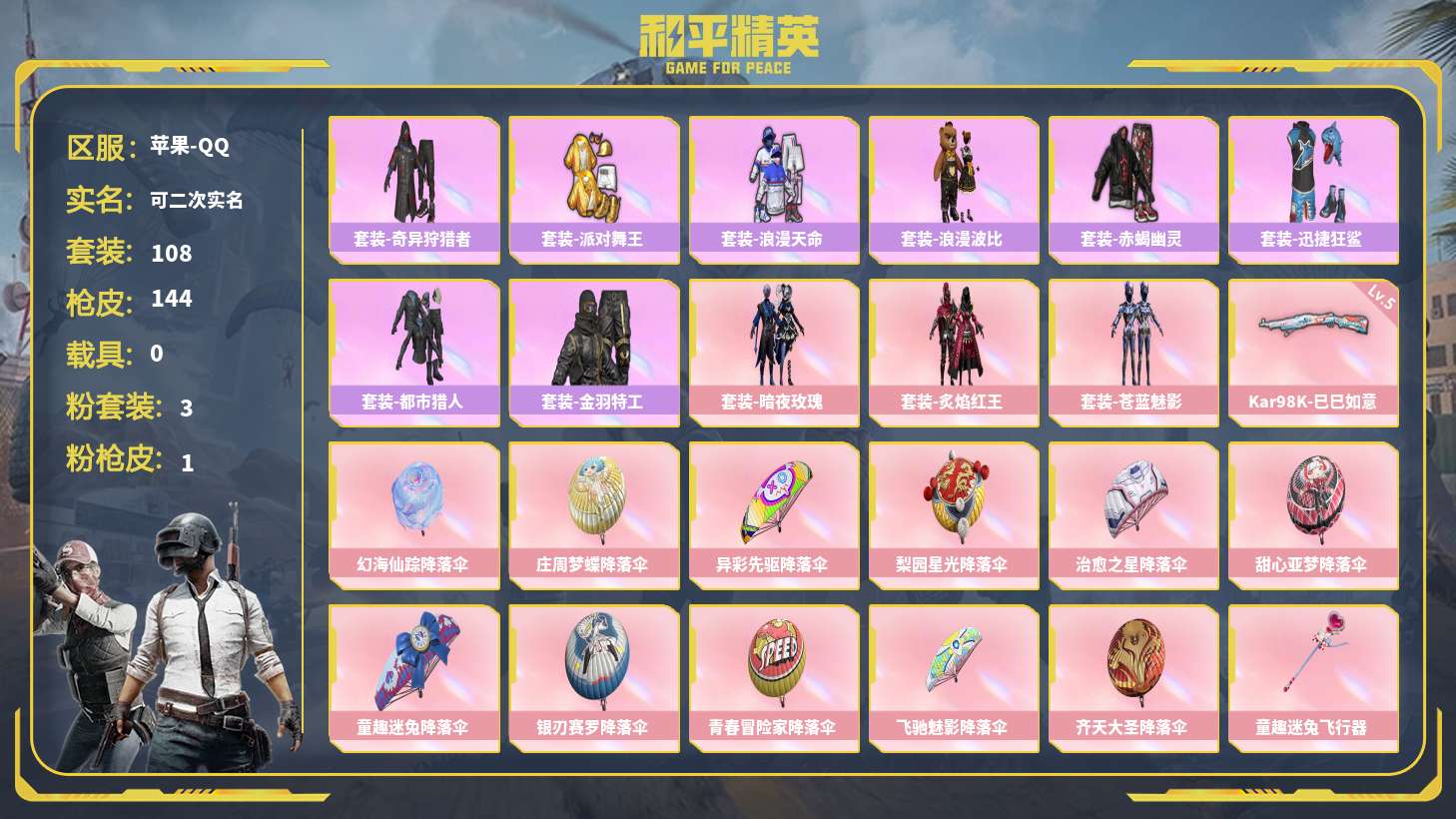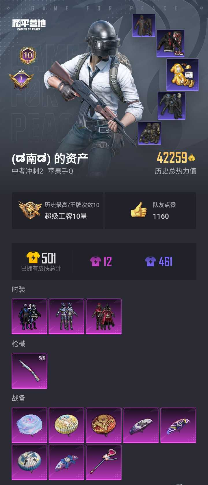 【10388443】【和平精英】【LYHP7054】3粉装,1特效枪,0载具,历史最高段位:超级王牌10星 王牌印记10次 热力值:42259,108套装,144枪械,148装备,82战备;枪皮:AKM-影袭,AKM-缤纷海域,AKM-破晓战魂,AKM-夜灯,AKM-星之彼岸,AKM-彩虹符号,AKM-萌趣颜团子,AKM-虎虎生威,M16A4-蓝色火焰,M16A4-甜心亚梦,M16A4-幻世战舞