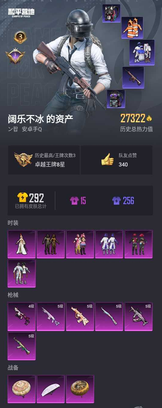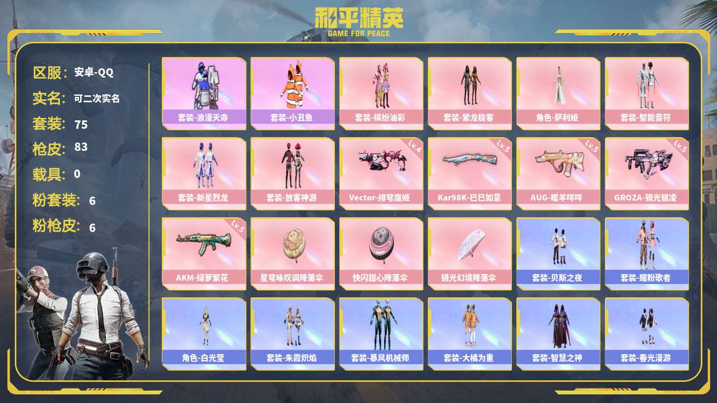 【10391360】【和平精英】【LYHP8125】6粉装,6特效枪,0载具,历史最高段位:卓越王牌8星 王牌印记3次 热力值:27432,75套装,83枪械,88装备,36战备;套装:套装-智能音符,套装-缤纷油彩,套装-放客神游,套装-新星烈龙,套装-繁龙极客,角色-萨利娅,套装-特训学院,套装-猎鹰,套装-青年教官,套装-橘黑制服,套装-红色运动,套装-黄色运动,套装-蓝色运动,套装-黄色