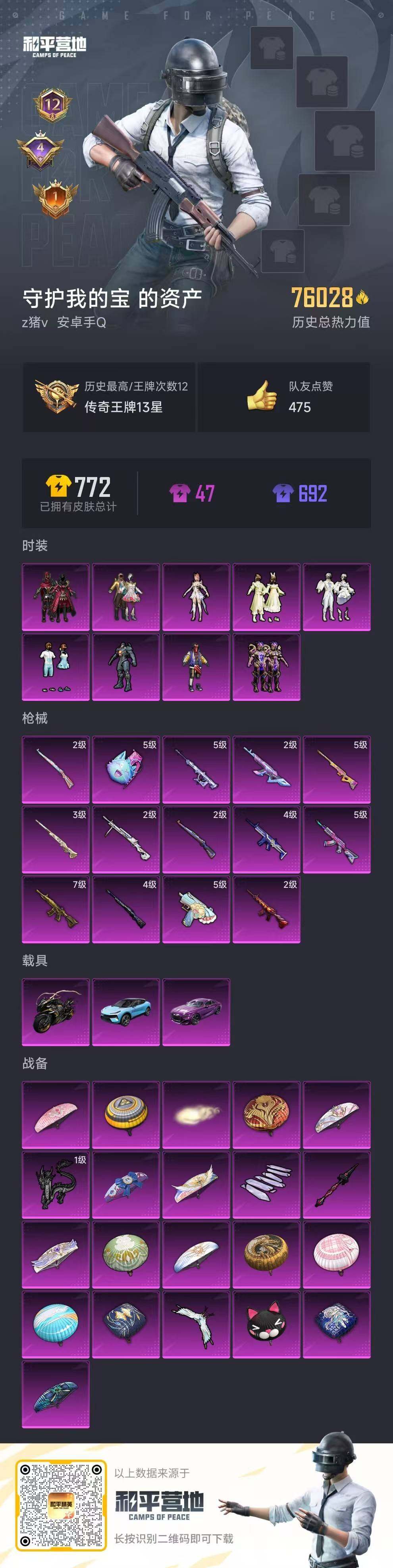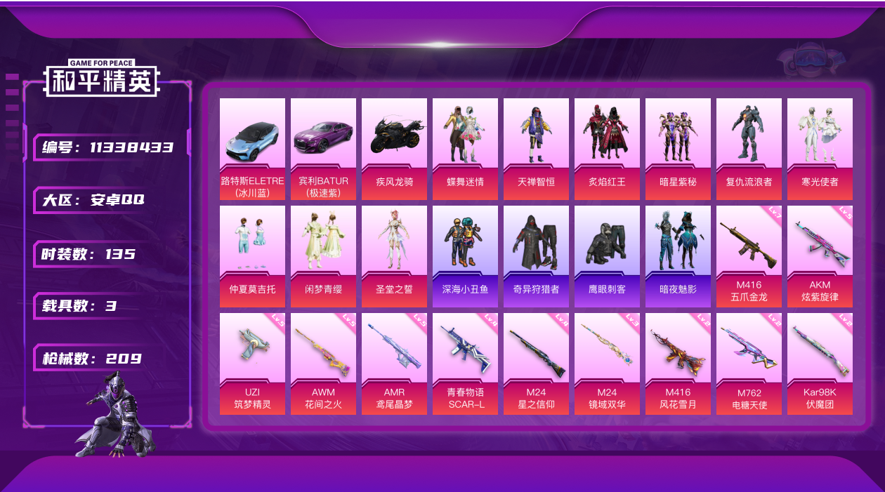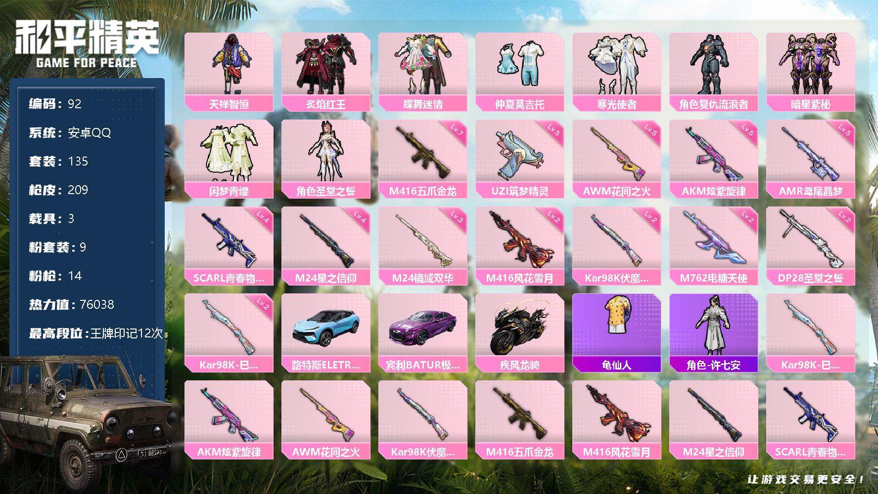 [11338433]【商品标题】:安卓 手Q-9粉装-14特效枪-3载具-76038热力值-12印记-135套装-209枪皮 【稀有载具】:路特斯ELETRE(冰川蓝),宾利BATUR(极速紫),疾风龙骑 【特效枪等级】:AKM-炫紫旋律(五级),SCAR-L-青春物语(四级),M416-五爪金龙(七级),M416-风花雪月(二级),M762-电糖天使(二级)...