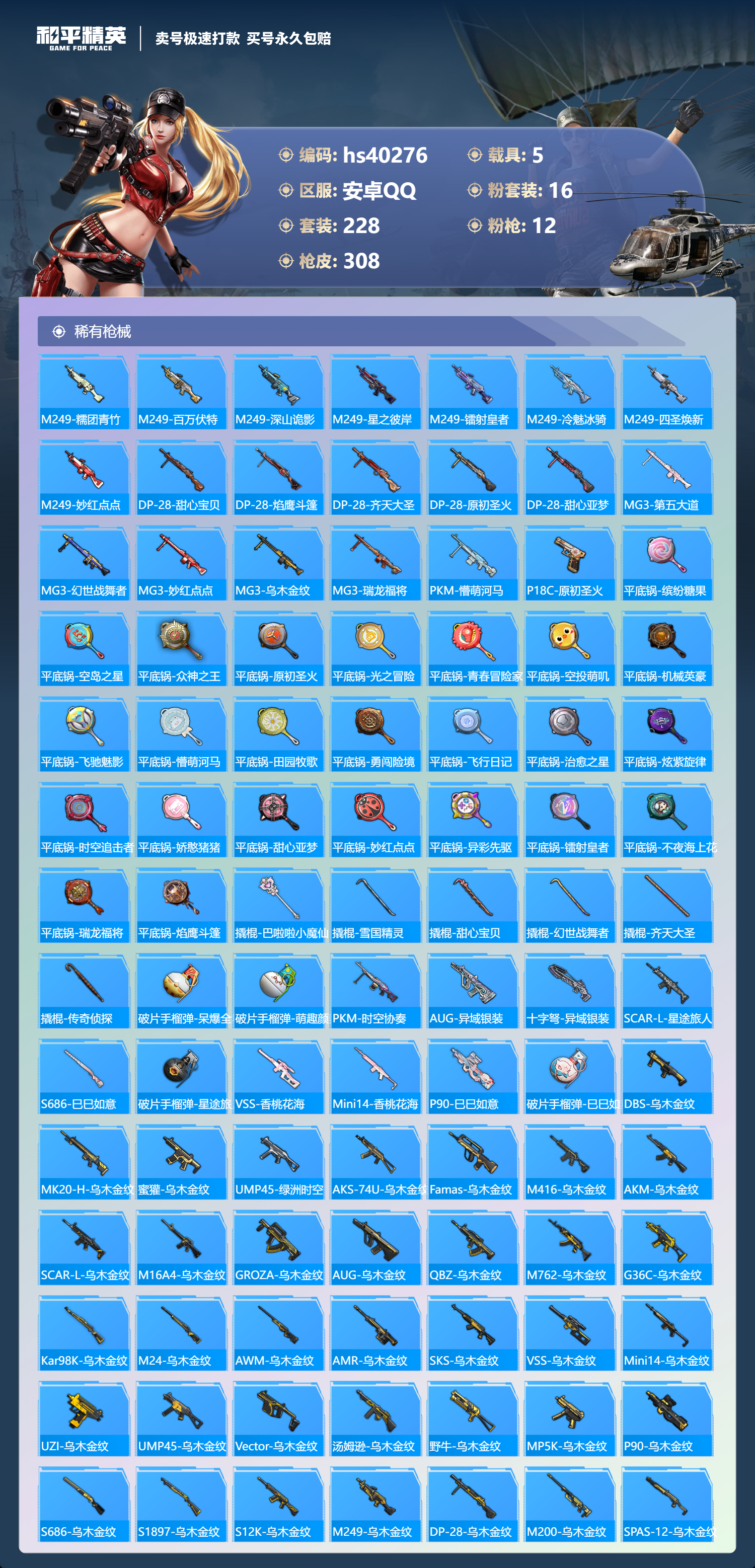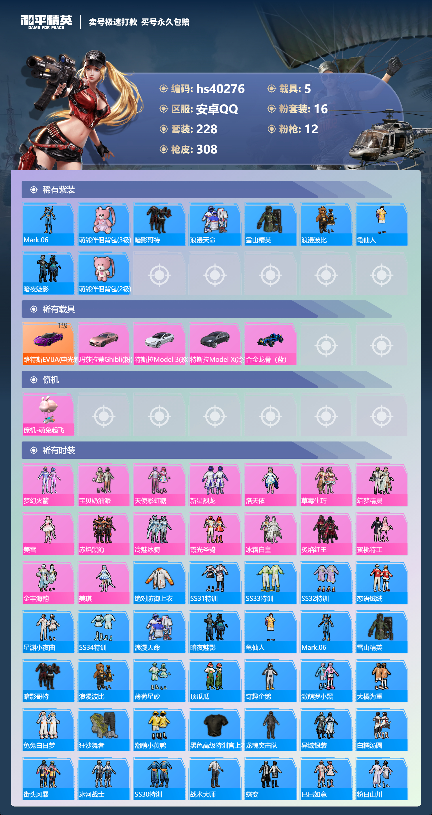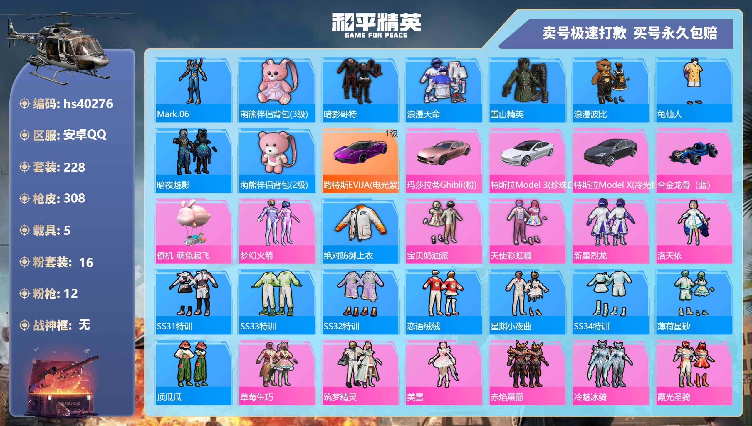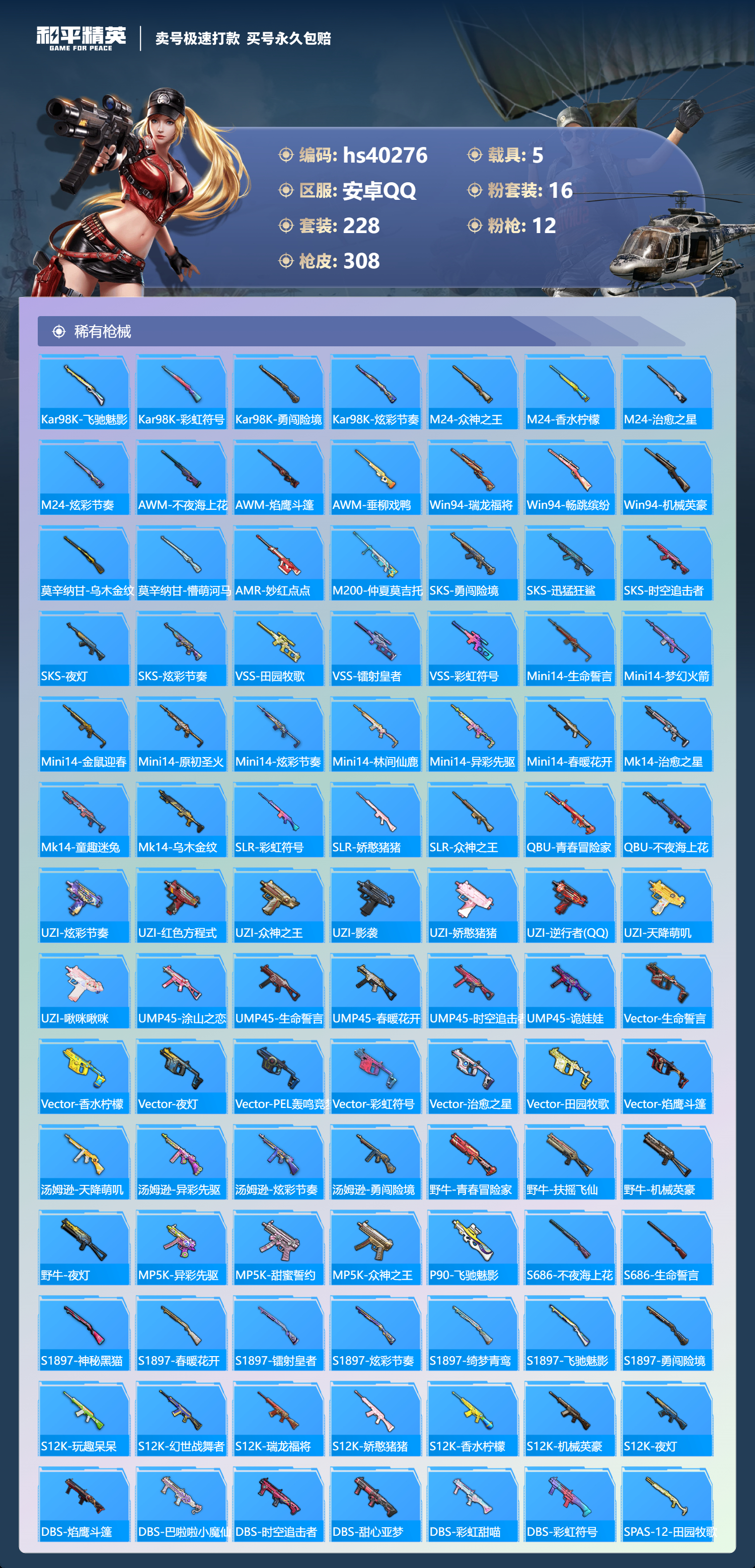 【10640592】【不可二次】【安卓QQ】合金龙骨蓝色 路特斯EV紫色 M762-甜蜜誓约 龟仙人 大橘为重 M762-奇异狩猎者 Mini14-林间仙鹿 MK47-林间仙鹿 M416-心之恋语 浪漫波比 Kar98K-伏魔团 纯梦嫁纱飞行翼 纯白誓言 AKM-奇异狩猎者 SS1特训 特斯拉3白色 M762-瑞龙福将 潮萌小黄鸭 SCAR-机甲封神 狂沙舞者 AKM-炫紫旋律 白月香洋装 DP