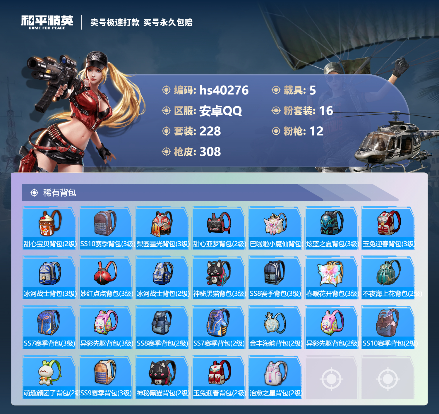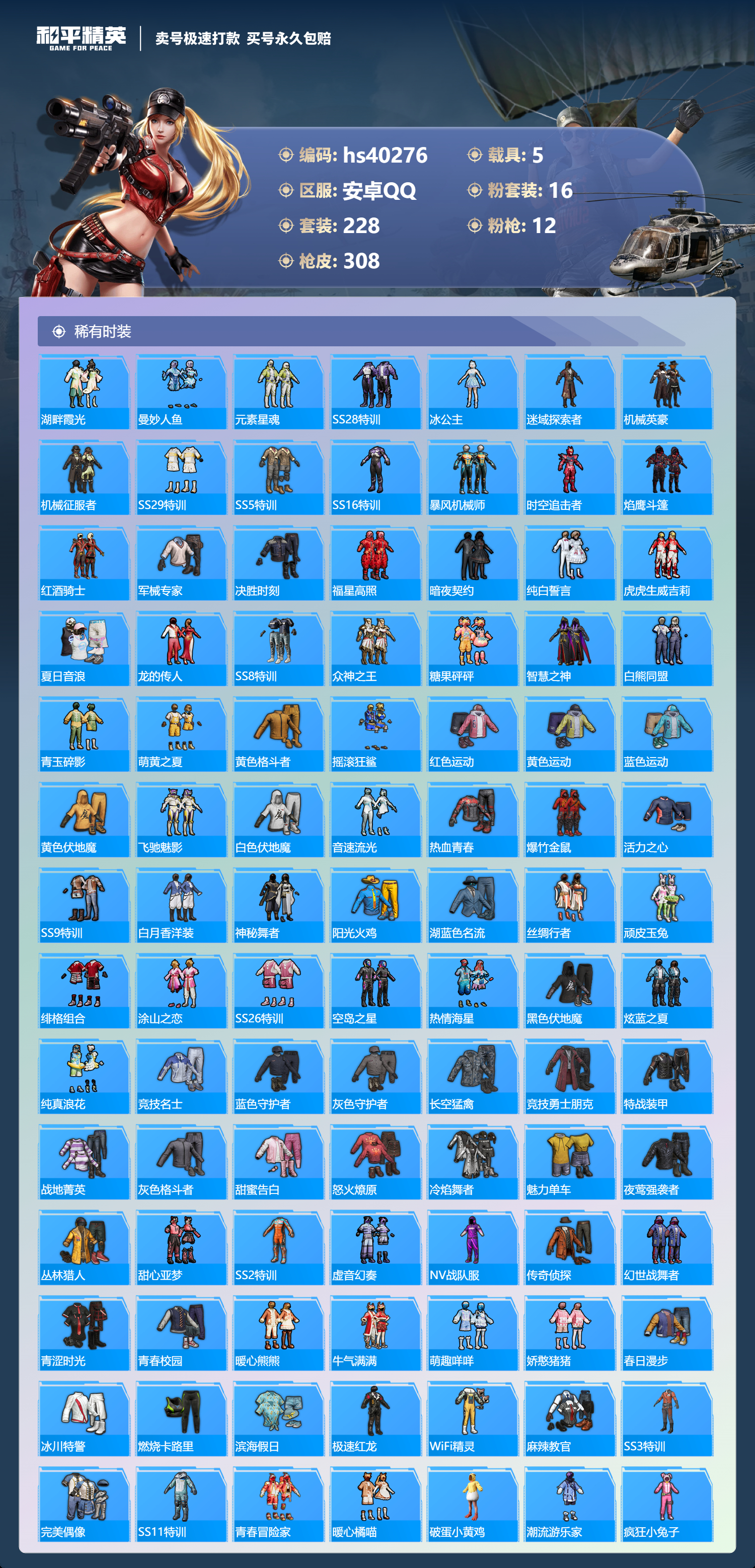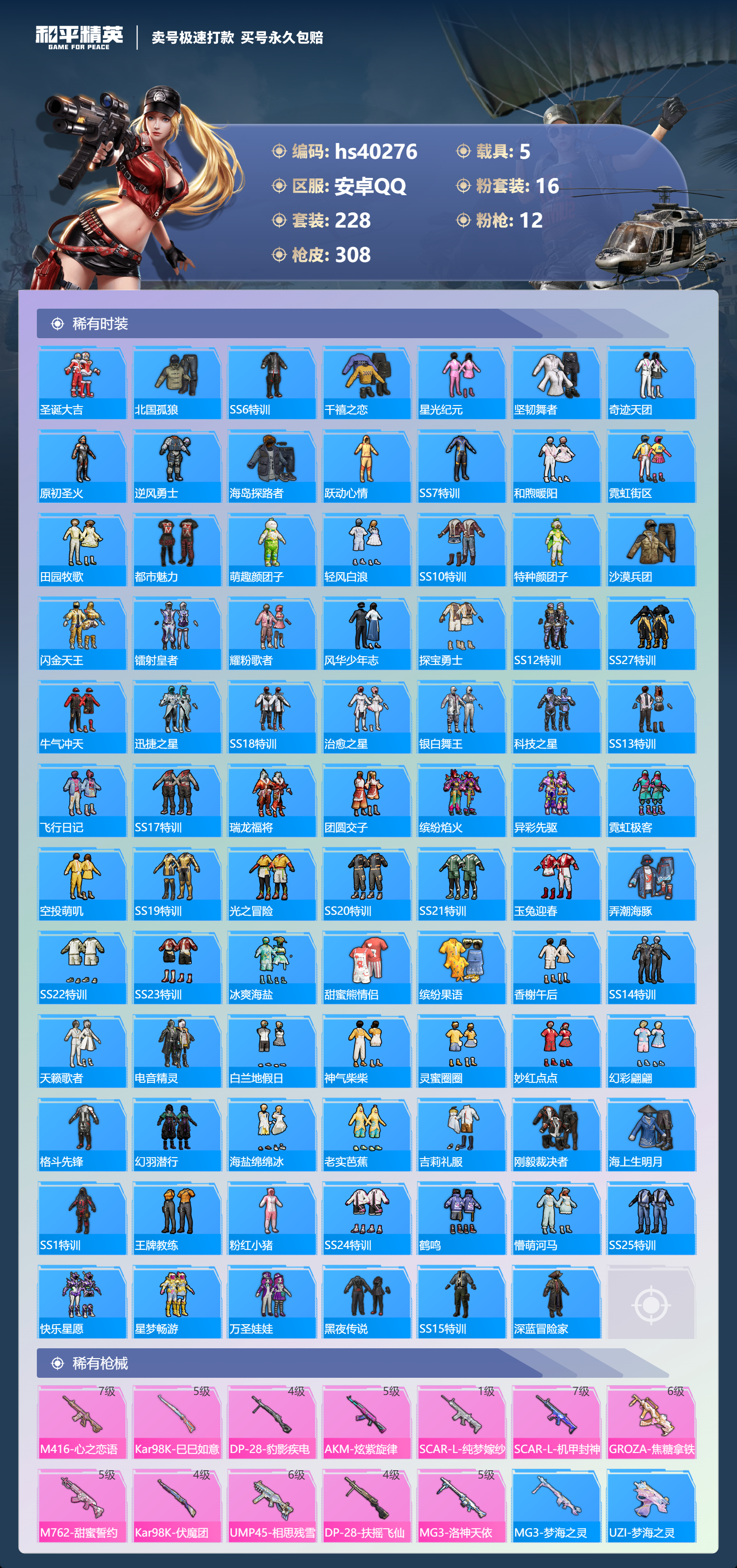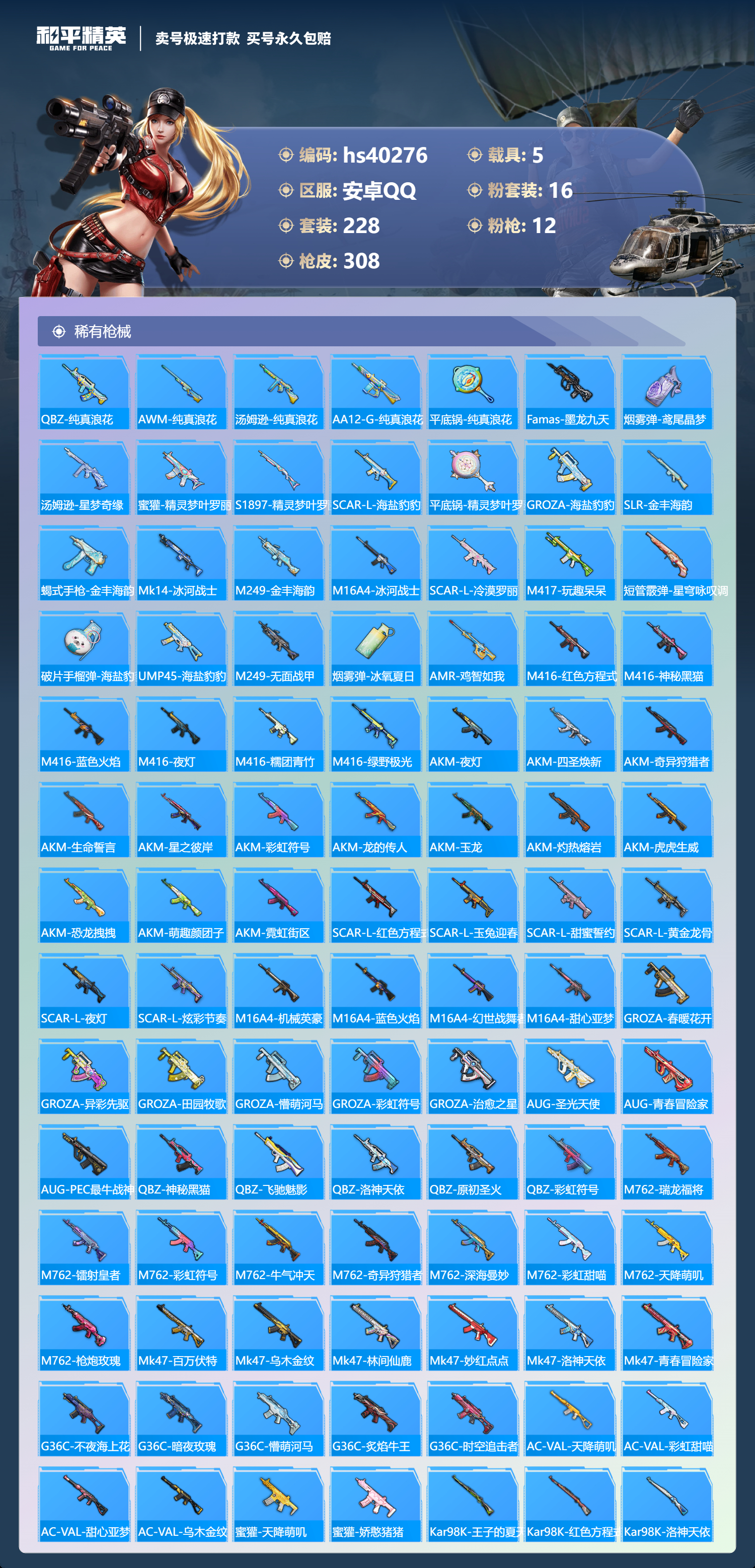 【10640592】【不可二次】【安卓QQ】合金龙骨蓝色 路特斯EV紫色 M762-甜蜜誓约 龟仙人 大橘为重 M762-奇异狩猎者 Mini14-林间仙鹿 MK47-林间仙鹿 M416-心之恋语 浪漫波比 Kar98K-伏魔团 纯梦嫁纱飞行翼 纯白誓言 AKM-奇异狩猎者 SS1特训 特斯拉3白色 M762-瑞龙福将 潮萌小黄鸭 SCAR-机甲封神 狂沙舞者 AKM-炫紫旋律 白月香洋装 DP