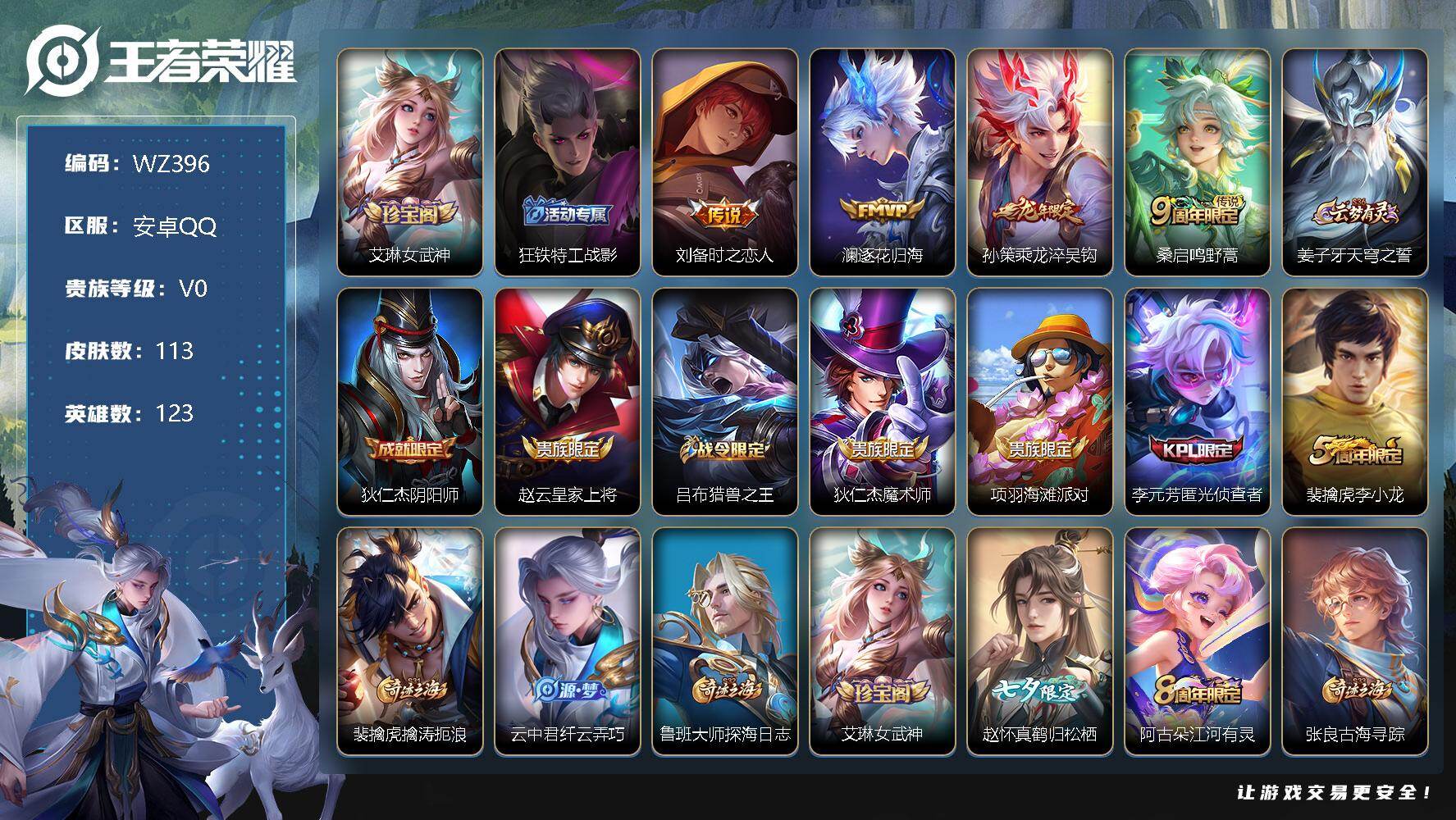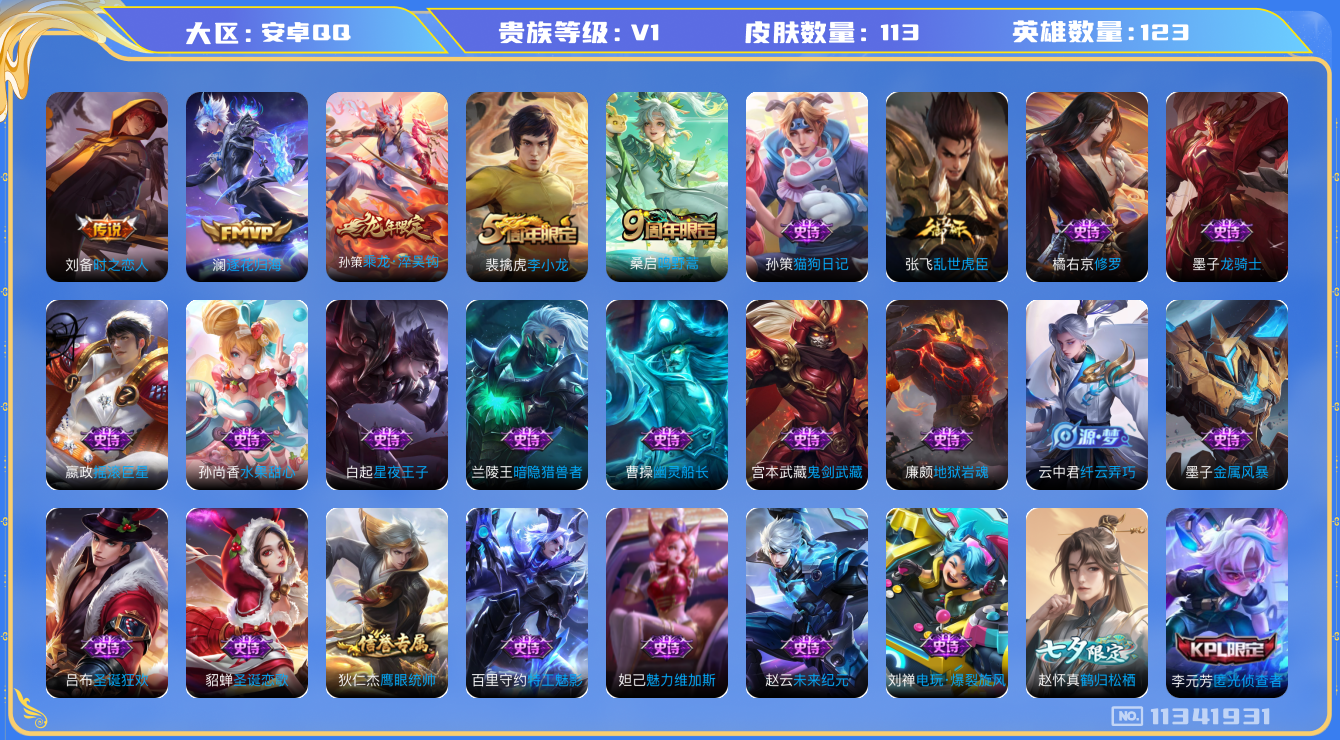 [11341931]【商品标题】:安卓Q-V0-永恒钻石III段位-123英雄-113皮肤-0典藏-0珍品无双-0无双-0珍品传说-4传说-30史诗 【内测皮肤】:艾琳女武神,狂铁特工战影 【传说皮肤】:刘备时之恋人,澜逐花归海,孙策乘龙淬吴钩,桑启鸣野蒿 【限定皮肤】:姜子牙天穹之誓,狄仁杰阴阳师,赵云皇家上将,吕布猎兽之王,狄仁杰魔...