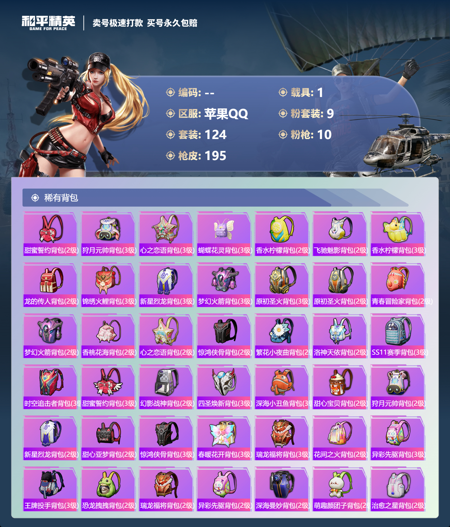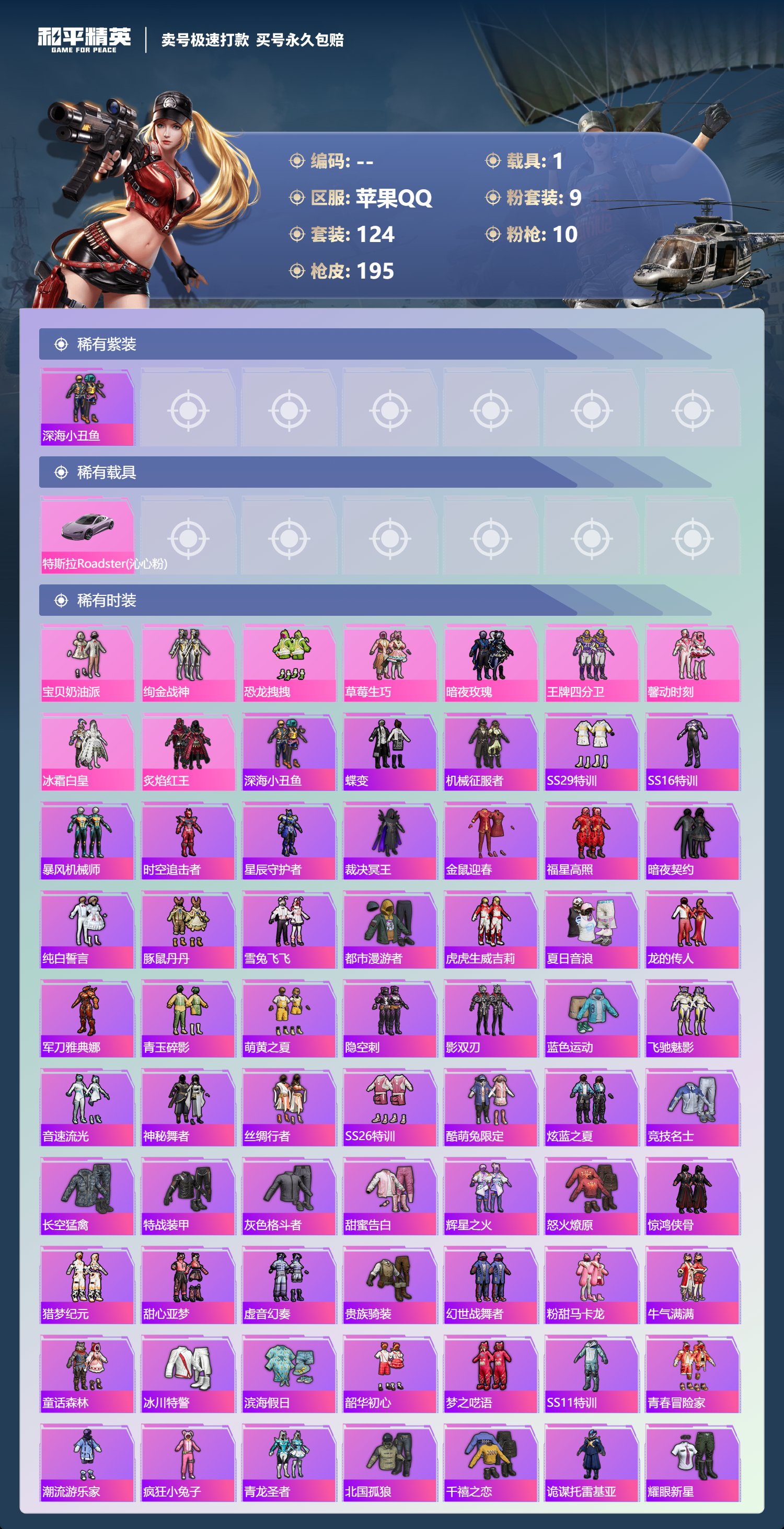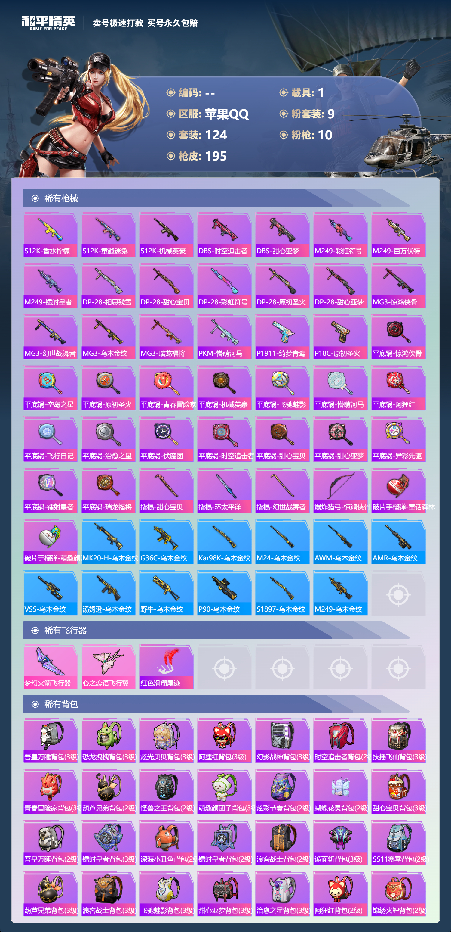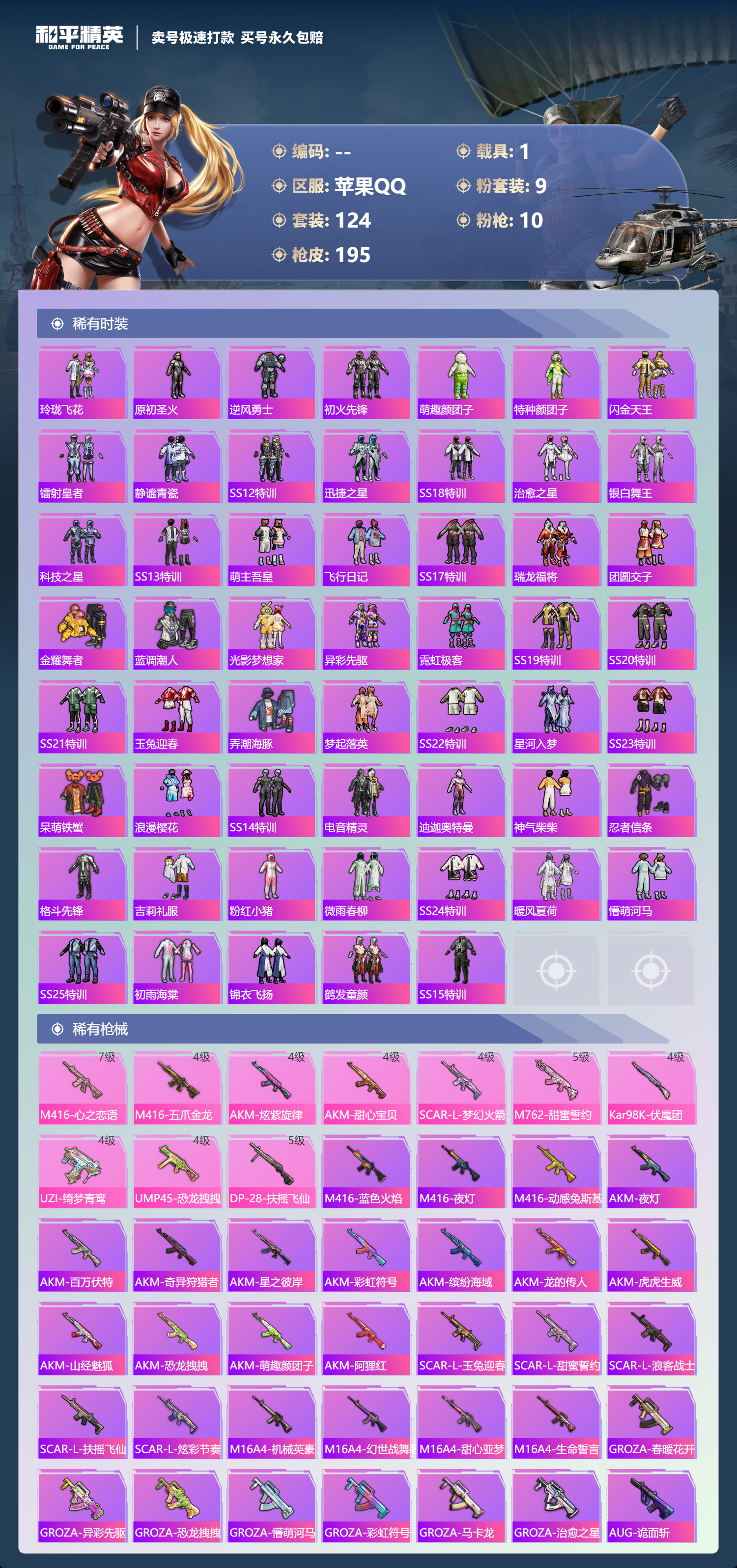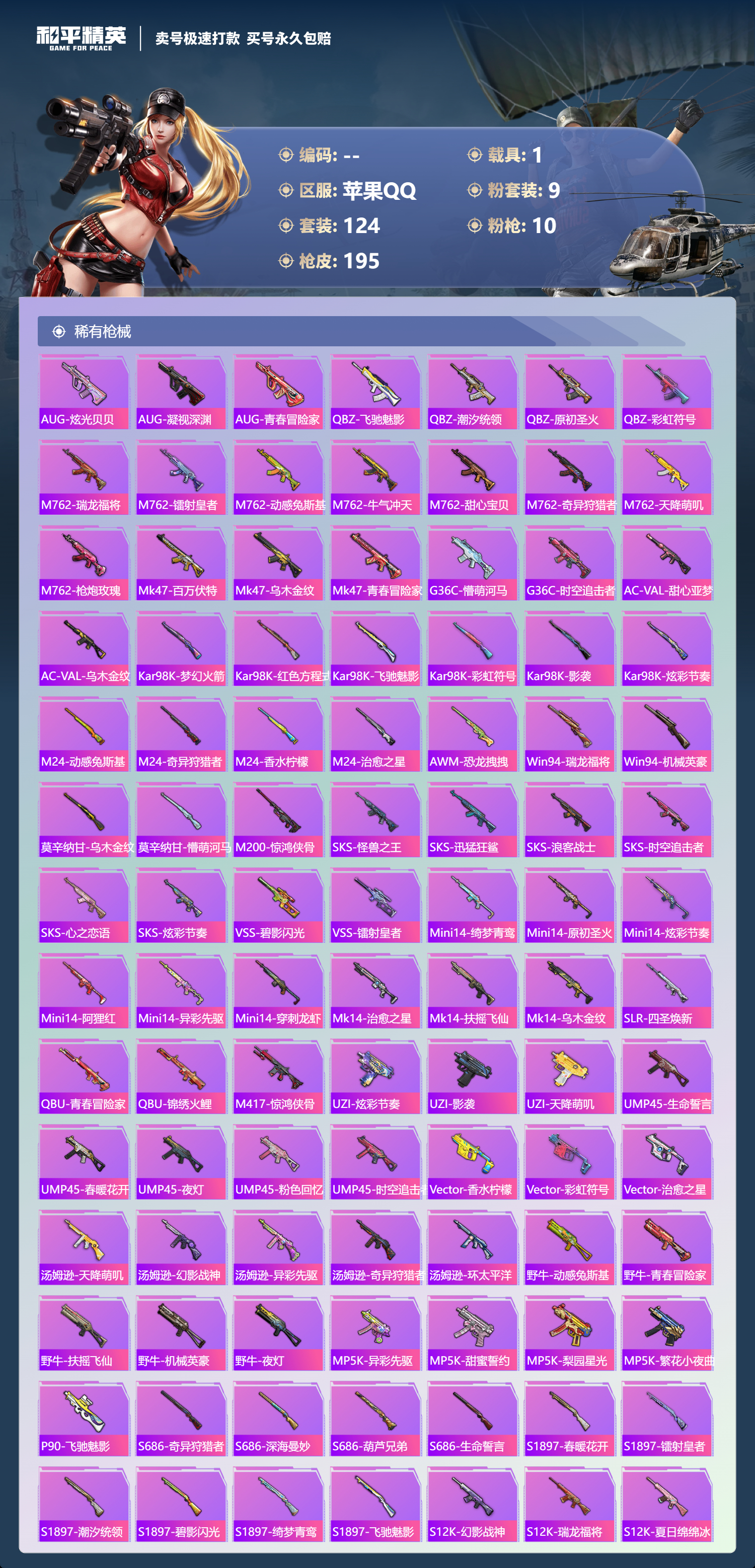 【10657389】【可二次】【苹果QQ】M762-甜蜜誓约 恐龙拽拽 UZI-绮梦青鸾 王牌四分卫 韶华初心 SKS心之恋语 SCARL扶摇飞仙 浪漫樱花 豚鼠丹丹 UMP45-恐龙拽拽 忍者信条 梦起落英 M762-奇异狩猎者 M416-心之恋语 深海小丑鱼 影双刃 馨动时刻 AKM-甜心宝贝 纯白誓言 AKM-奇异狩猎者 AKM-山经魅狐 M762-瑞龙福将 AKM-炫紫旋律 暗夜玫瑰 草