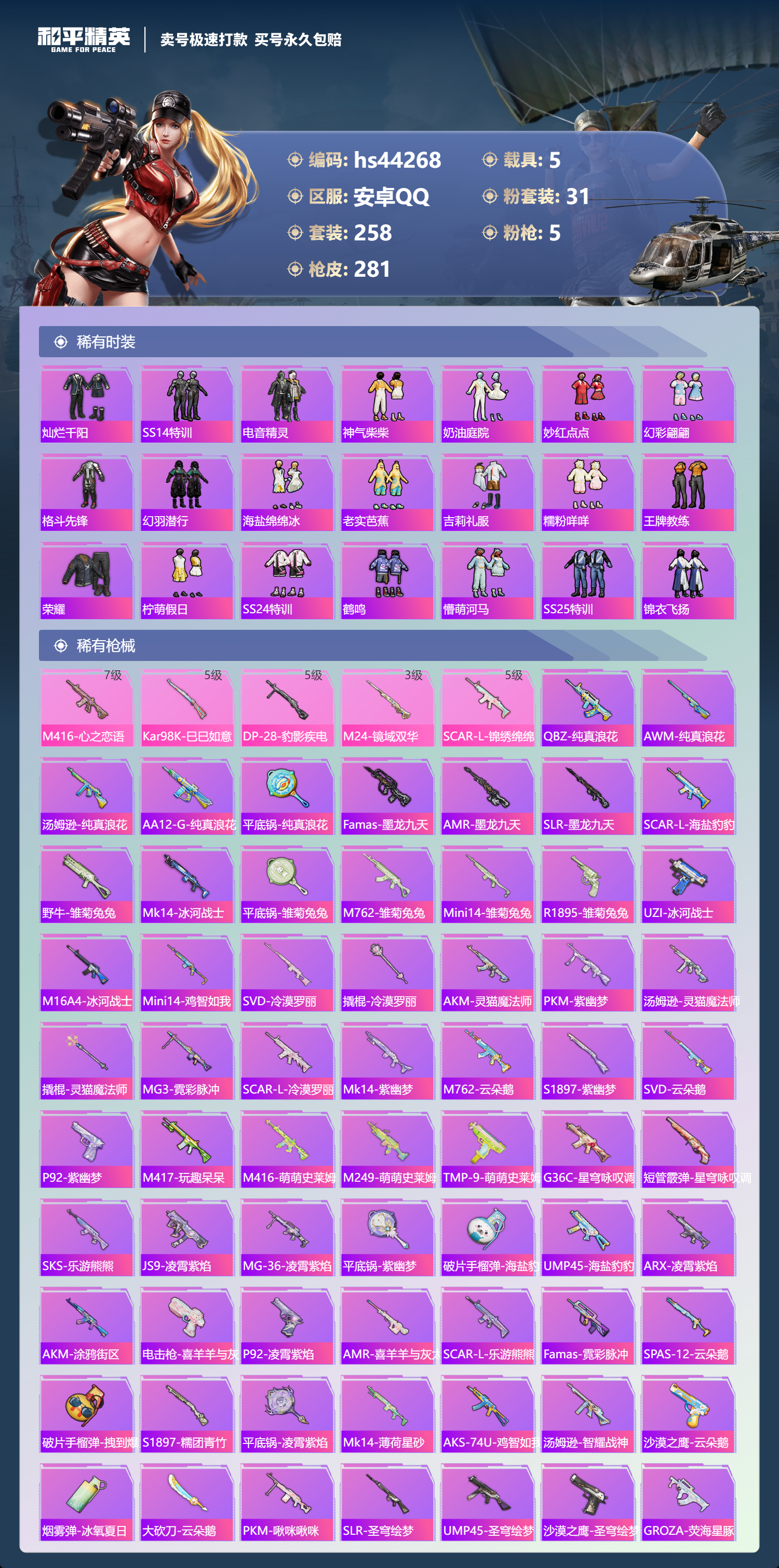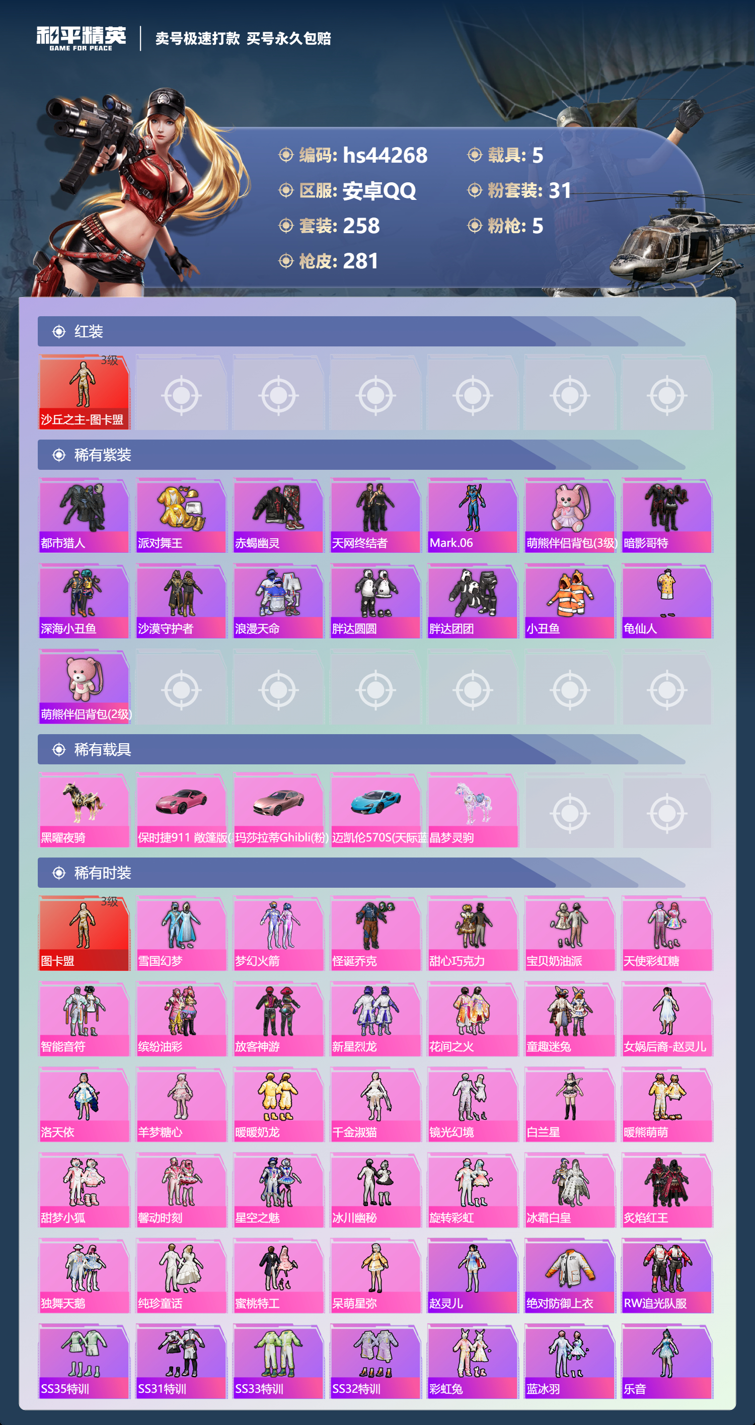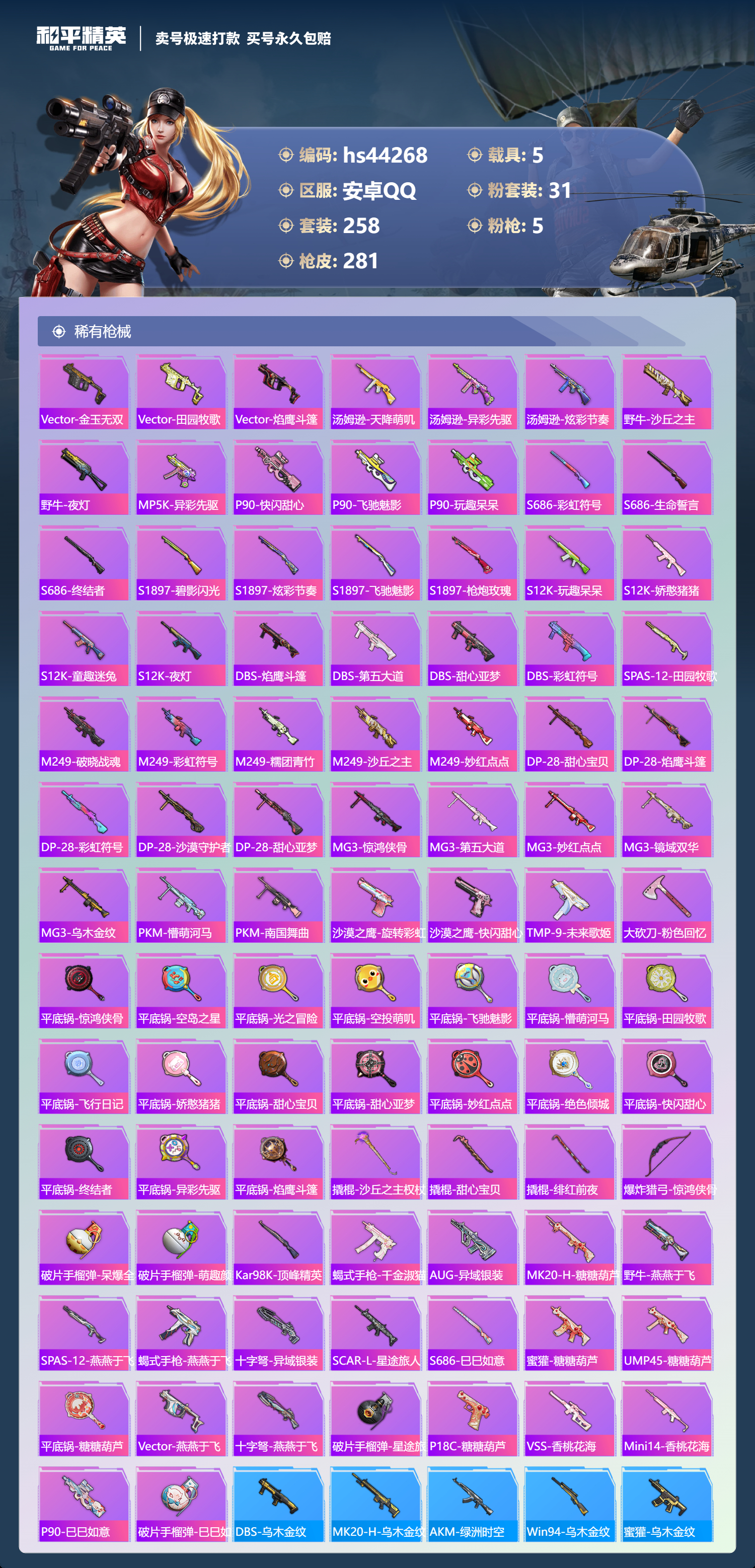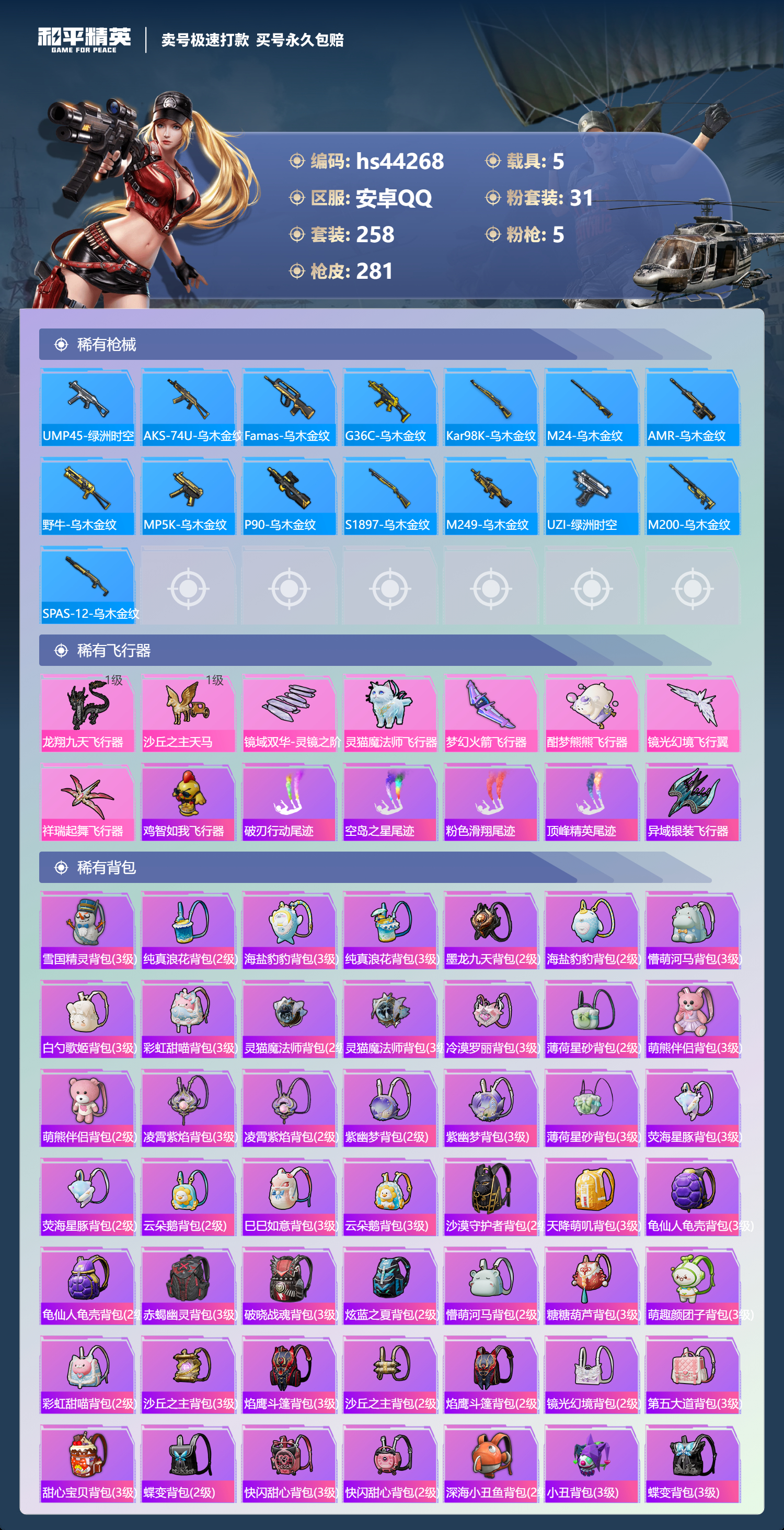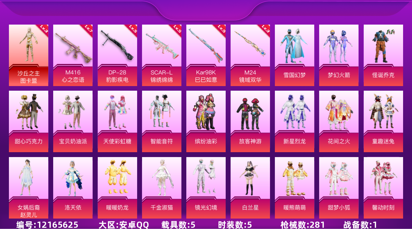 【10842716】【可二次】【安卓QQ】龟仙人 漫步者 花间之火 都市猎人 沙丘之主-图卡盟 星空之魅 M416-心之恋语 缤纷油彩 深海小丑鱼 馨动时刻 童趣迷兔 智能音符 镜光幻境飞行翼 AKM-奇异狩猎者 M24-镜域双华 怪诞乔克 潮萌小黄鸭 狂沙舞者 龙翔九天飞行器 SCAR-L-锦绣绵绵 雪国梦幻 新星烈龙 炙焰红王 M24-奇异狩猎者 洛天依 赤蝎幽灵 放客神游 巡查衣 激萌小黄