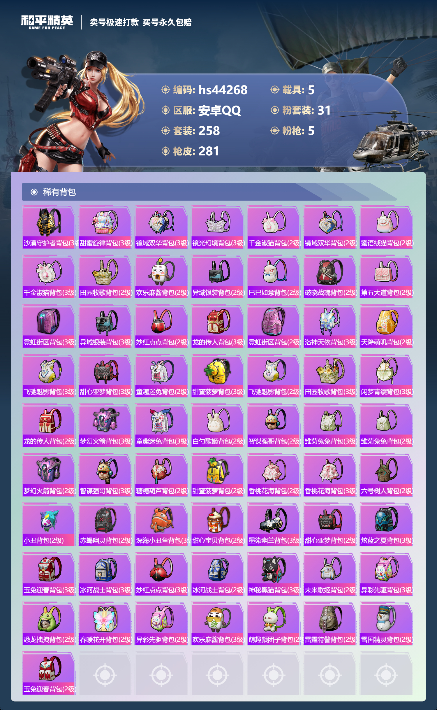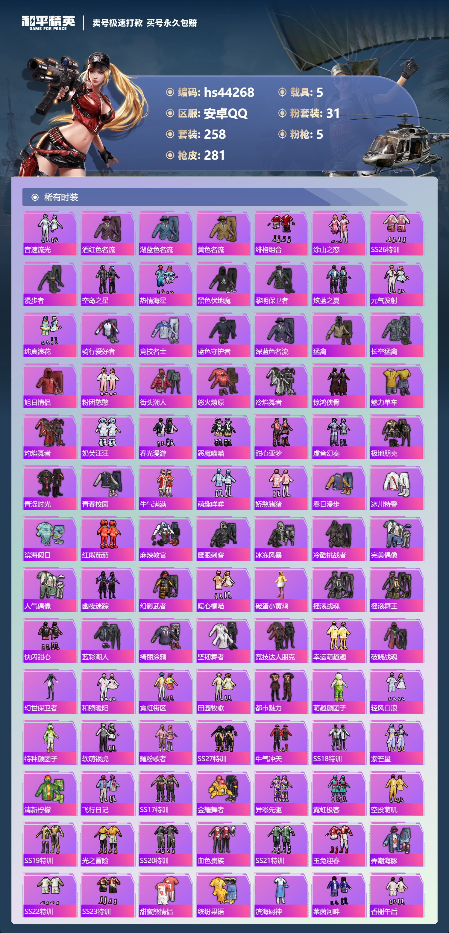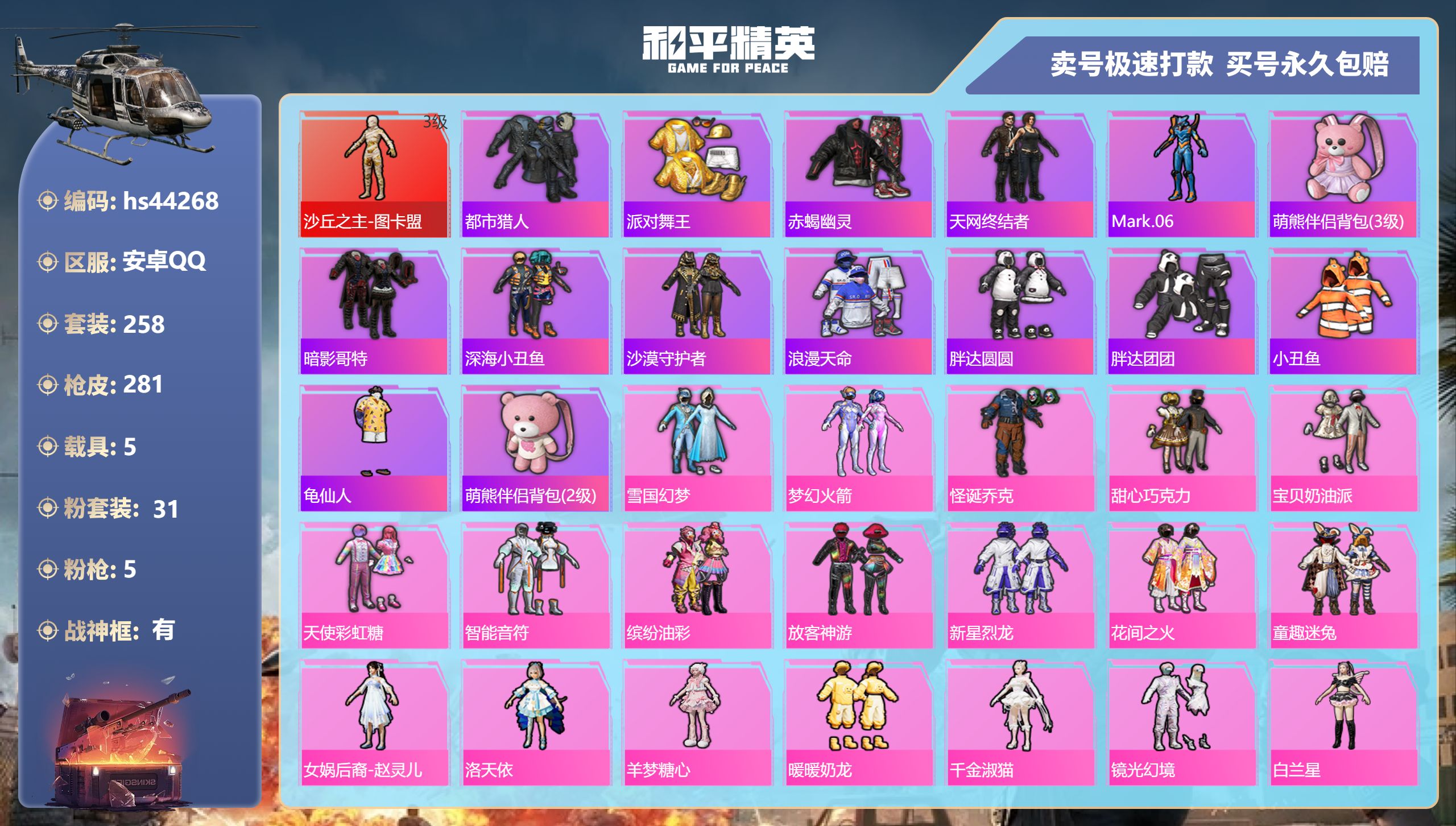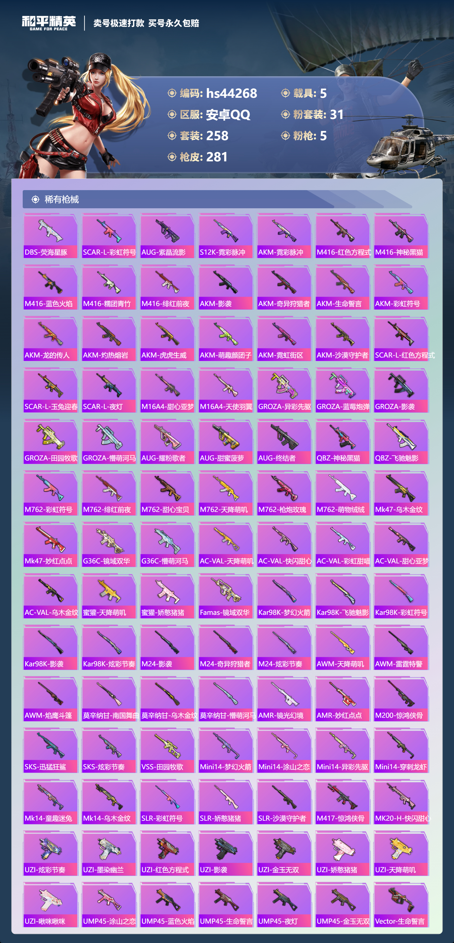 【10842716】【可二次】【安卓QQ】龟仙人 漫步者 花间之火 都市猎人 沙丘之主-图卡盟 星空之魅 M416-心之恋语 缤纷油彩 深海小丑鱼 馨动时刻 童趣迷兔 智能音符 镜光幻境飞行翼 AKM-奇异狩猎者 M24-镜域双华 怪诞乔克 潮萌小黄鸭 狂沙舞者 龙翔九天飞行器 SCAR-L-锦绣绵绵 雪国梦幻 新星烈龙 炙焰红王 M24-奇异狩猎者 洛天依 赤蝎幽灵 放客神游 巡查衣 激萌小黄