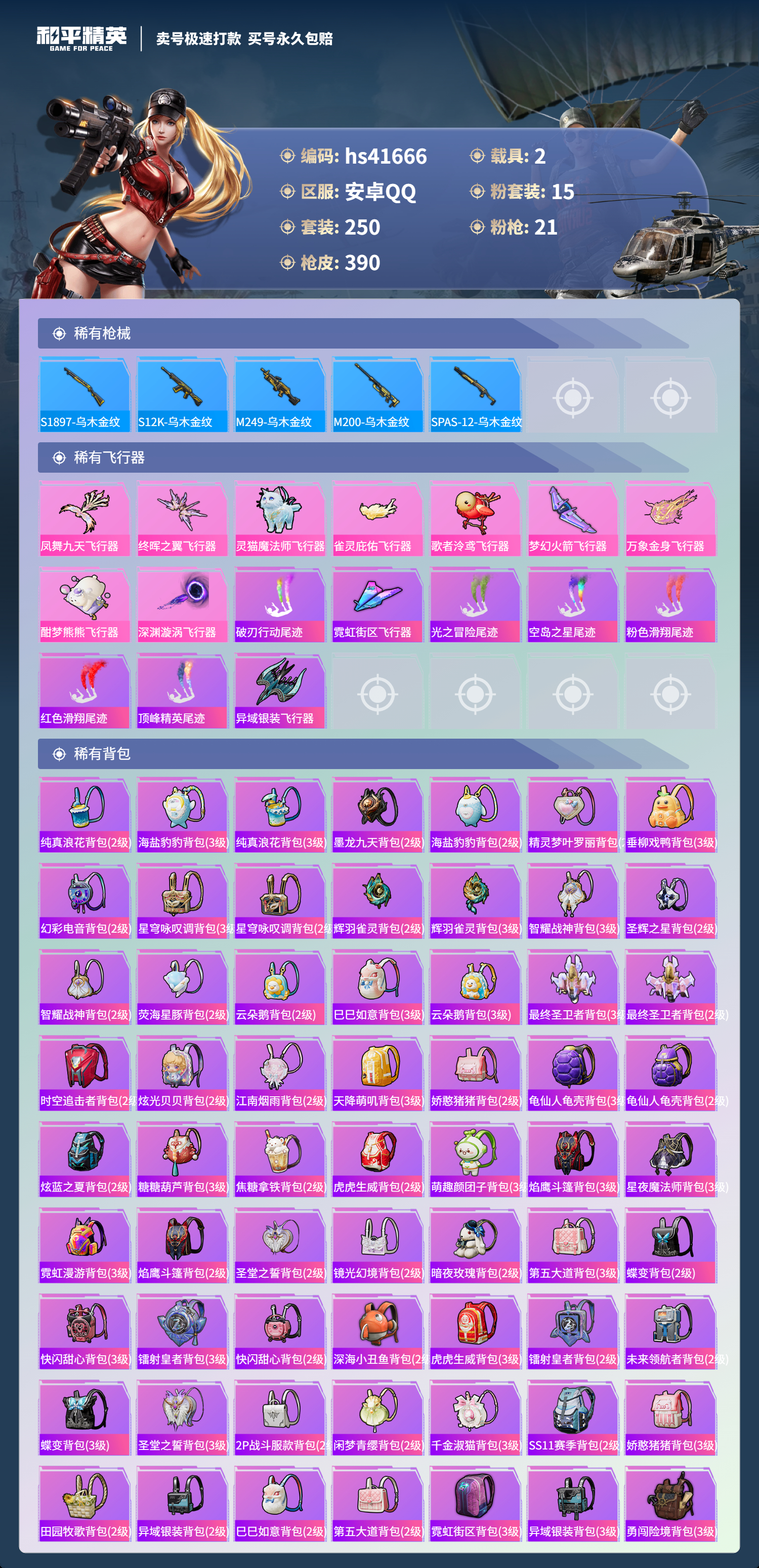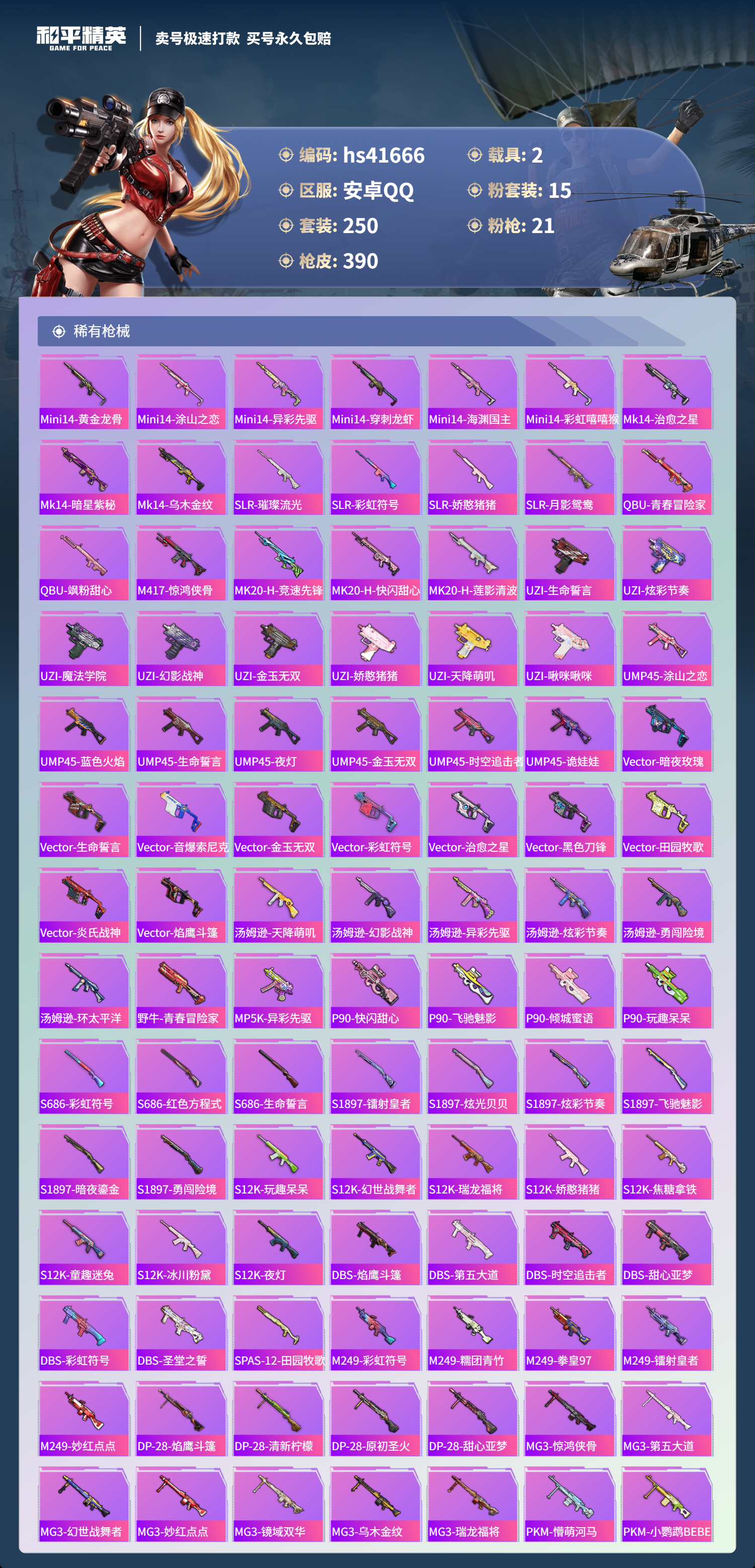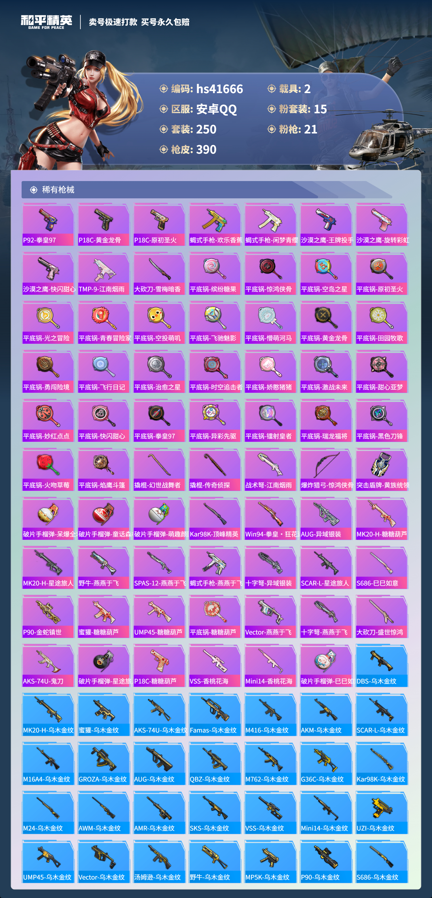 【10843732】【不可二次】【安卓QQ】龟仙人 焦糖拿铁 AKM-星际浪客 炙焰红王 MG3-炙焰牛王 梦起落英 沙丘之主-图卡盟 巡查衣 M416-至情至圣 UMP45-量子极限 M416-心之恋语 M24-香水柠檬 瑞龙福将 GROZA-焦糖拿铁 抹茶蜜豆 浪漫天命 梦幻火箭飞行器 团圆交子 AKM-奇异狩猎者 SS1特训 暗夜契约 M762-瑞龙福将 AUG-超新星 狂沙舞者 音爆索尼