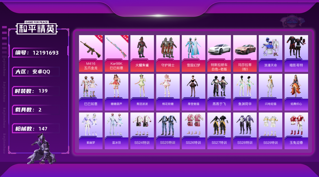 【10848946】【可二次】【安卓QQ】火耀朱雀 雪国梦幻 M416-五爪金龙 守护骑士 特斯拉3银色 玛莎拉蒂粉色