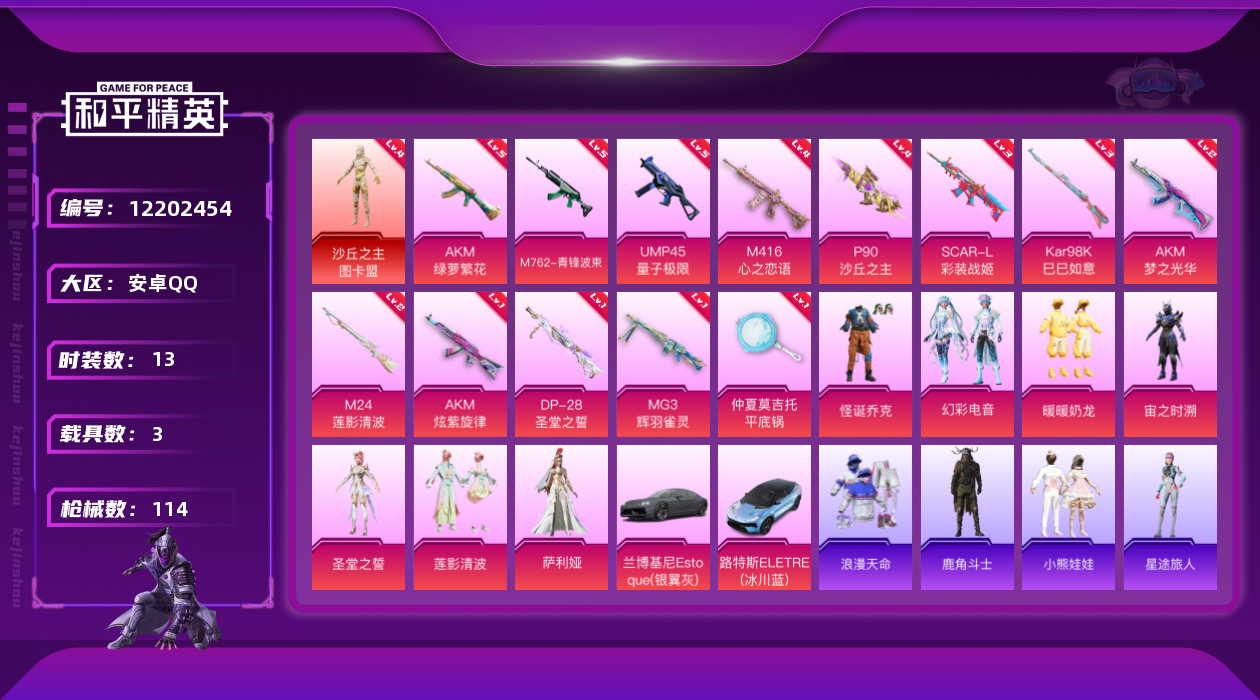 【10851318】【可二次】【安卓QQ】龟仙人 AKM-绿萝繁花 M24-莲影清波 M762-青锋波束 P90-沙丘之主 怪诞乔克 DP-28-圣堂之誓 兰博轿车灰色 平底锅-仲夏莫吉托 萌酷奶龙飞行器 沙丘之主-图卡盟 AKM-炫紫旋律 SCAR-L-彩装战姬 UMP45-量子极限 AKM-梦之光华 M416-心之恋语 浪漫天命 路特斯EL蓝色