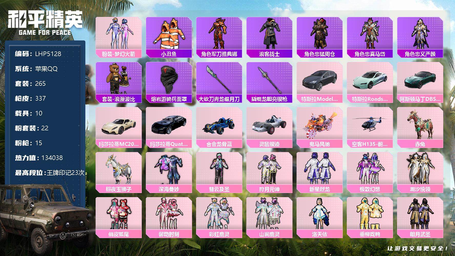 【特价急出/详情看图】:苹果 手Q-22粉装-15特效枪-10载具-134038热力值-23印记-265套装-337枪皮【热门品类 【热门品类】:粉装-梦幻火箭,套装-小丑鱼,角色-军刀雅典娜,套装-浪客战士,角色-忠猛周仓,角色-忠真马岱,角色-忠义严颜,套装-浪漫波比,熔岩游骑兵面罩,大砍刀-青龙偃月刀,撬棍-龙胆亮银枪