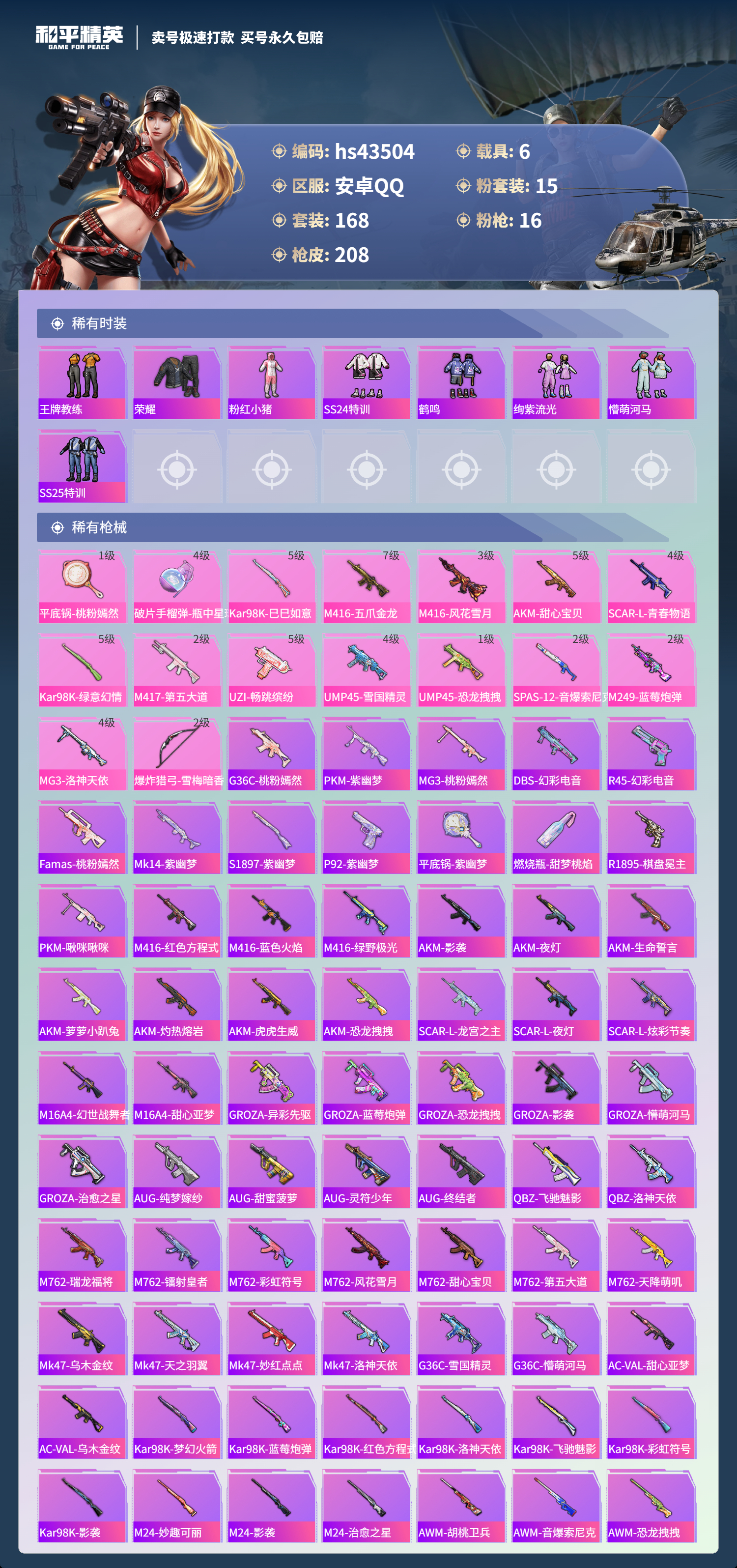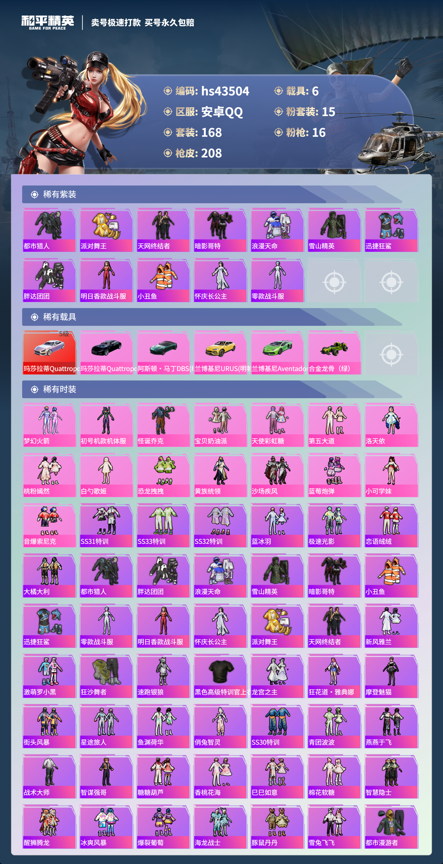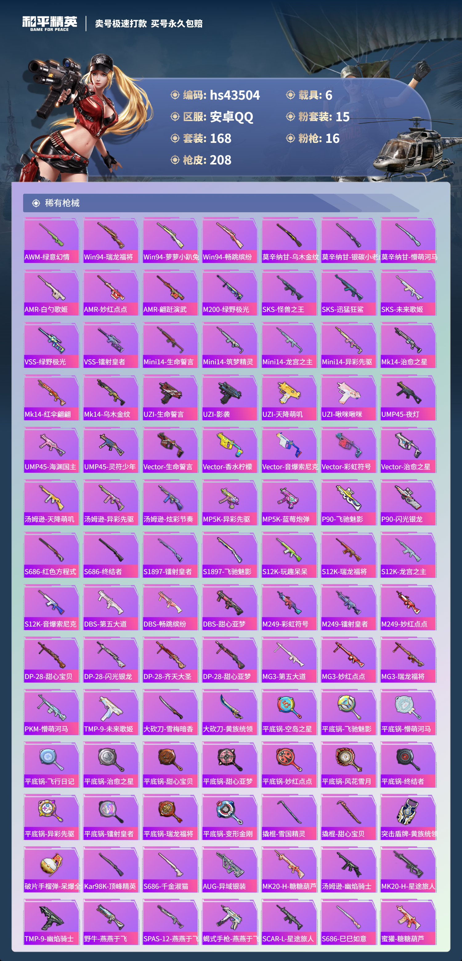 【10871841】【不可二次】【安卓QQ】Kar98K-绿意幻情 恐龙拽拽 漫步者 都市猎人 阿斯顿马丁S绿色 UMP45-恐龙拽拽 豚鼠丹丹 醒狮腾龙 AKM-甜心宝贝 兰博SVJ绿色 怪诞乔克 迅捷狂鲨 M762-瑞龙福将 M417射手步枪 狂沙舞者 音爆索尼克 兰博SUV黄色 M762-风花雪月 M249-蓝莓炮弹 神秘黑猫 M417-第五大道 爆炸猎弓 蓝莓炮弹 M416-五爪金龙 S