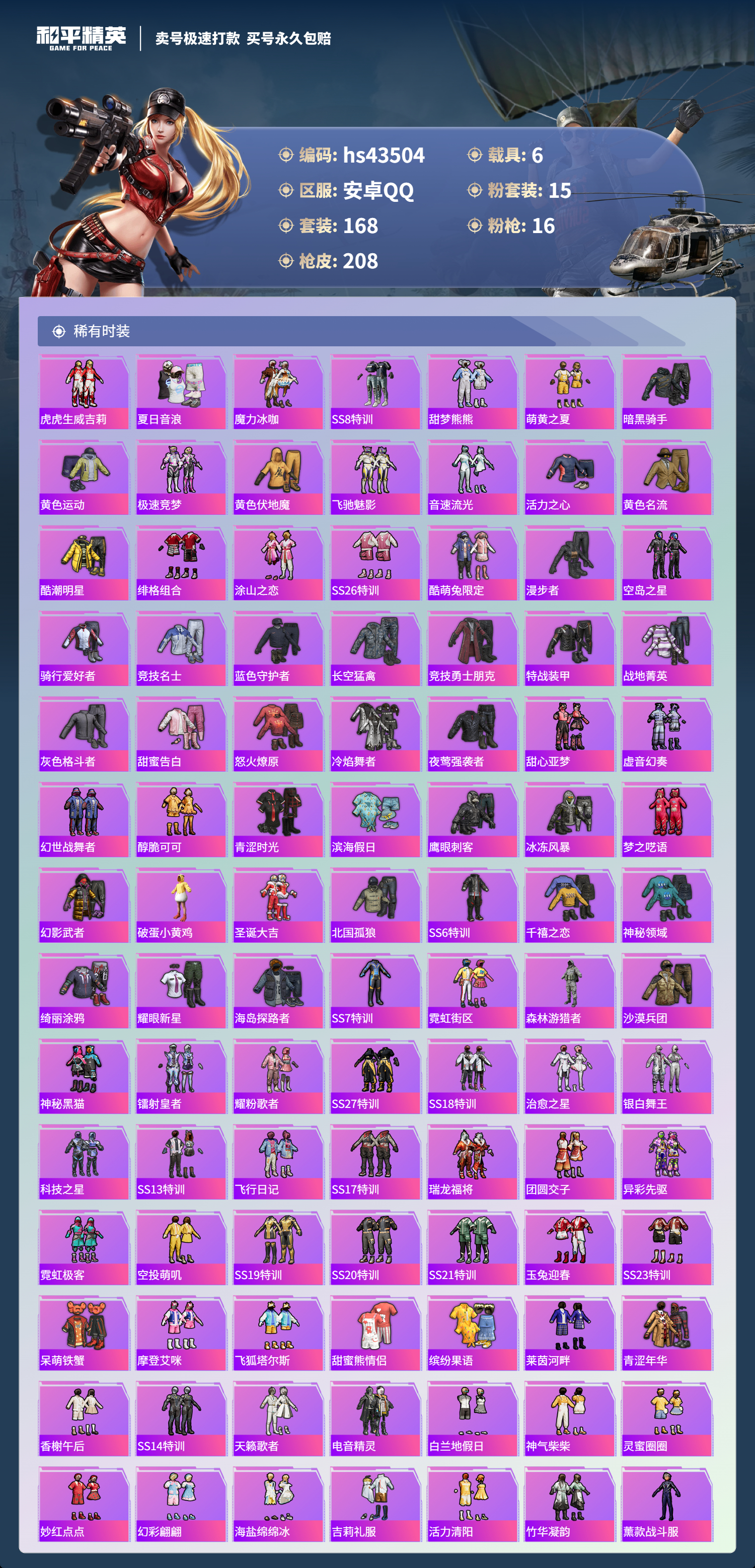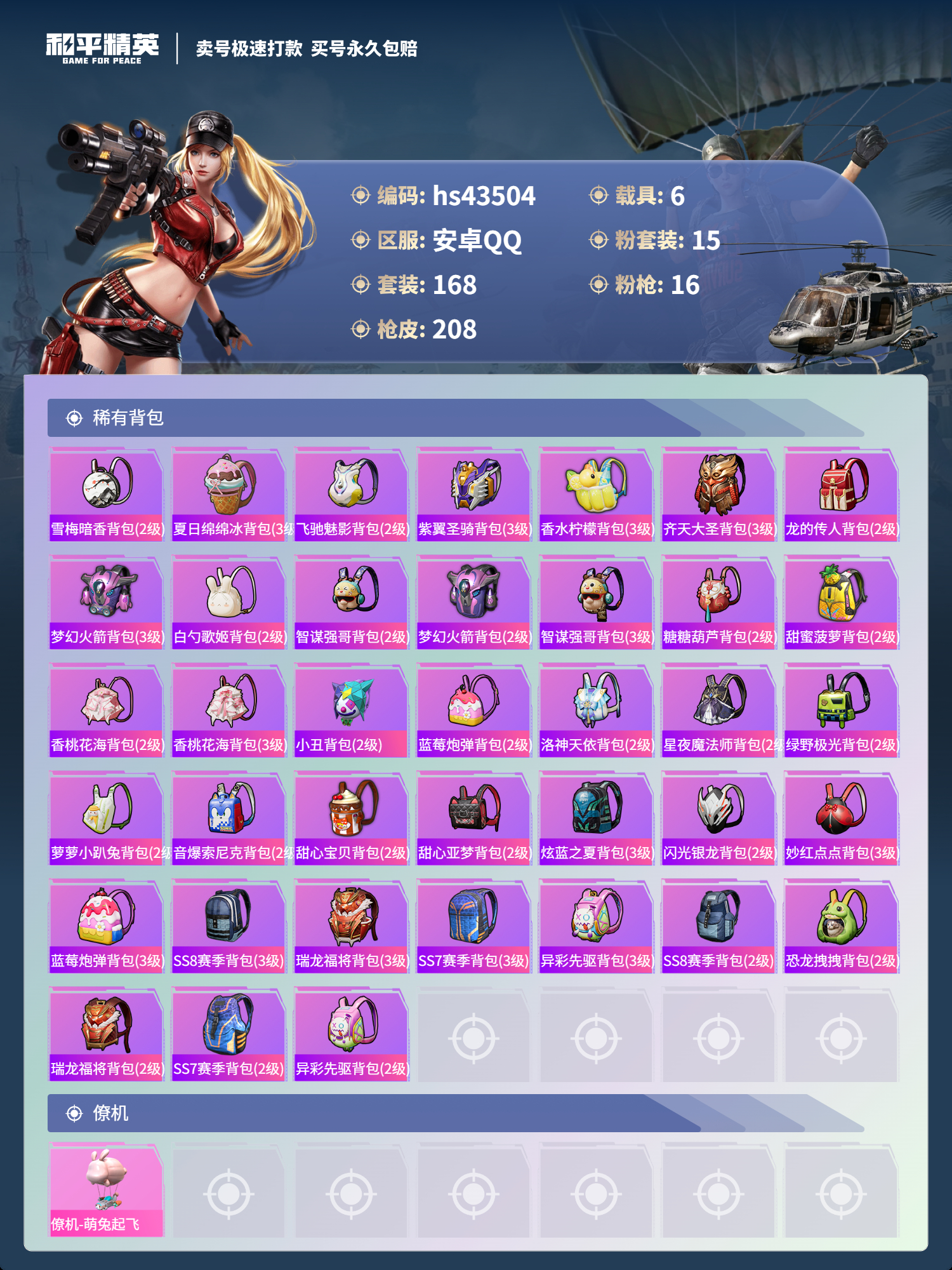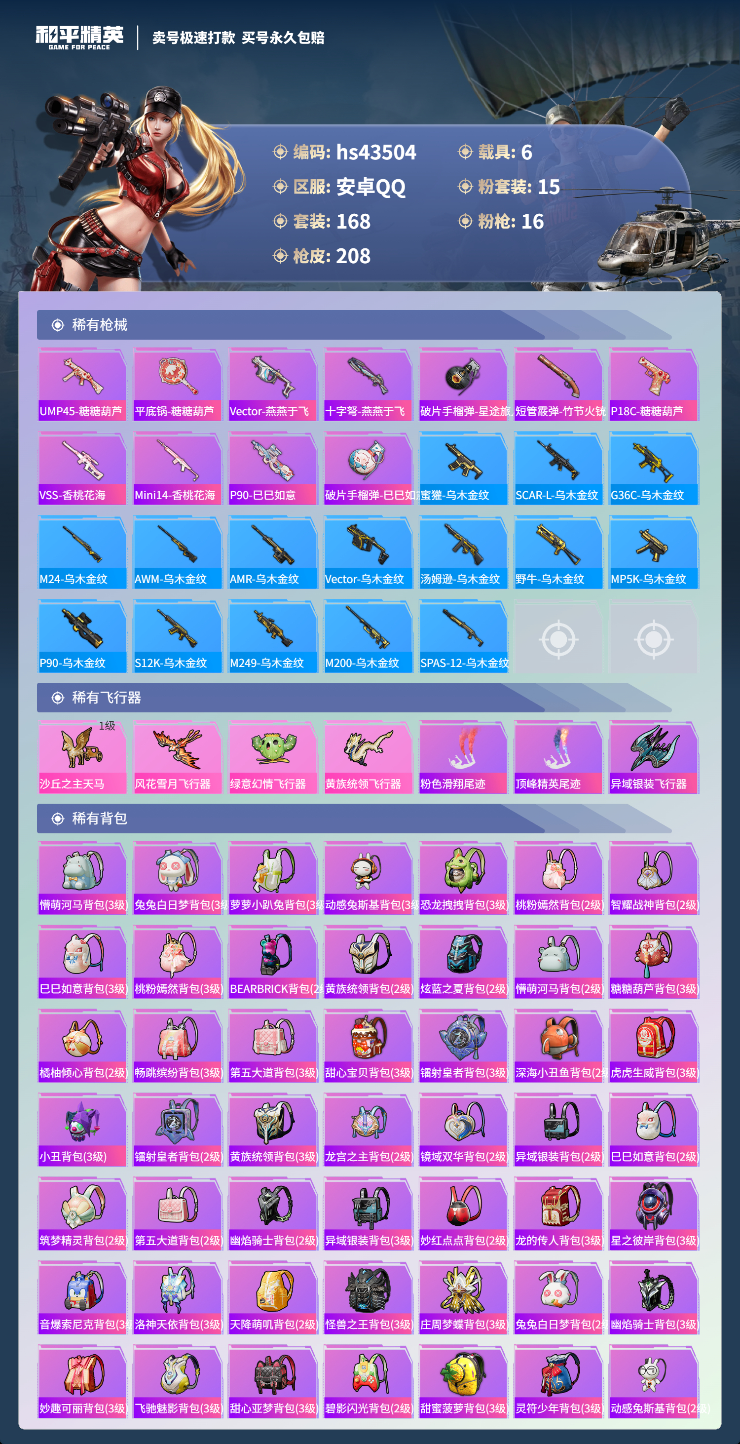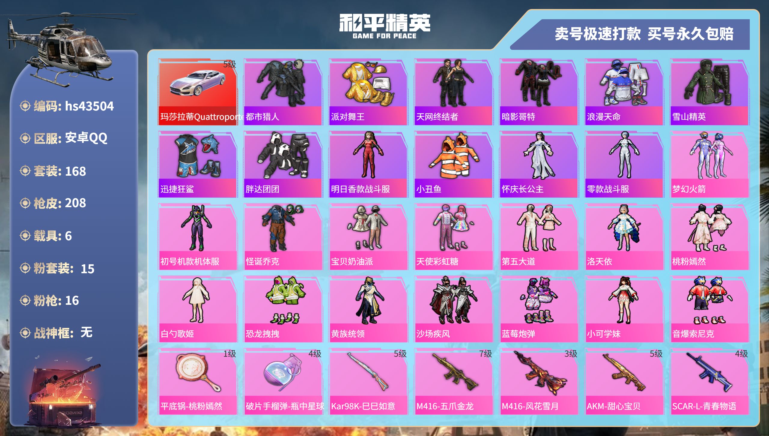 【10871841】【不可二次】【安卓QQ】Kar98K-绿意幻情 恐龙拽拽 漫步者 都市猎人 阿斯顿马丁S绿色 UMP45-恐龙拽拽 豚鼠丹丹 醒狮腾龙 AKM-甜心宝贝 兰博SVJ绿色 怪诞乔克 迅捷狂鲨 M762-瑞龙福将 M417射手步枪 狂沙舞者 音爆索尼克 兰博SUV黄色 M762-风花雪月 M249-蓝莓炮弹 神秘黑猫 M417-第五大道 爆炸猎弓 蓝莓炮弹 M416-五爪金龙 S