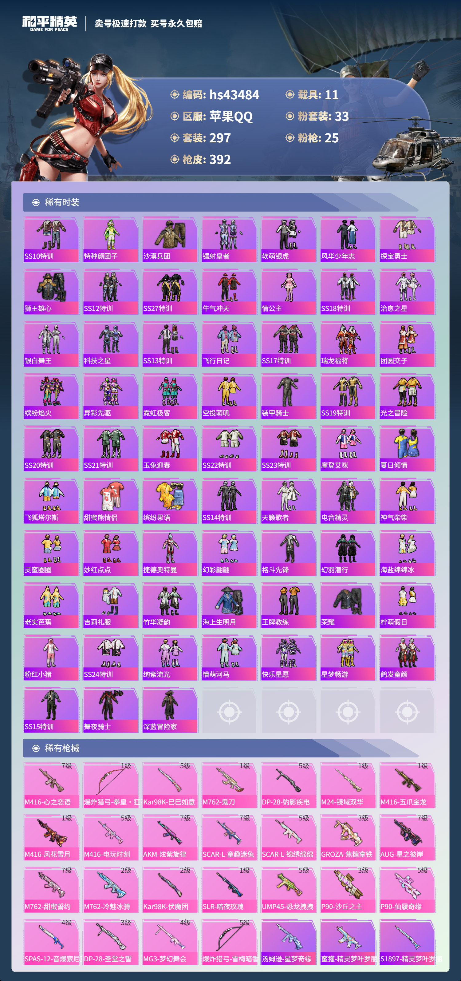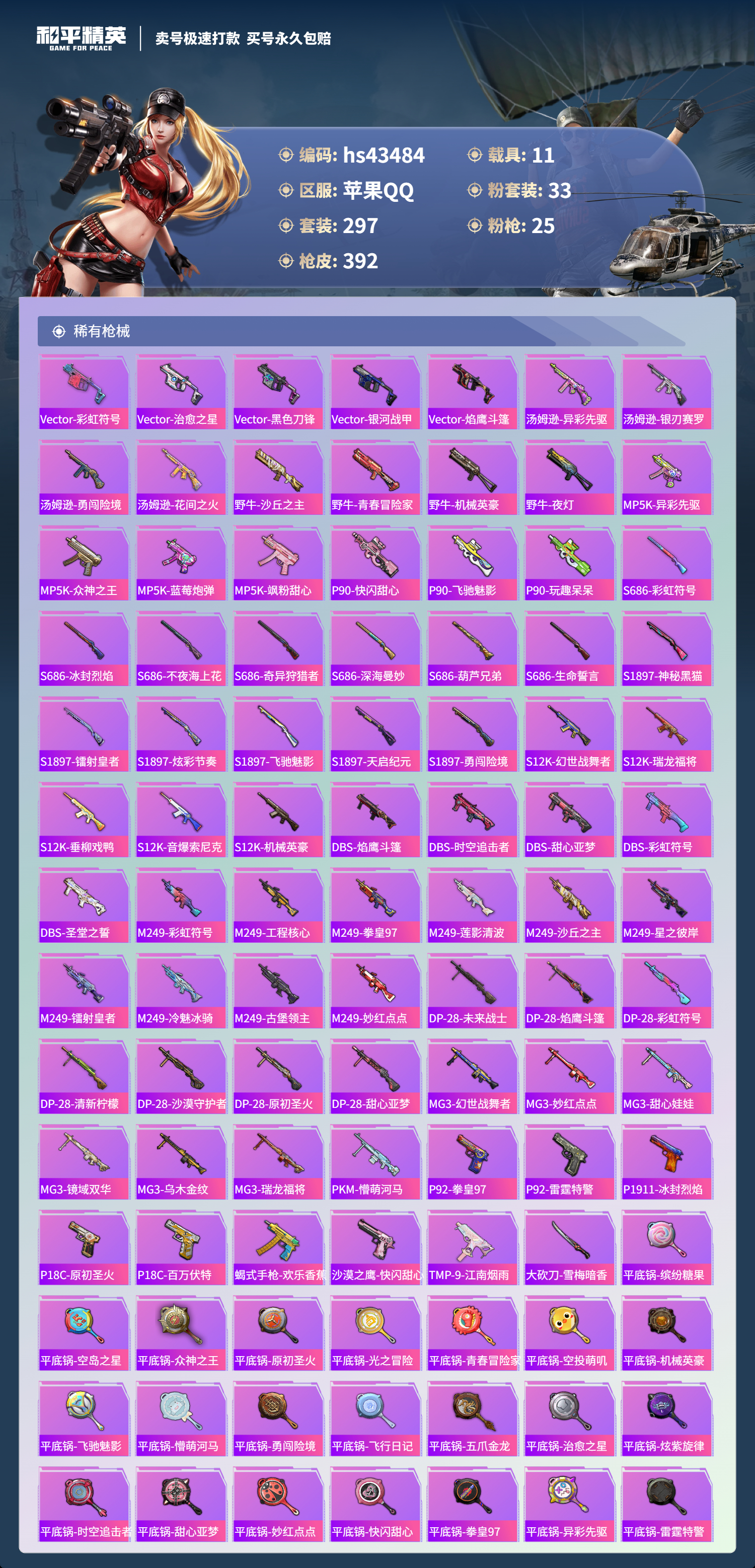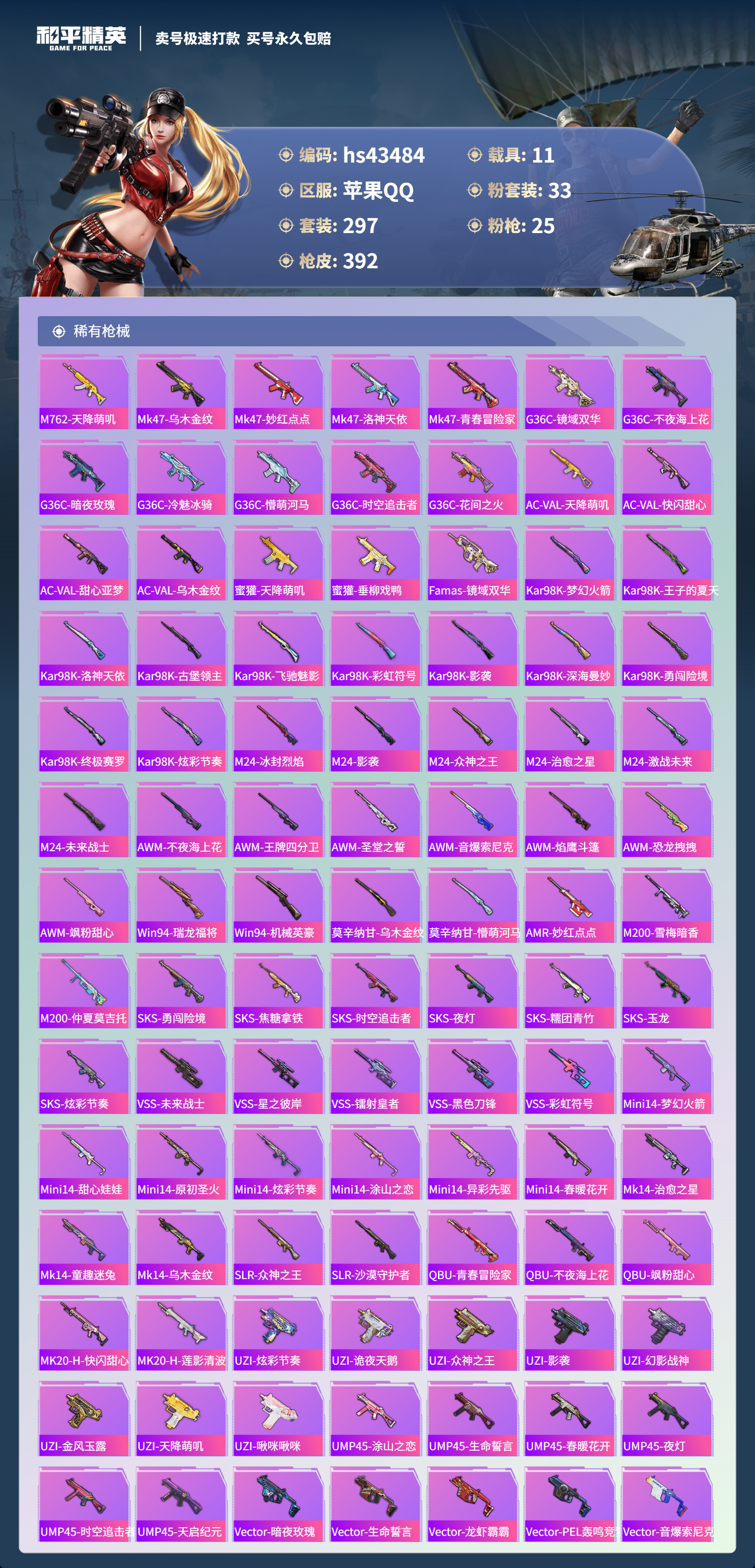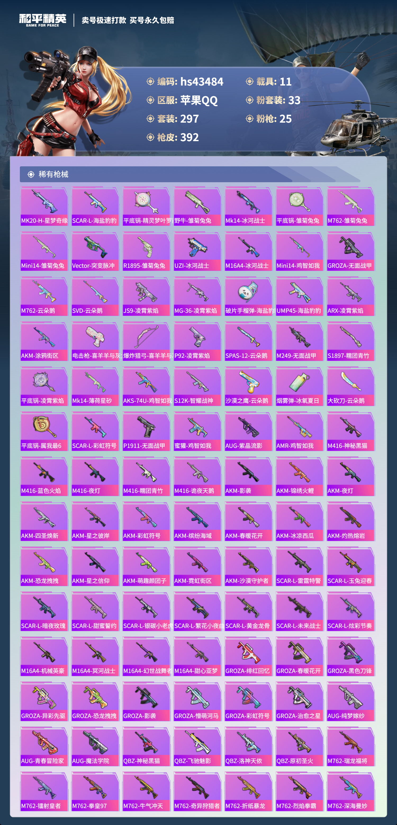 【10871848】【不可二次】【苹果QQ】M762-甜蜜誓约 水银刺客 迈凯伦570S 炫冰蓝 漫步者 金属狂野 SCAR-童趣迷兔 桀骜红莲 AUG-星之彼岸 Kar98K-伏魔团 紫电风暴 M24-镜域双华 迅捷狂鲨 狂沙舞者 玛莎拉蒂蓝色 爆炸猎弓 木曜青龙 P90-仙履奇缘 P90-沙丘之主 SPAS-12-音爆索尼克 新星烈龙 机械英豪 极速红龙 M416-电玩时刻 软嫩糖心蛋 激萌
