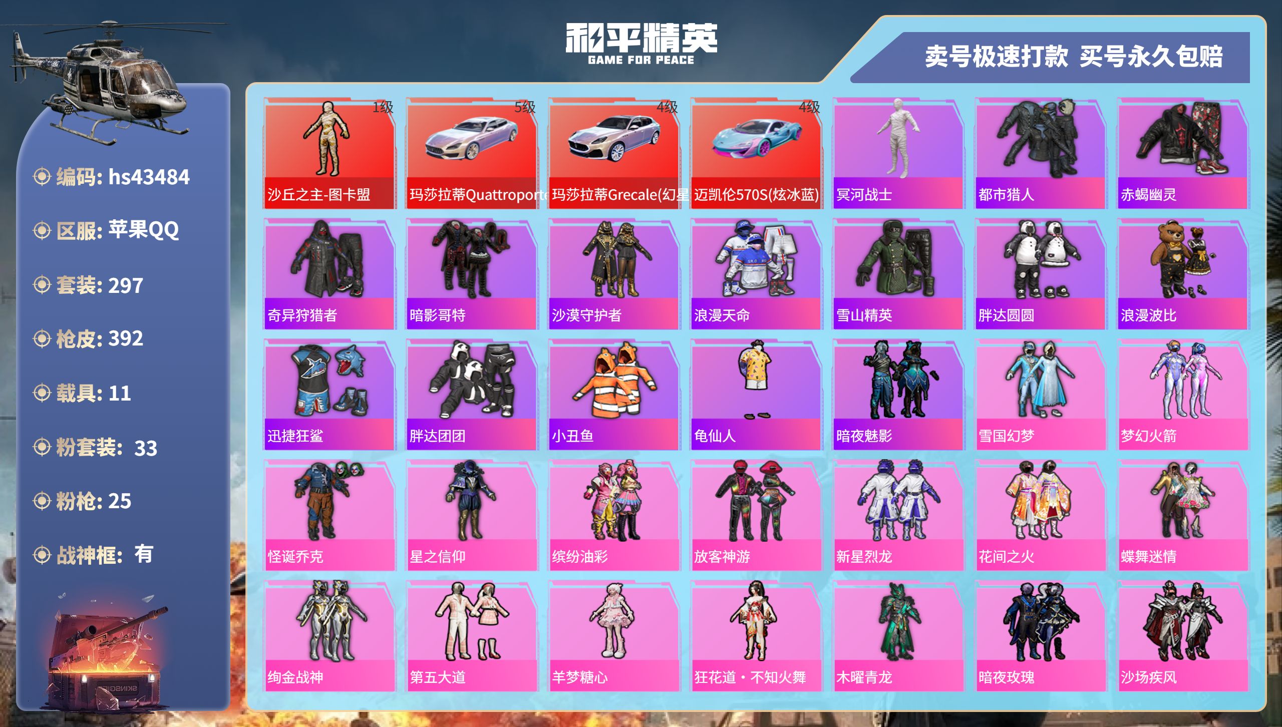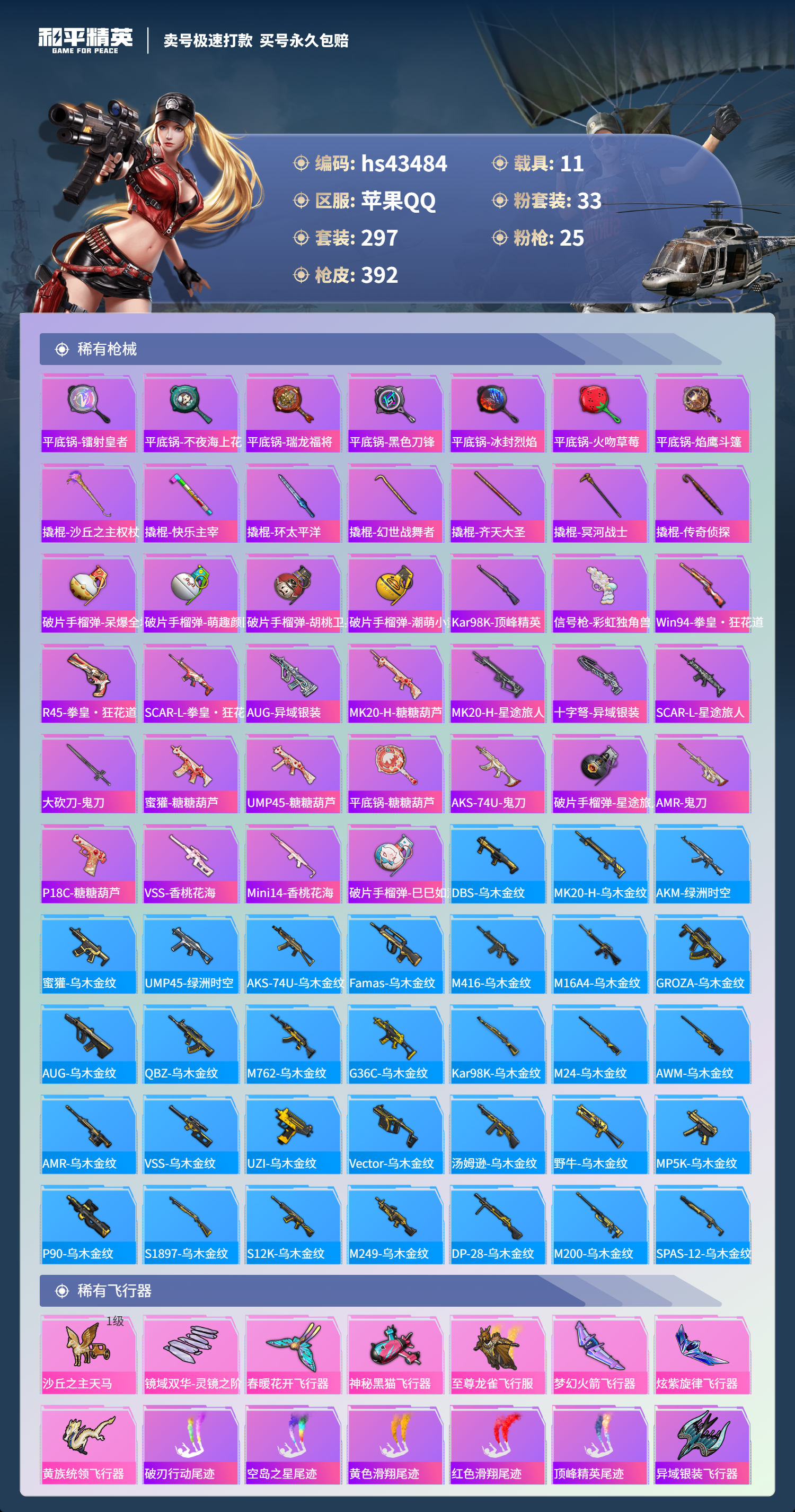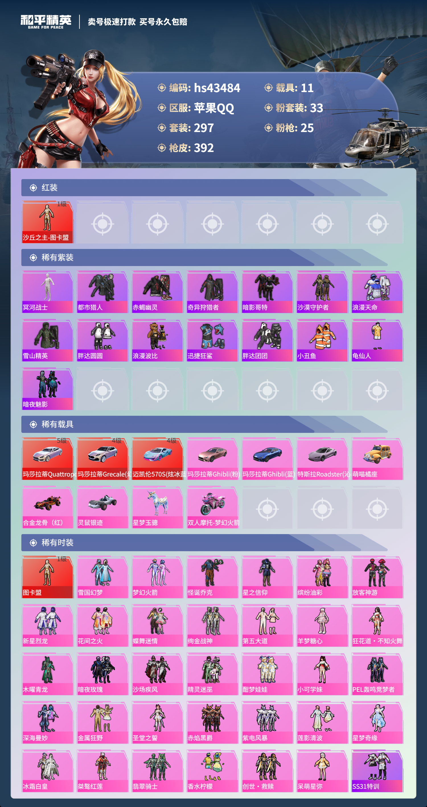 【10871848】【不可二次】【苹果QQ】M762-甜蜜誓约 水银刺客 迈凯伦570S 炫冰蓝 漫步者 金属狂野 SCAR-童趣迷兔 桀骜红莲 AUG-星之彼岸 Kar98K-伏魔团 紫电风暴 M24-镜域双华 迅捷狂鲨 狂沙舞者 玛莎拉蒂蓝色 爆炸猎弓 木曜青龙 P90-仙履奇缘 P90-沙丘之主 SPAS-12-音爆索尼克 新星烈龙 机械英豪 极速红龙 M416-电玩时刻 软嫩糖心蛋 激萌